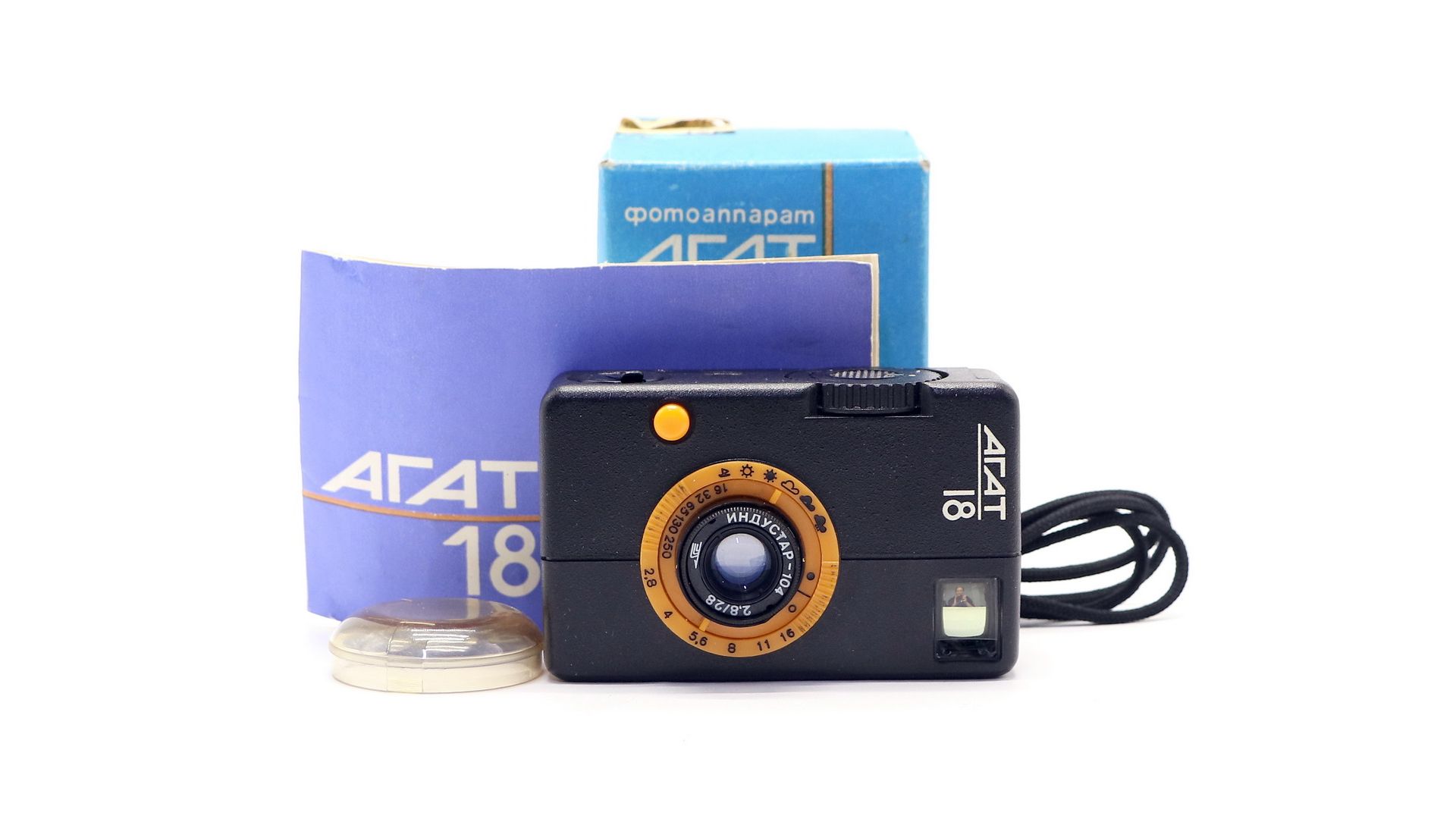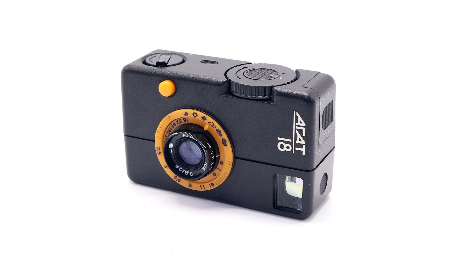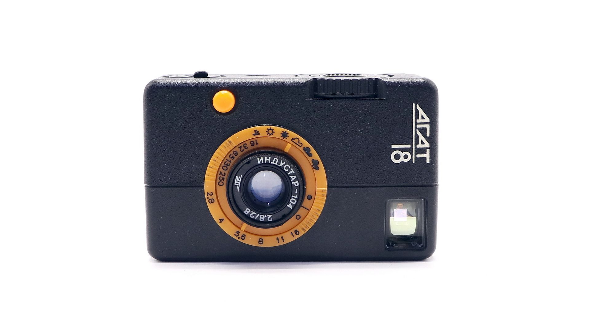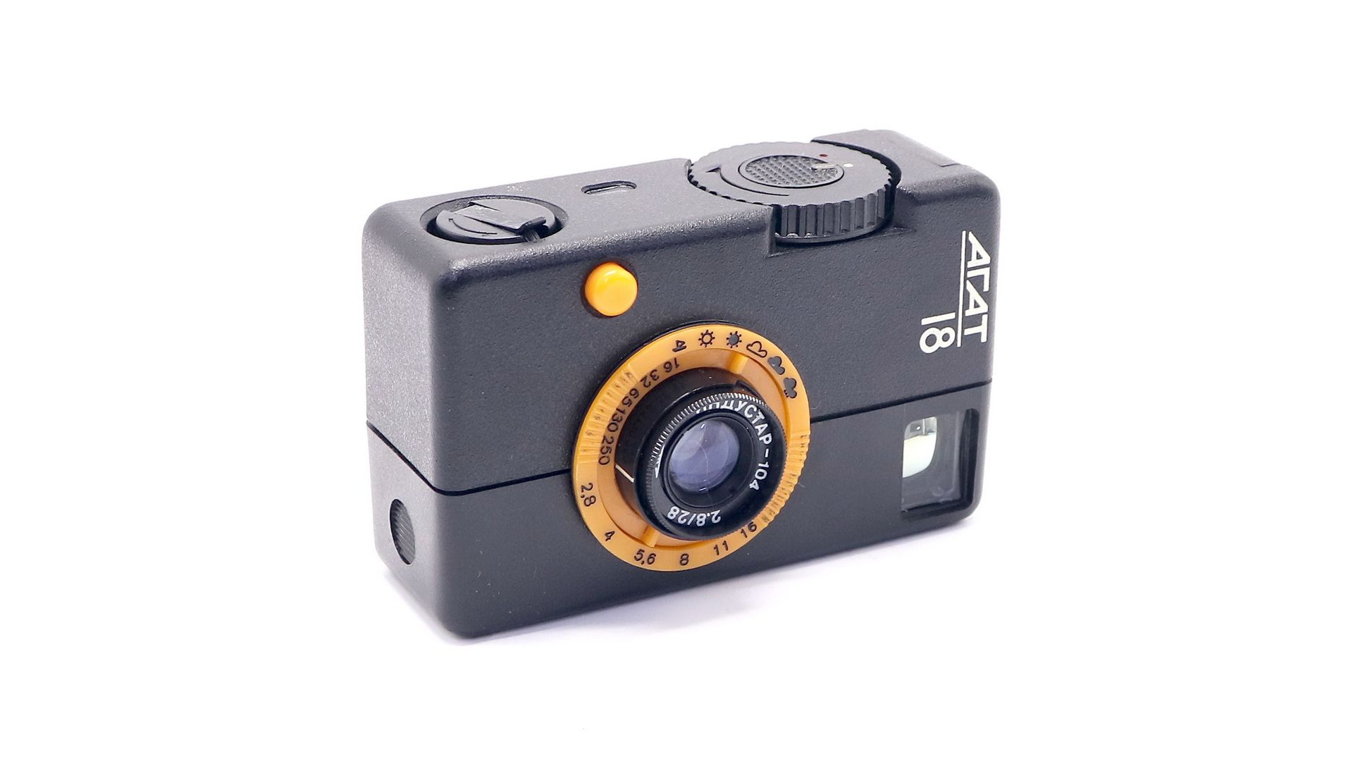 Агат-18 - настоящая камера шпиона, он настолько маленький, что способен поместиться абсолютно в любой карман. Звук спускаемого затвора почти невозможно отличить от хруста в колене или в спине – это позволит вам не пугая фотографировать прохожих или котов. Экспозиция (сочетает выдержку с диафрагмой) устанавливается по 7 символам погоды – начиная с яркого солнца и заканчивая съемкой в помещении. Пределы фокусировки от 0,9м до бесконечности.