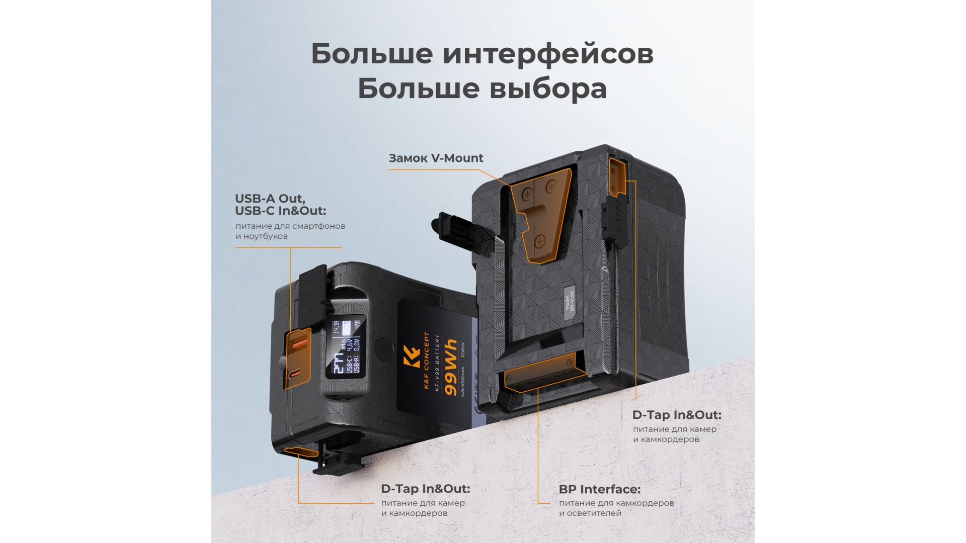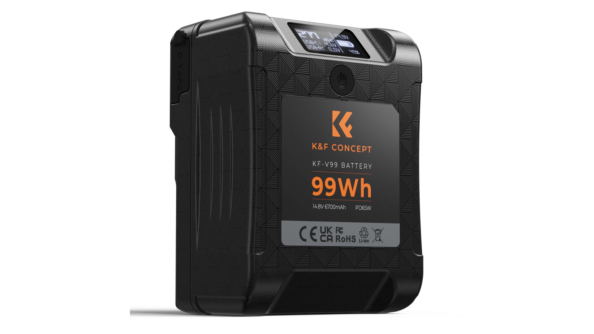 Аккумулятор V-mount имеет ёмкость 99 Втч, что обеспечивает длительное время автономной работы. Корпус оснащен светодиодным дисплеем, который позволяет проверить состояние батареи, например, оставшееся время, процент оставшегося заряда, индикацию напряжения и рабочее состояние портов USB-A и USB-C.