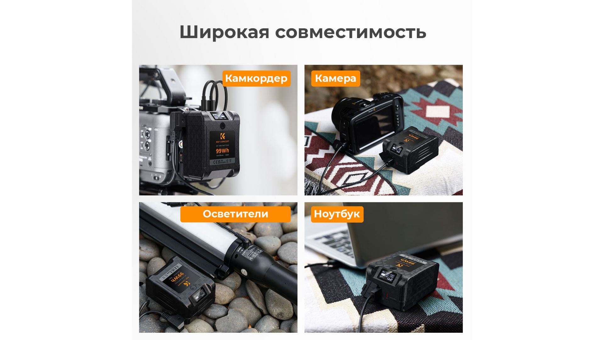 BP-VL99 оснащен несколькими портами, включая Type-C (65 Вт), USB и D-TAP, что делает его более универсальным и позволяет одновременно питать несколько устройств. Подходит не только для съёмочного оборудования, но и для мониторов, смартфонов, беспроводных видеопередатчиков, планшетов и ноутбуков.
