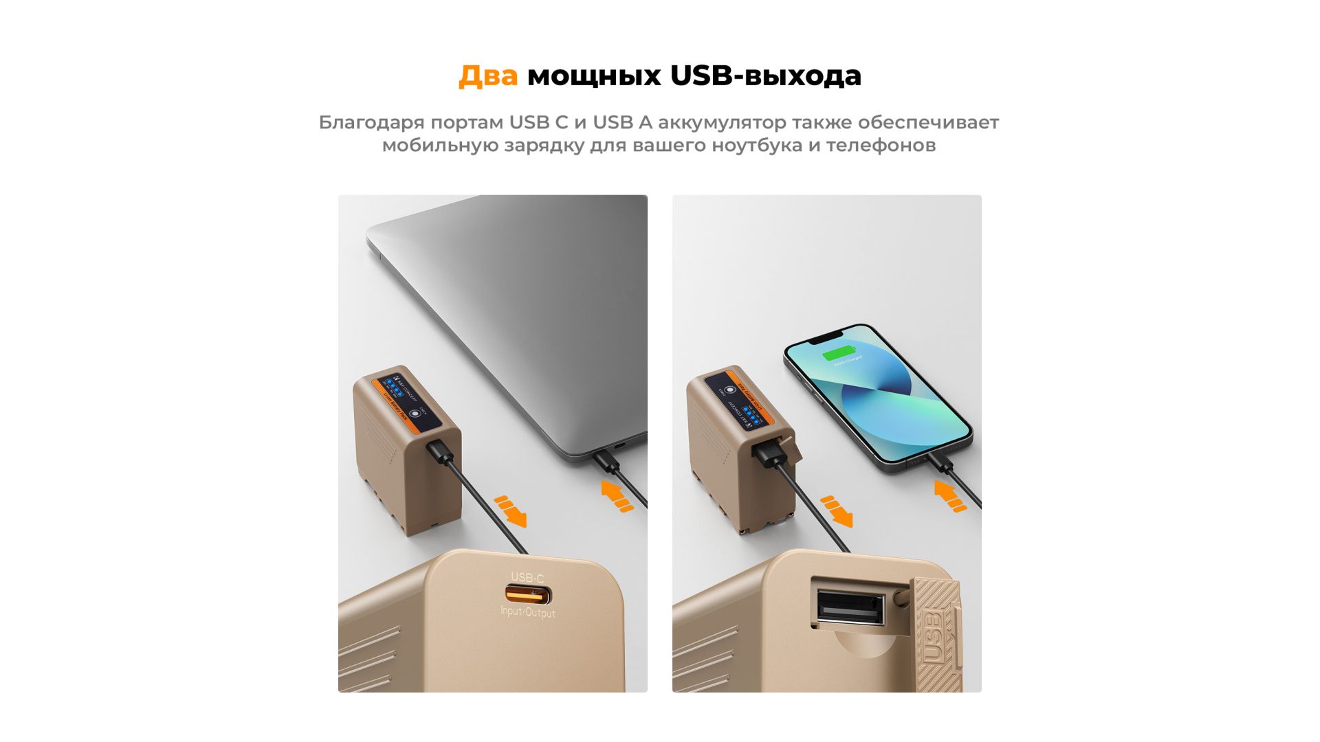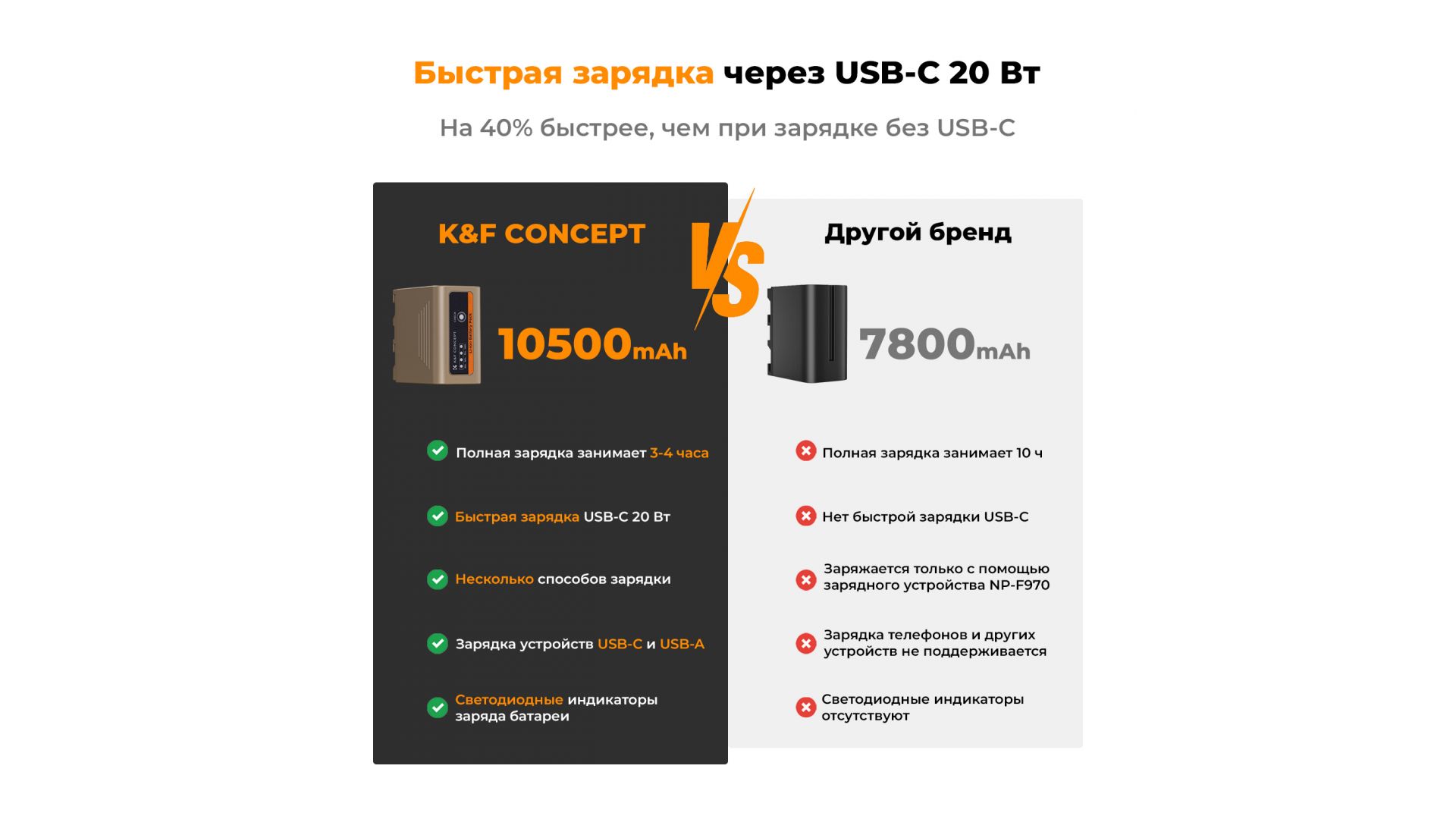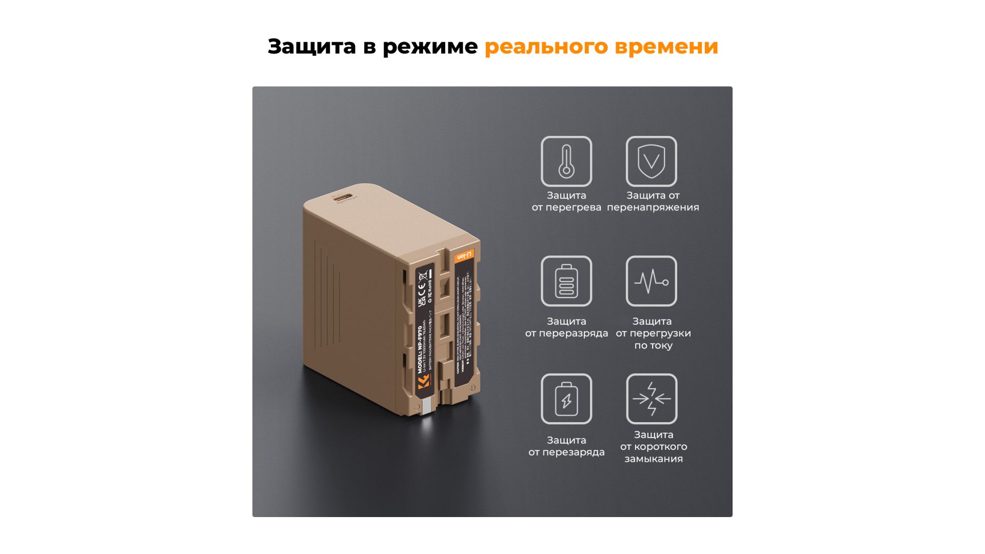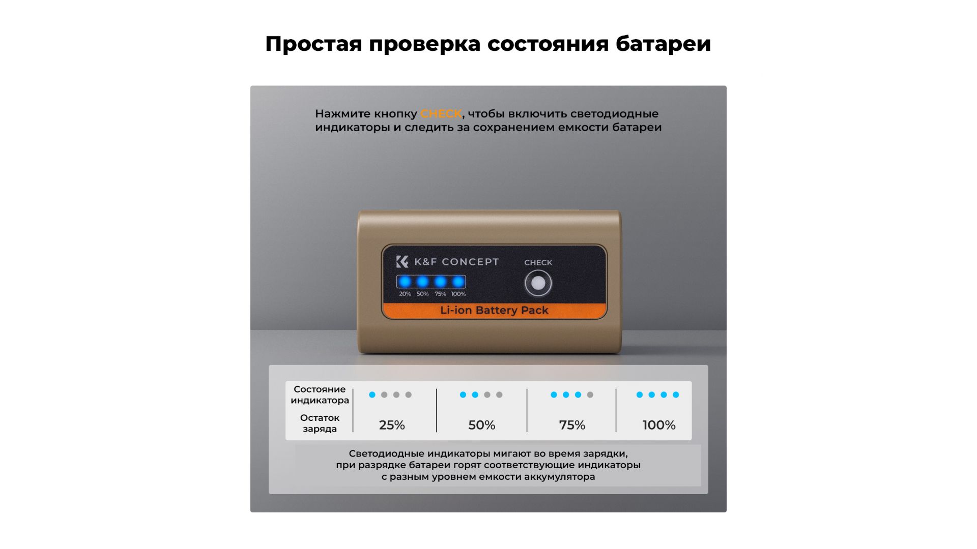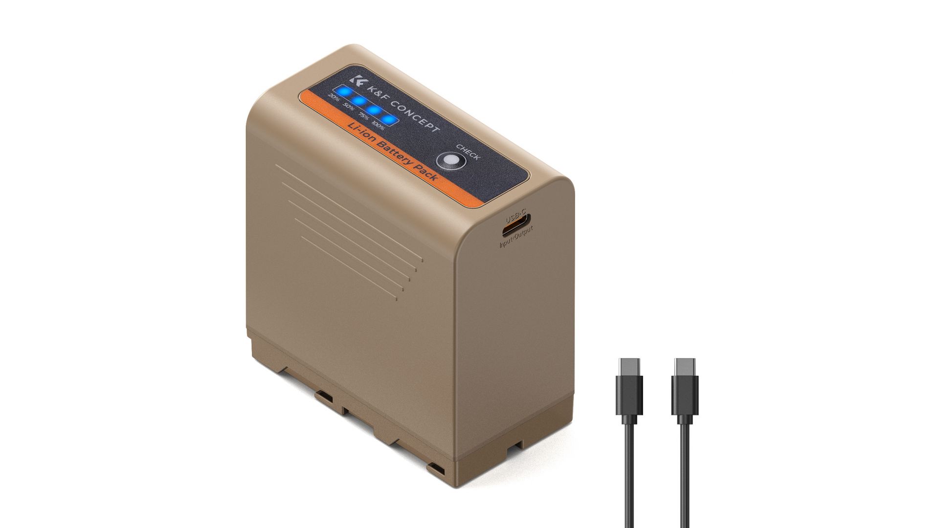 Аккумулятор NP-F970 KF28.0036 оснащен портом зарядки USB Type-C (PD3.0/20 Вт), полная зарядка которого занимает 4,8 часа, что сокращает время зарядки на 40% по сравнению с обычной зарядкой. Уровень заряда батареи составляет 25%, 50%, 75% и 100% соответственно.