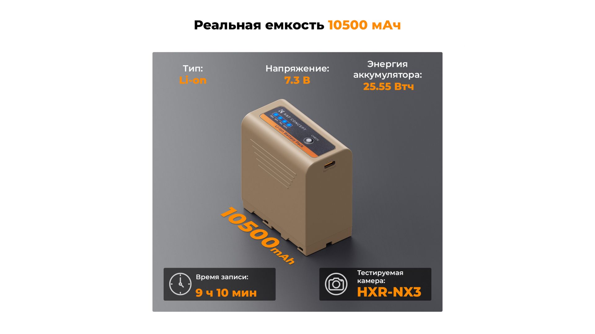10500 мАч, высококачественный литий-ионный аккумулятор NP-F970 с длительным сроком службы, подходит для продолжительных видео- и фотопроектов. Его можно использовать в качестве мобильного источника питания для зарядки смартфона, iPad и других устройств.