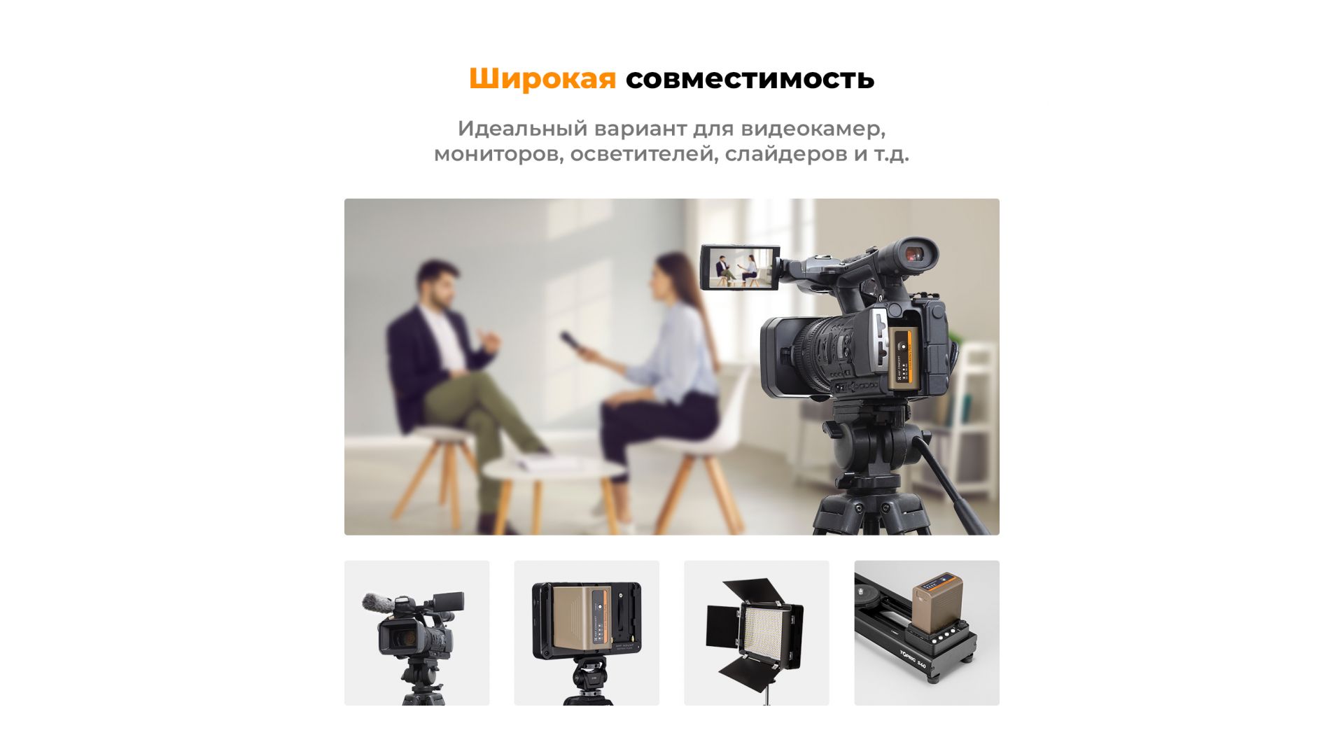 Подходит для замены аккумуляторов в моделях Sony, использующих аккумуляторы Sony NP-F550, NP-F570, NP-F750, NP-F770, NP-F930, NP-F950, NP-F960, NP-F970, а также подходит для светодиодных ламп камер, мониторов и слайдеров.