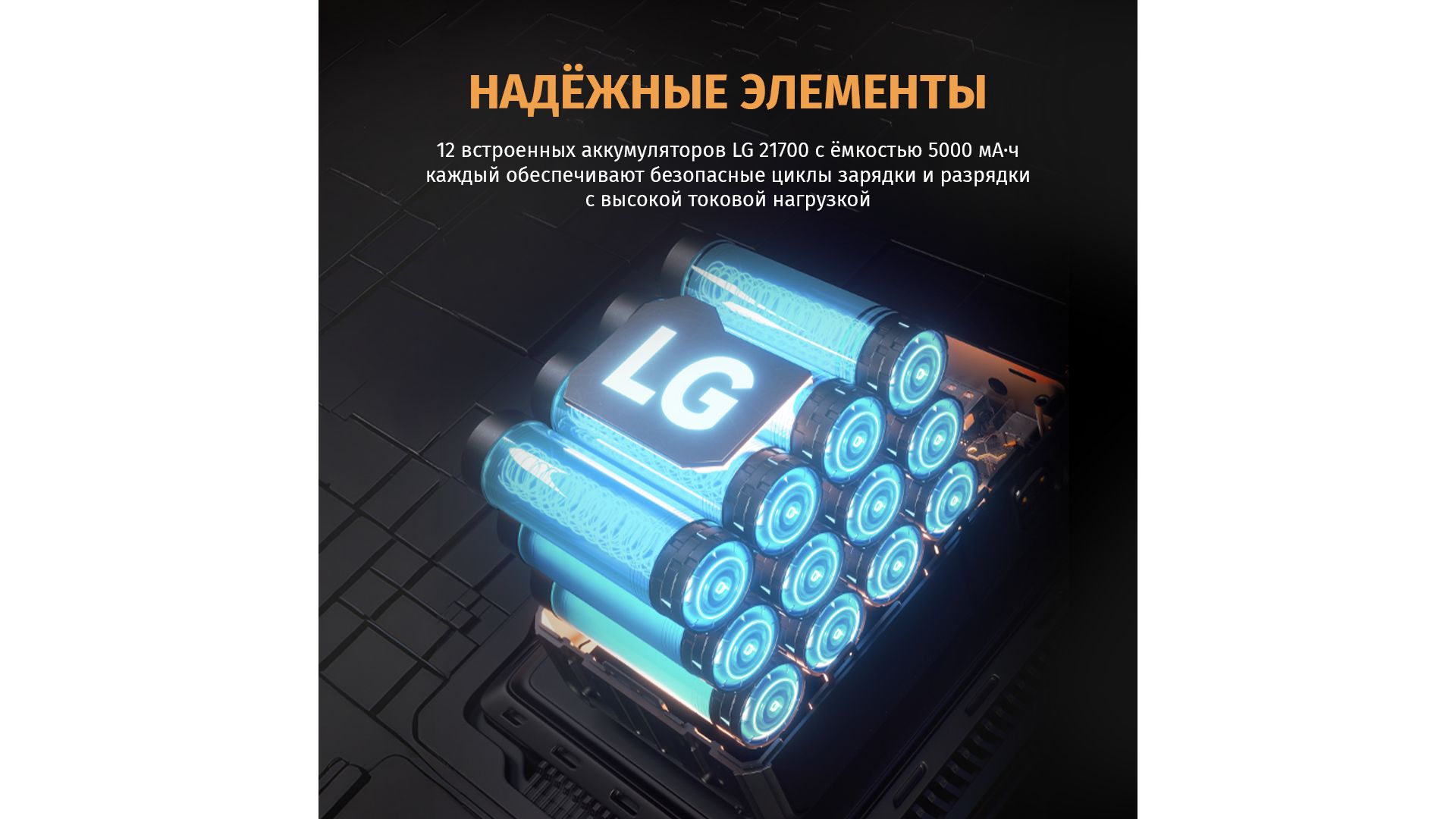 12 ячеек LG 21700 и продвинутый BMS-чип обеспечивают стабильную работу, защиту от перегрузки и быструю зарядку (всего 2 часа).