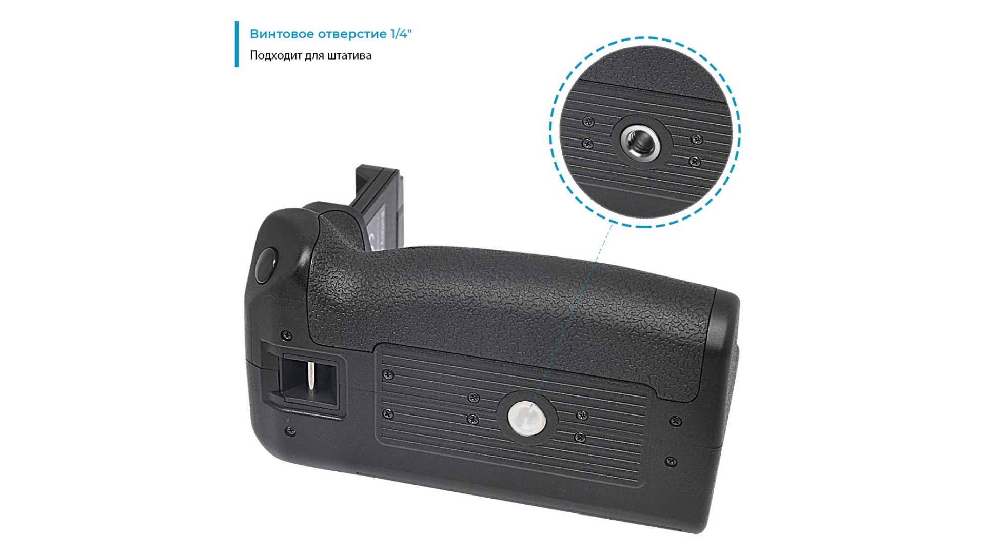 Нижняя часть батарейной ручки оснащена резьбовым отверситием 1/4″, ее легко можно установить на штатив.