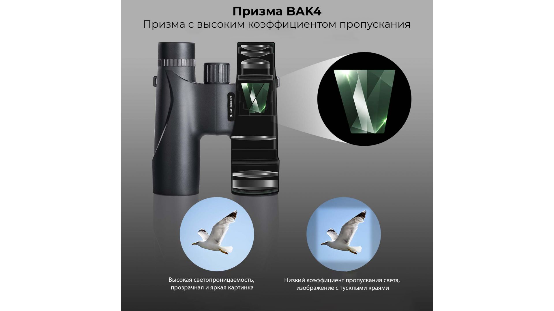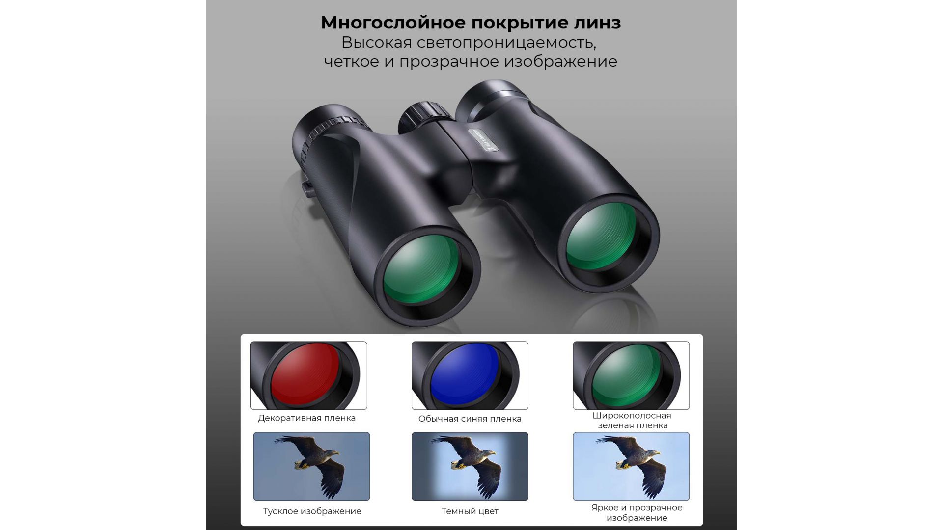 Окуляр и объектив с многослойным покрытием призмы BAK4 FMC, светопроницаемость до 99%, максимальное восстановление цвета изображения. Оснащен колесиком фокусировки, позволяющим быстро настроить центральную и окружающие части экрана, чтобы избежать частичного размытия изображения.