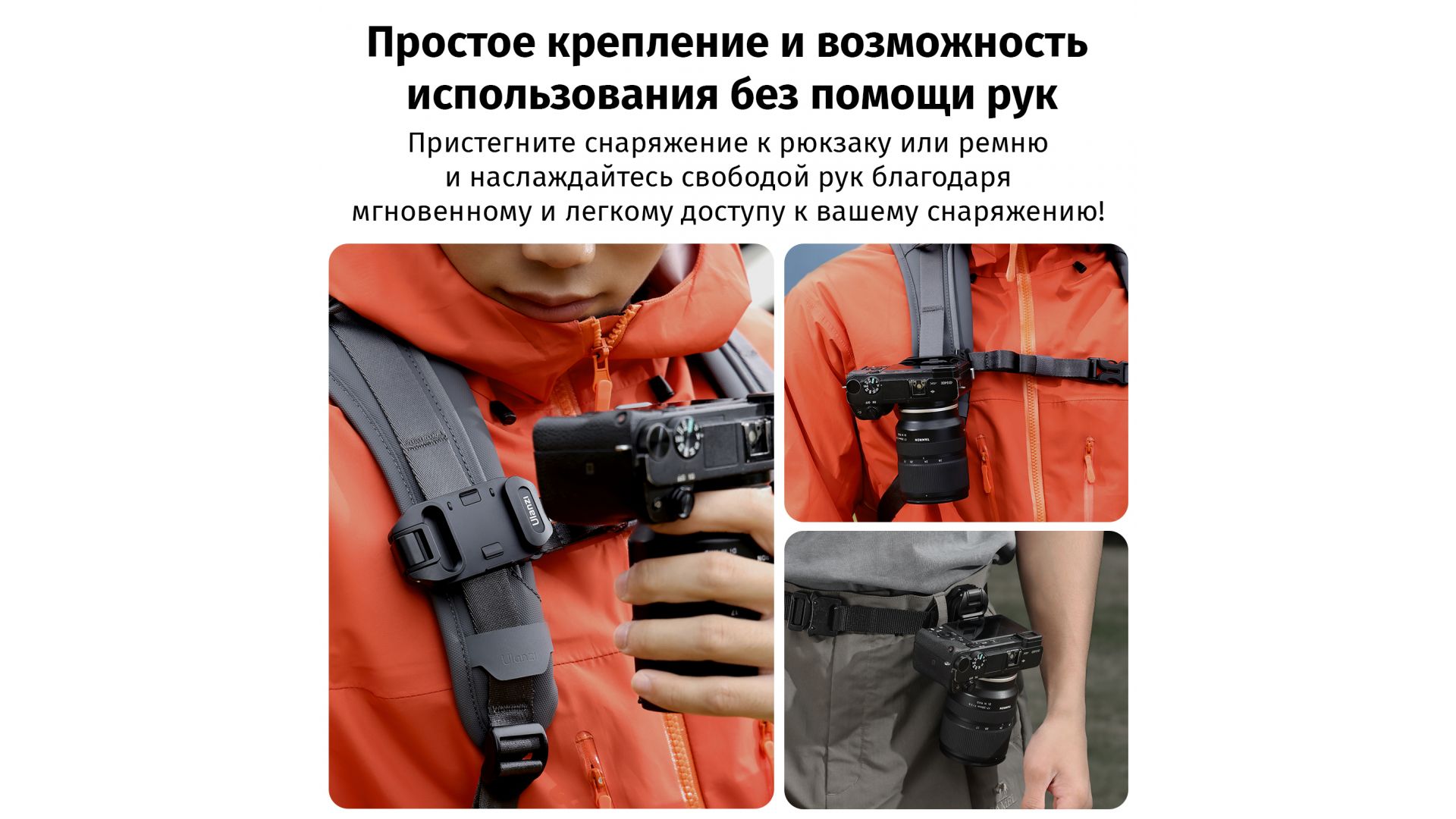 Простое крепление без помощи рук: пристегните снаряжение к рюкзаку или ремню и наслаждайтесь свободой рук благодаря мгновенному и легкому доступу к своему снаряжению!