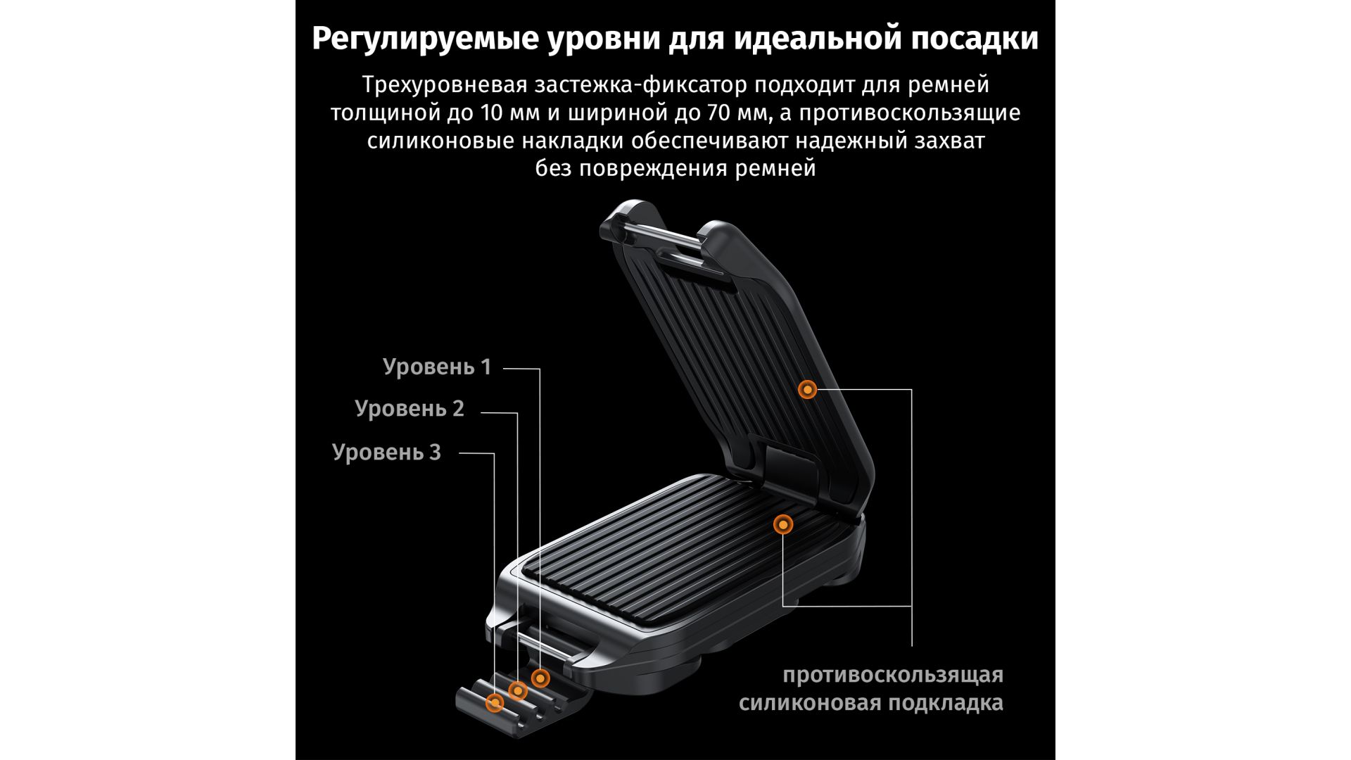 Регулируемые уровни для идеального прилегания: трехуровневая застежка регулируется для ремней толщиной до 10 мм и шириной до 70 мм, а противоскользящие силиконовые накладки обеспечивают надежный захват, не повреждая ремни.