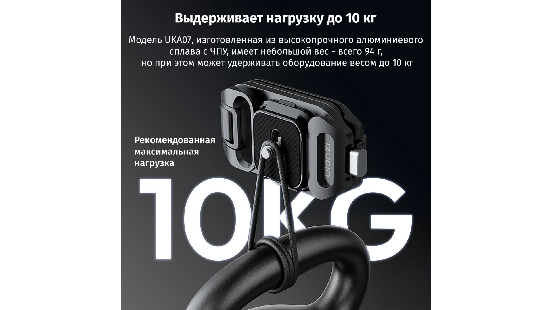 Выдерживает до 10 кг: изготовленный из высокопрочного алюминиевого сплава, обработанного на станках с ЧПУ, UKA07 имеет небольшой вес - всего 94 г, но при этом может выдерживать оборудование весом до 10 кг.
