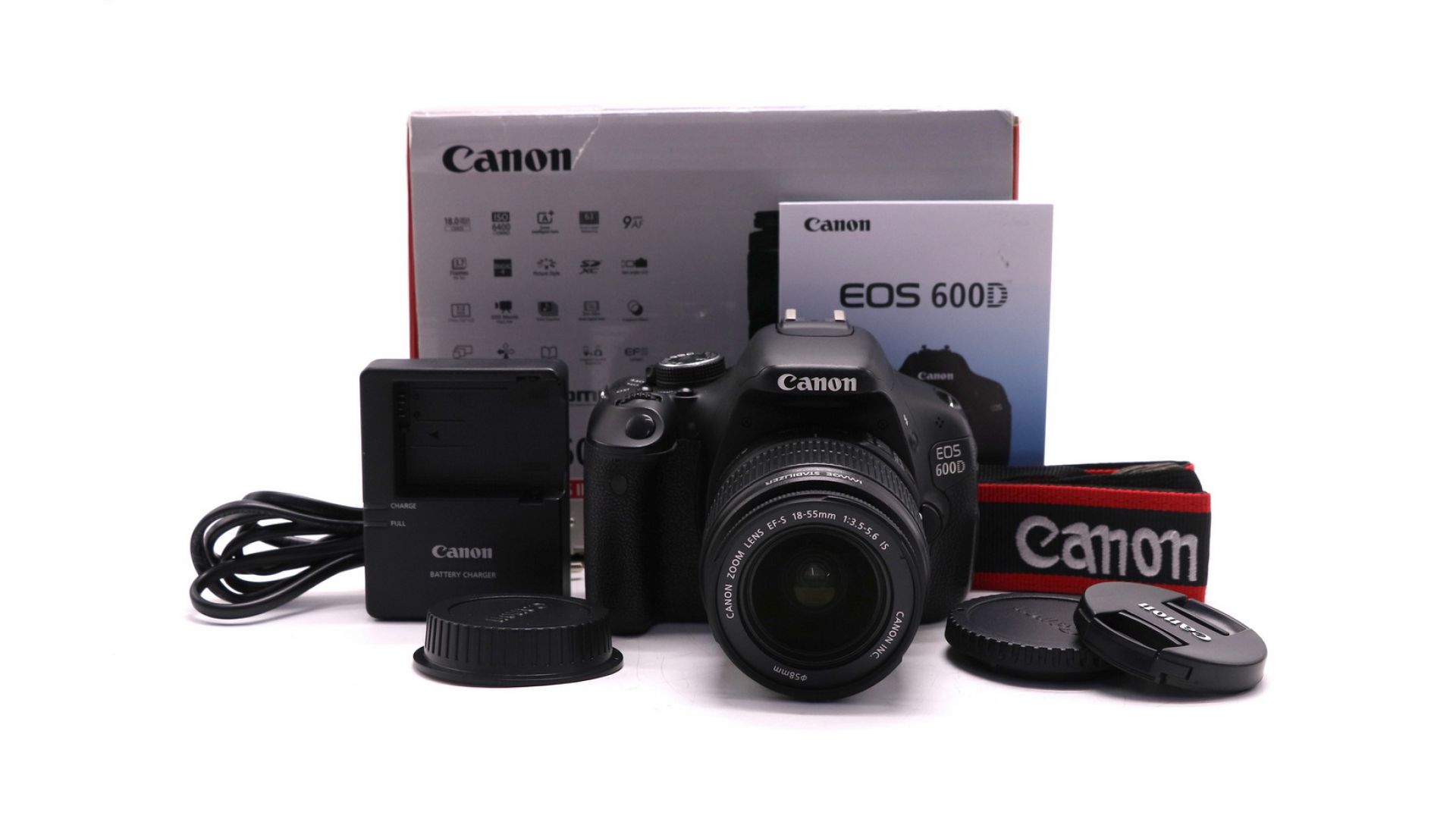 Коробка, документы, ремень, крышка байонета, крышки, объектив Canon EF-S 18-55mm 3.5-5.6 IS, аккумулятор, зарядное устройство.