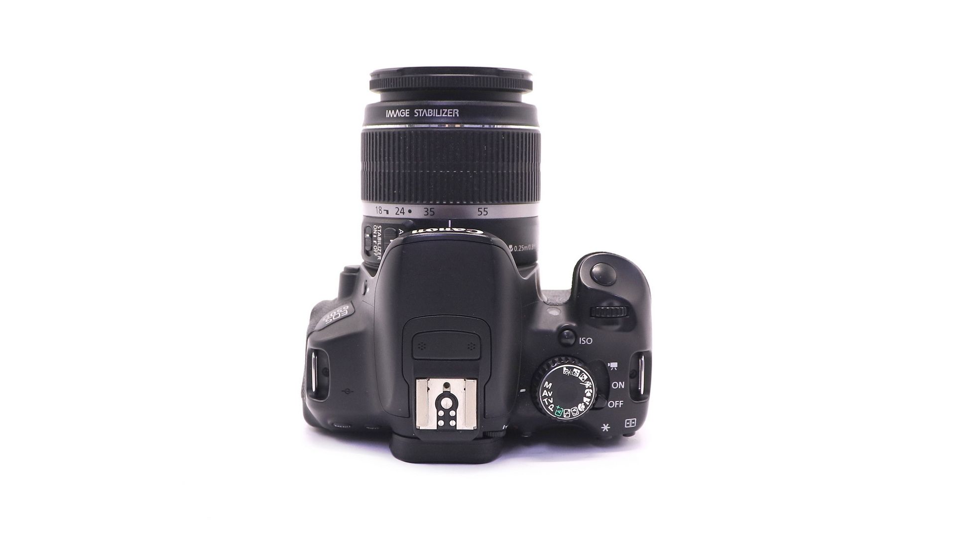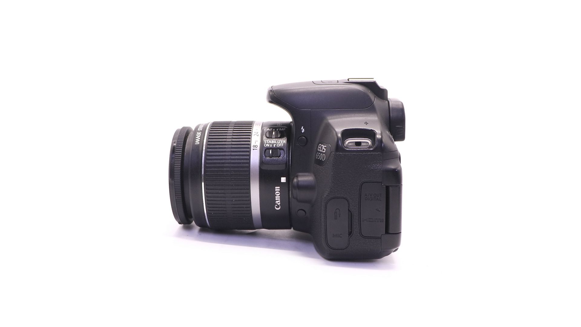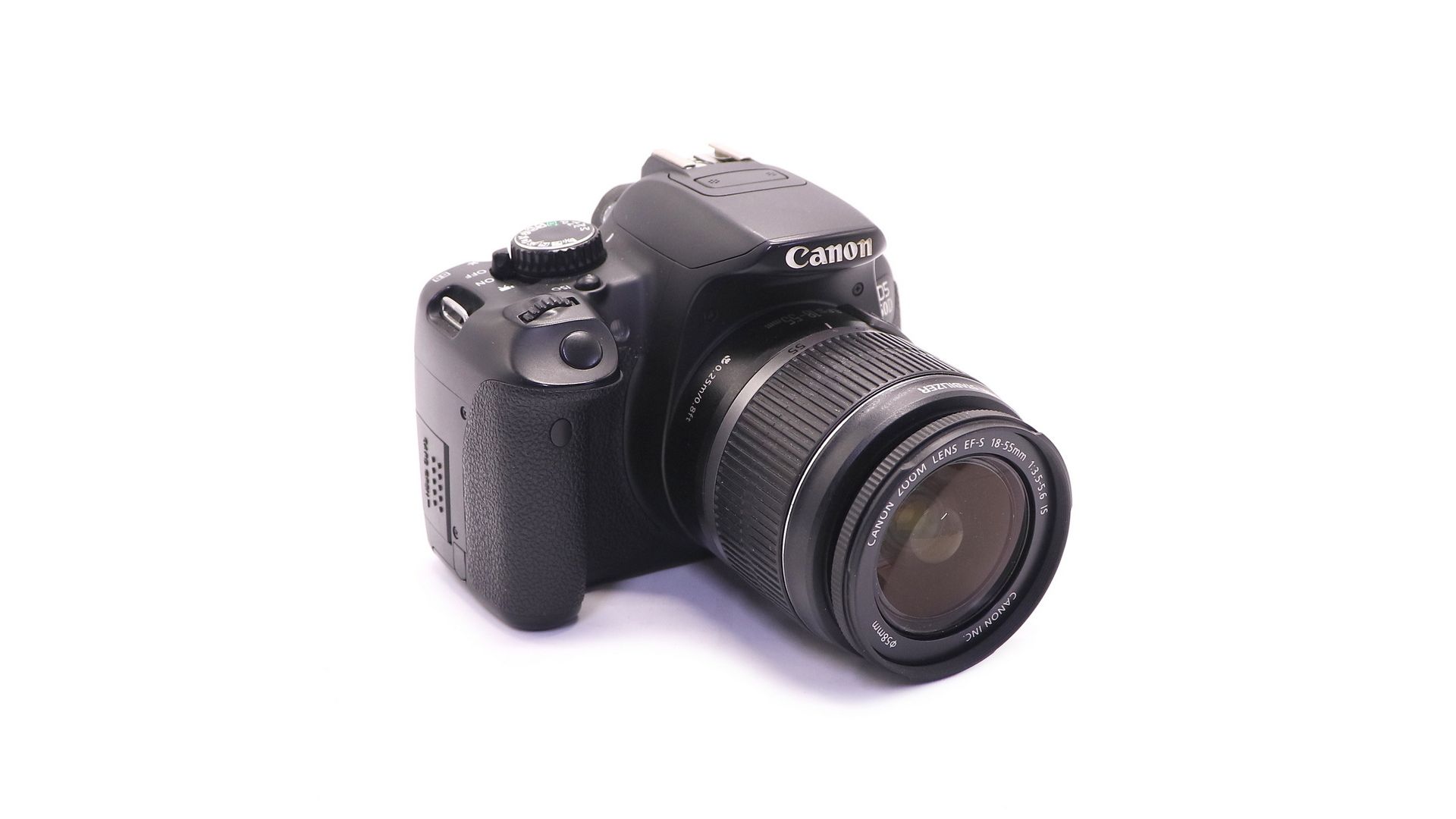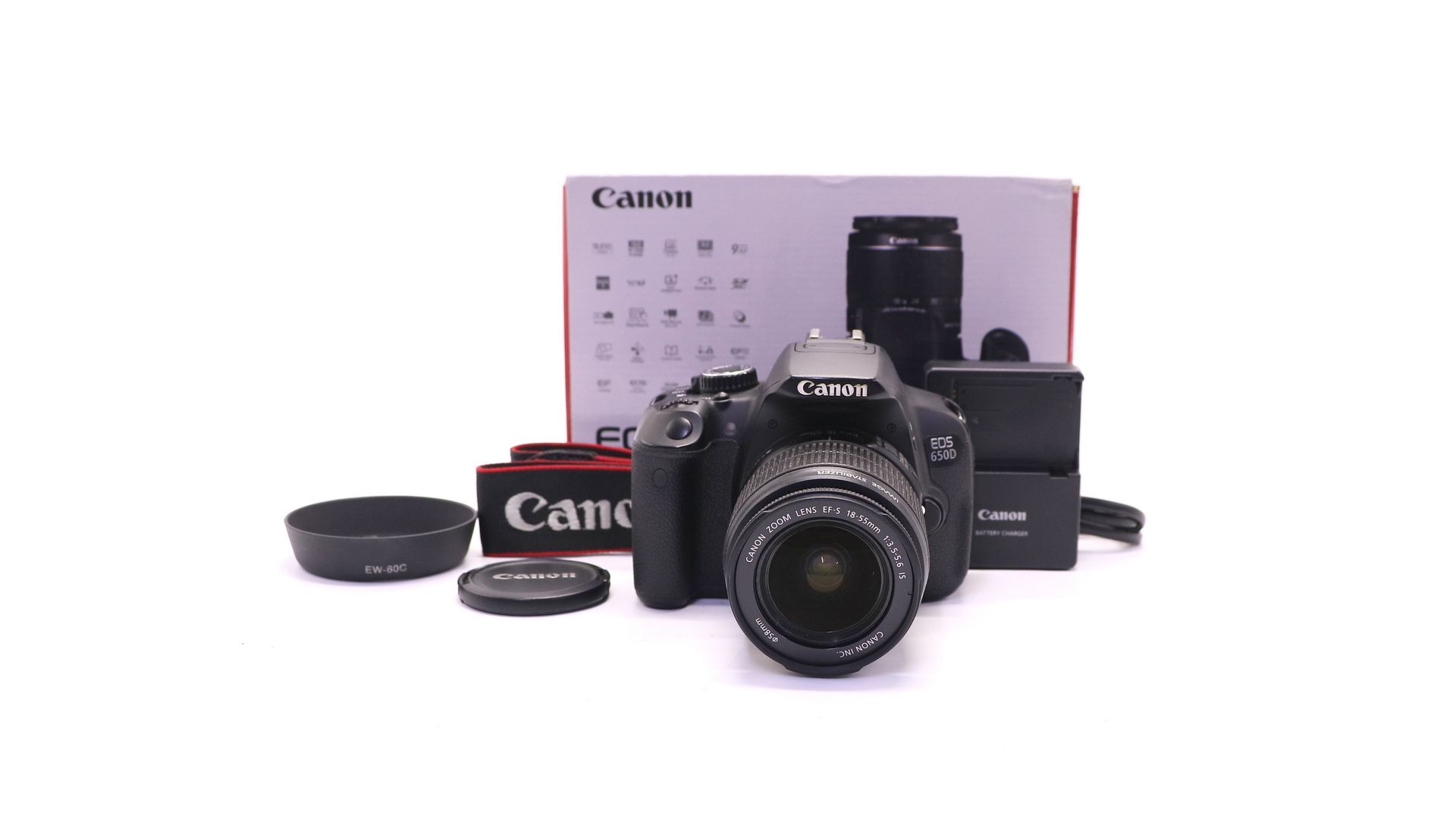 Комплектация:Коробка, зарядное устройство, аккумулятор, объектив Canon EF-S 18-55mm f/3.5-5.6 IS, крышки, ремень, документы, USB-кабель, AV-кабель.