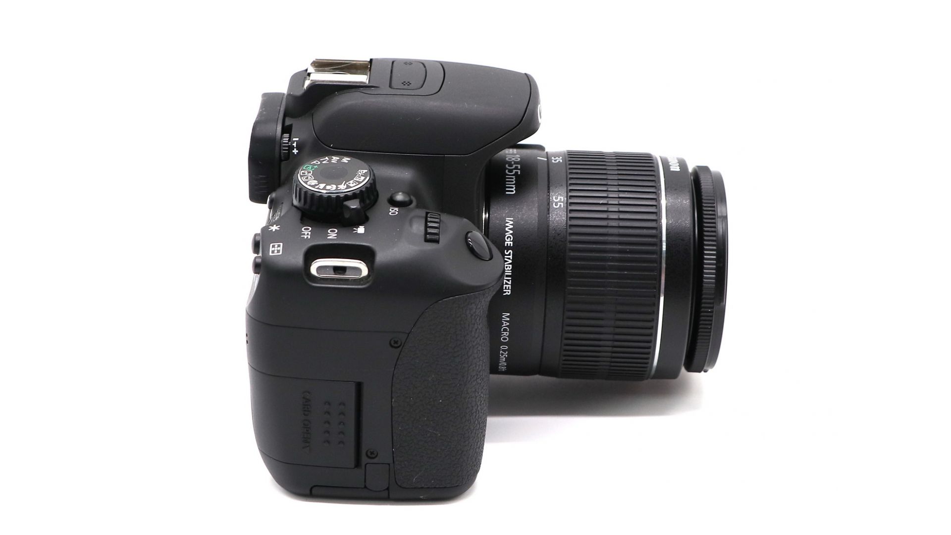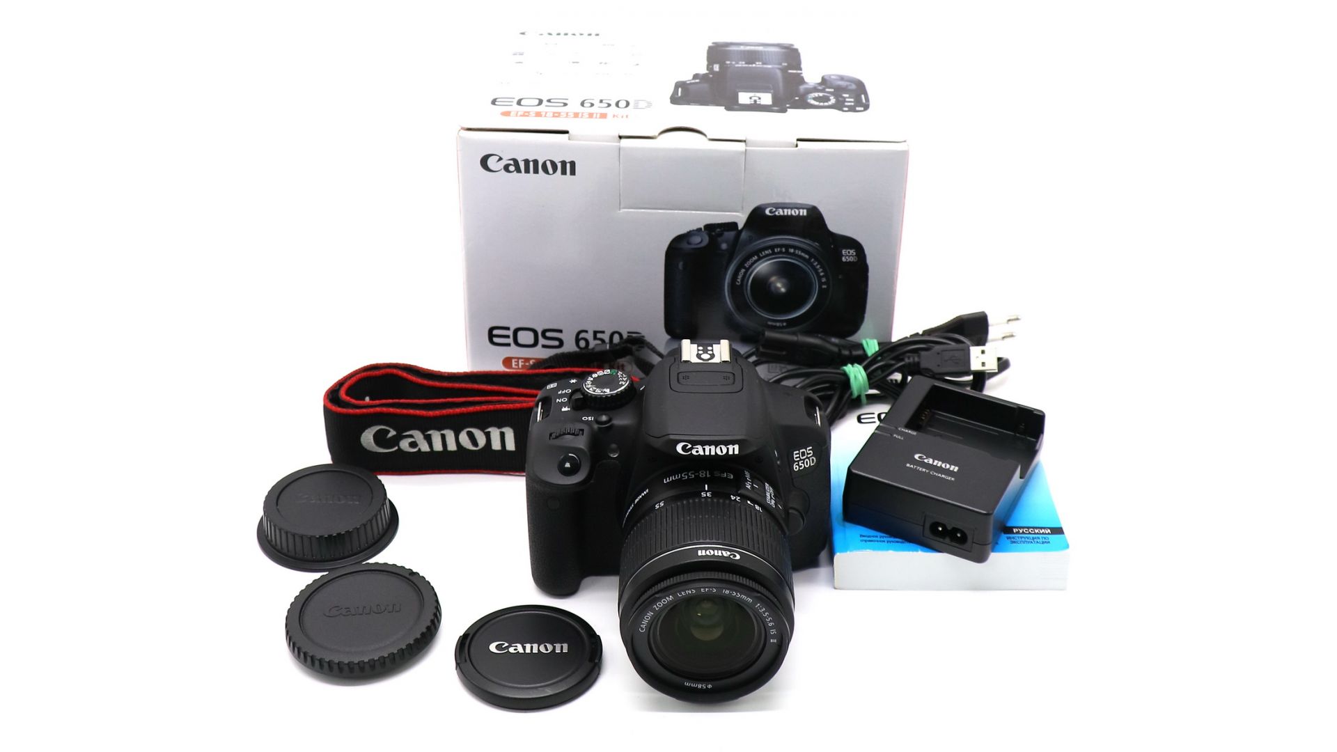 Комплектация:Коробка, зарядное устройство, аккумулятор, объектив Canon EF-S 18-55mm f/3.5-5.6 IS II, крышки, ремень, документы, USB-кабель.