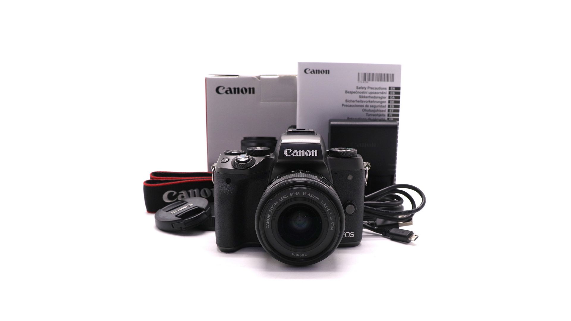 Комплектация:Коробка, аккумулятор, зарядное устройство, ремень, документы, USB-кабель, крышки, объектив Canon EF-M 15-45mm f/3.5-6.3 IS STM.