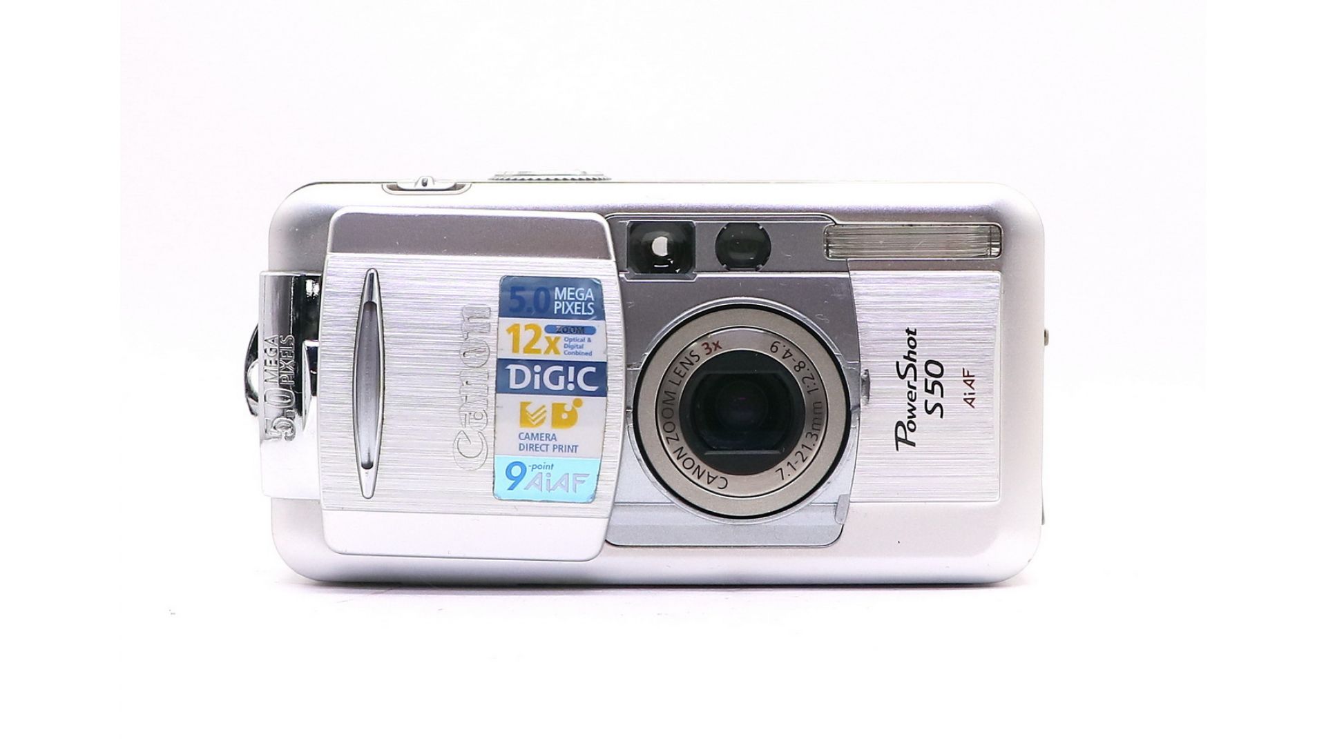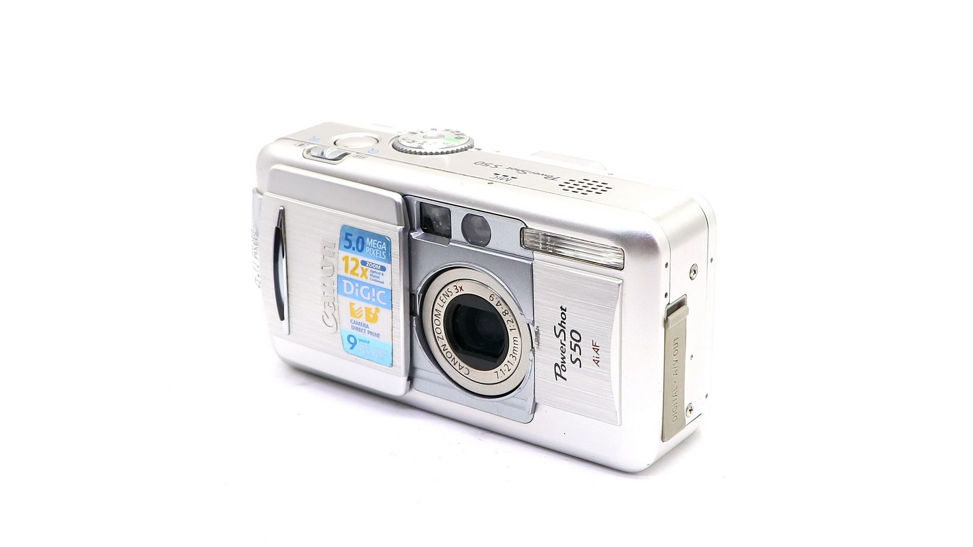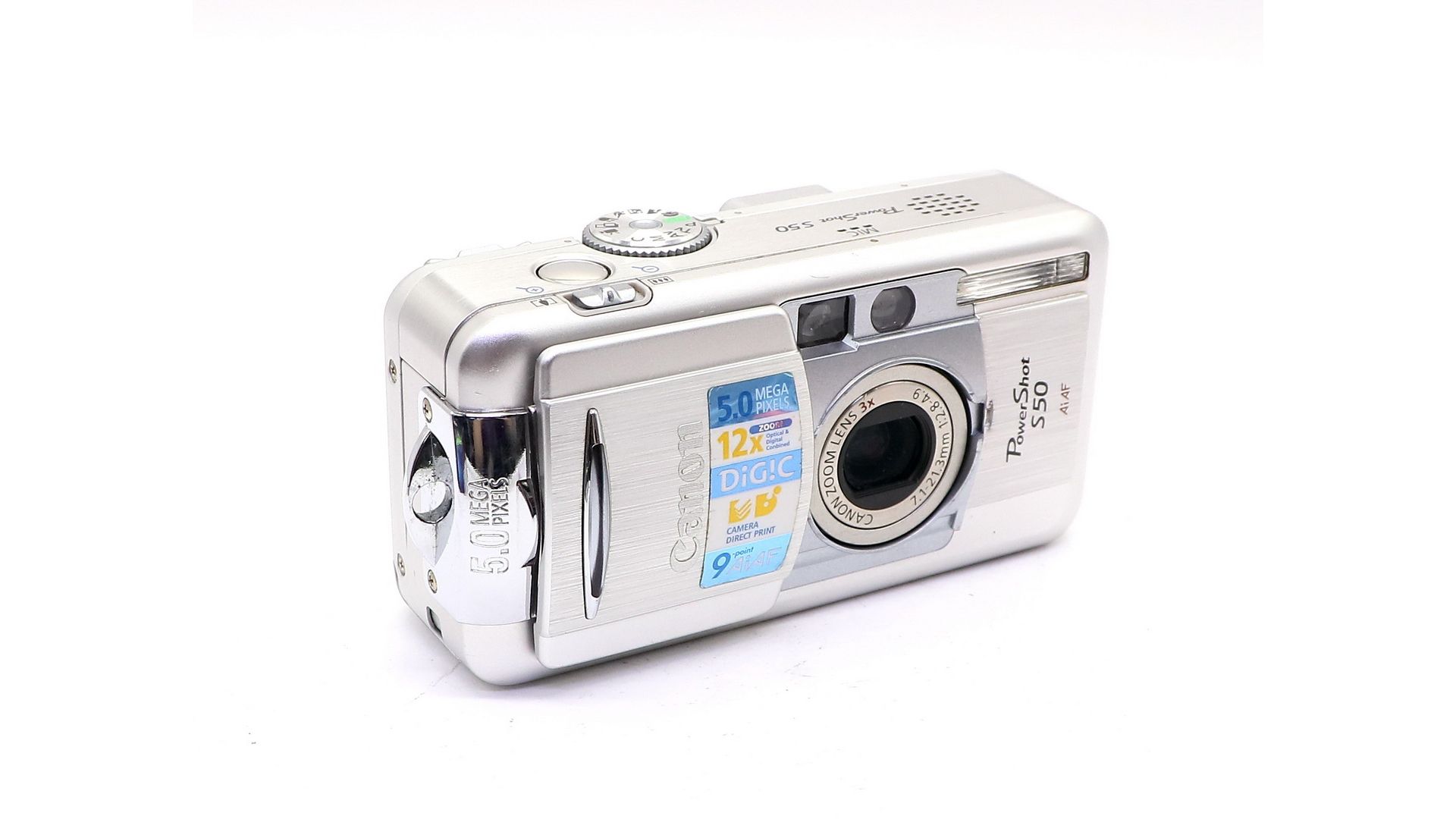 Фотокамера оснащена объективом с 3-кратным оптическим зумом с 5 мегапикселями. 9-точечная интеллектуальная автофокусировка (AiAF), селектор точки фокусировки по флексизоне и уникальный процессор цифровой обработки изображения Canon DIGIC. Камера PowerShot S50 использует информацию о положении зума, яркости снимаемой сцены и о состоянии других систем, чтобы определить тип сюжета и оптимизировать скорость автофокусировки, точность экспозиции и качество баланса белого. ля максимального качества изображения камера PowerShot S50 может записывать файлы в формате RAW и нескольких вариантах JPEG. Сочетание автоматических и ручных установок камеры PowerShot S50 обеспечивает 13 режимов съёмки, в том числе сюжетно-ориентированные и полуавтоматические, например, режим с приоритетом диафрагмы.