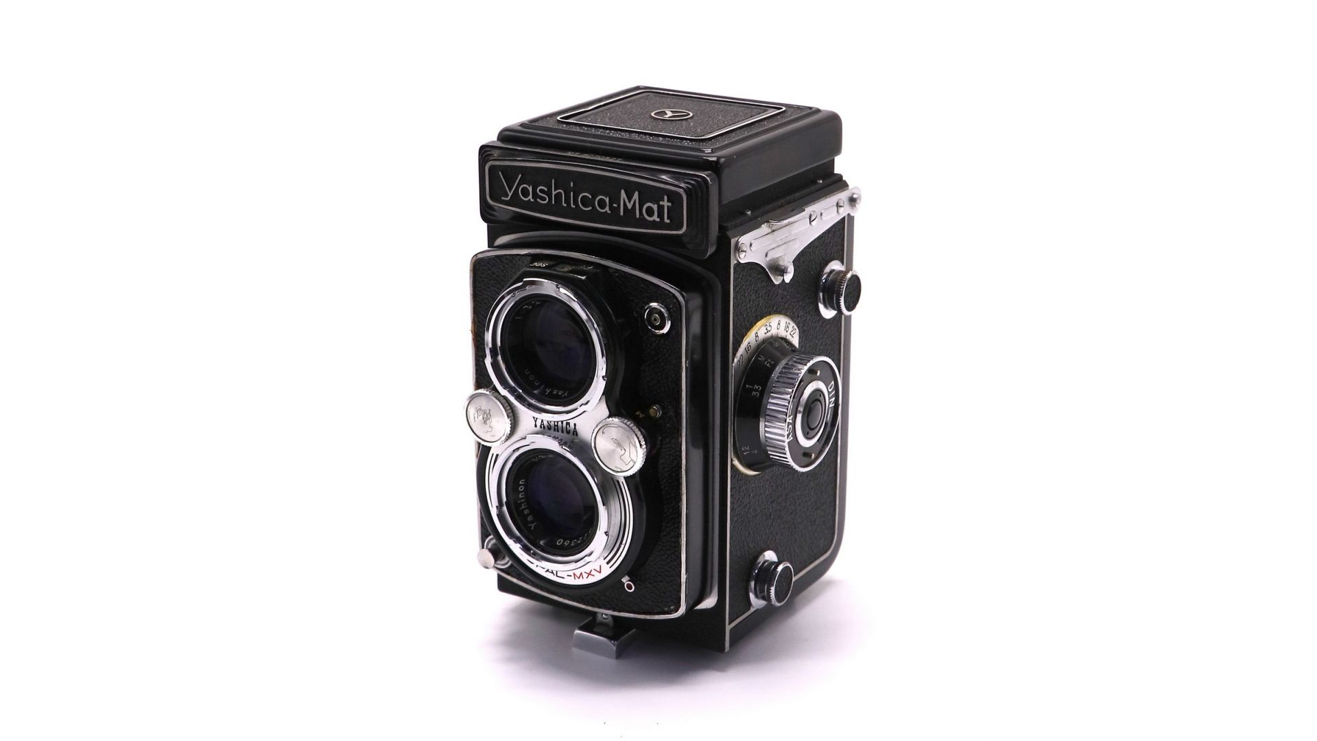 Основной съёмочный объектив — Yashinon 80 мм f/3.5, а верхний объектив видоискателя светосильнее, что даёт яркое и чёткое изображение на матовом фокус‑экране. Используется центральный затвор Copal‑SV с выдержками от 1 секунды до 1/500 с и выдержкой «B», а также встроенный экспонометр CdS в более поздних моделях (например, Yashica Mat 124G).