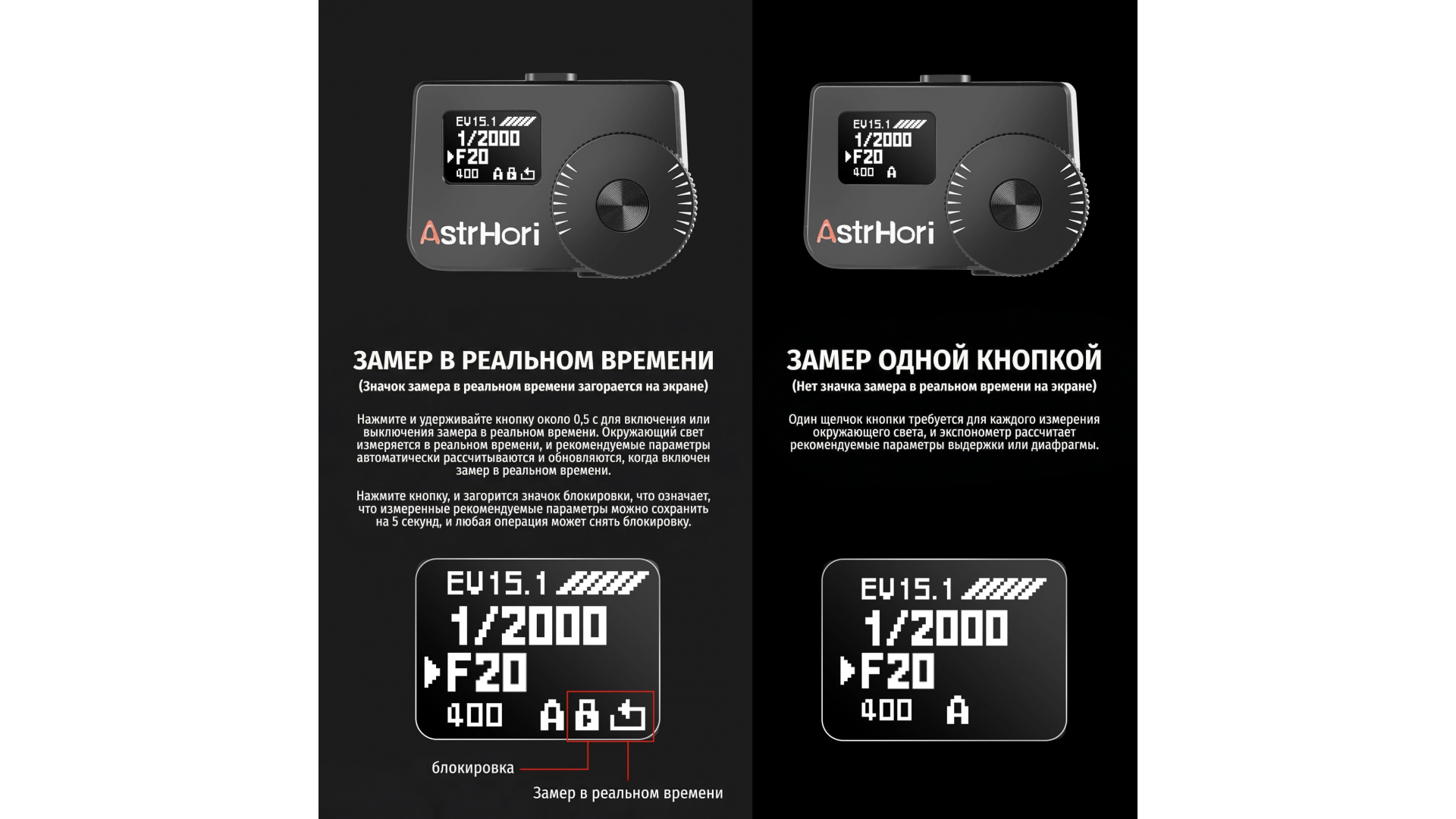 AstrHori AH-M1 может непрерывно отслеживать изменяющиеся значения освещенности в режиме реального времени. Он имеет два режима измерения: A и T.