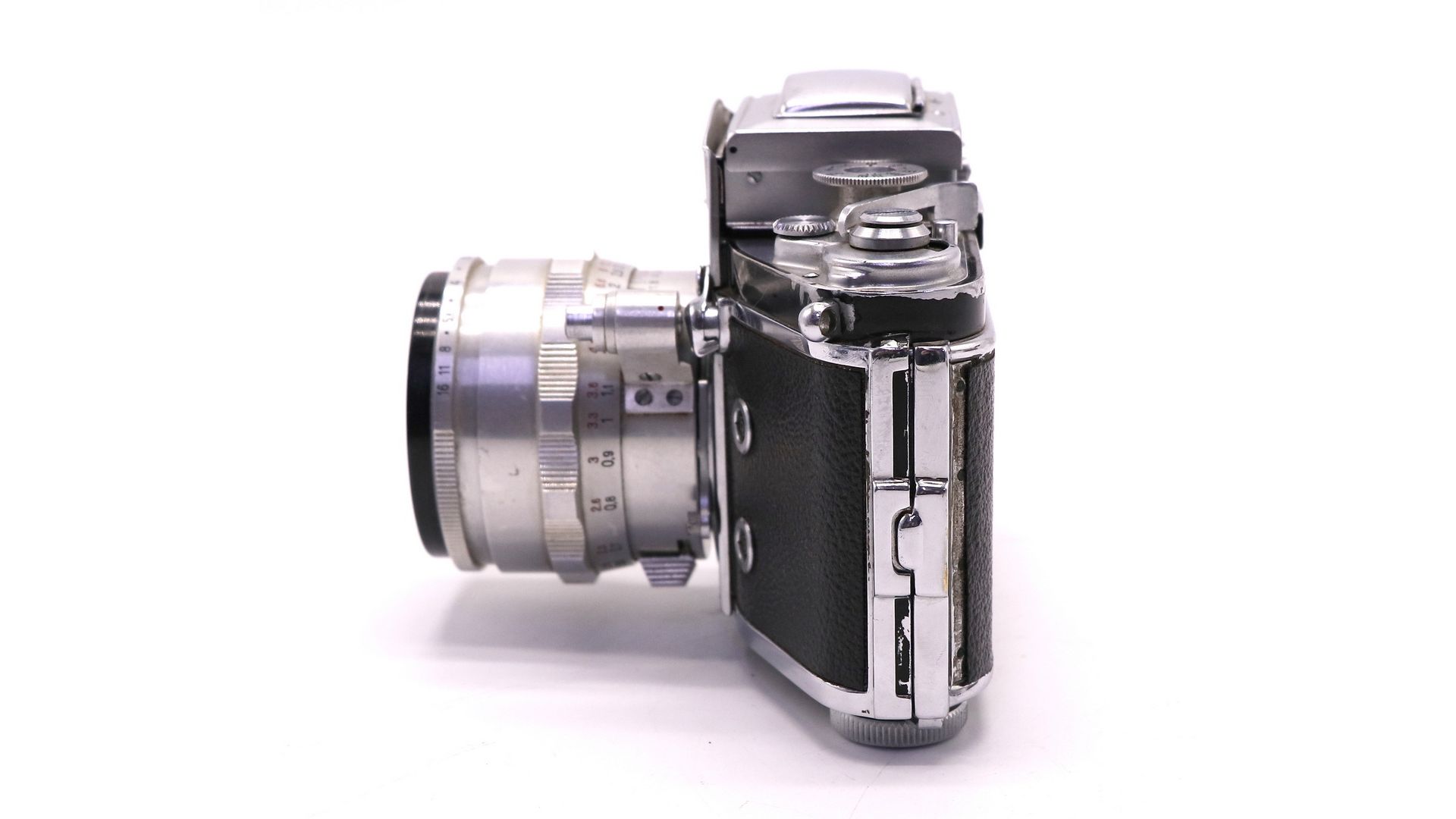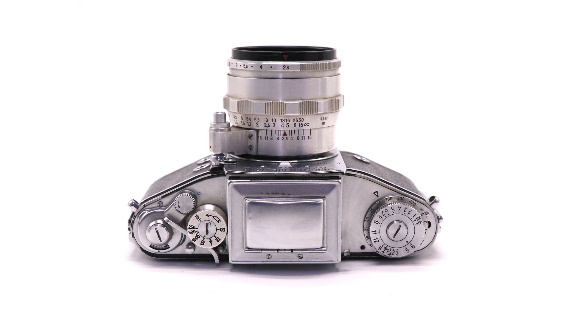 Выдержки: 1/1000, 1/250, 1/500, 1/150, 1/100, 1/50, 1/25 , В (от руки) и Z (от руки длинная, первое нажатие шторки открываются, второе закрываются). Также есть дополнительные выдержки, 1/5, ½, 1, 1.5, 2, 3, 5, 6, 7, 8, 9, 11, 12с. Сменные видоискатели.Зеркало «залипающее», опускающееся при взводе затвора и поднимающееся при спуске. Фотоаппарат оснащен удобным, легким объективом Tessar 2.8/50.