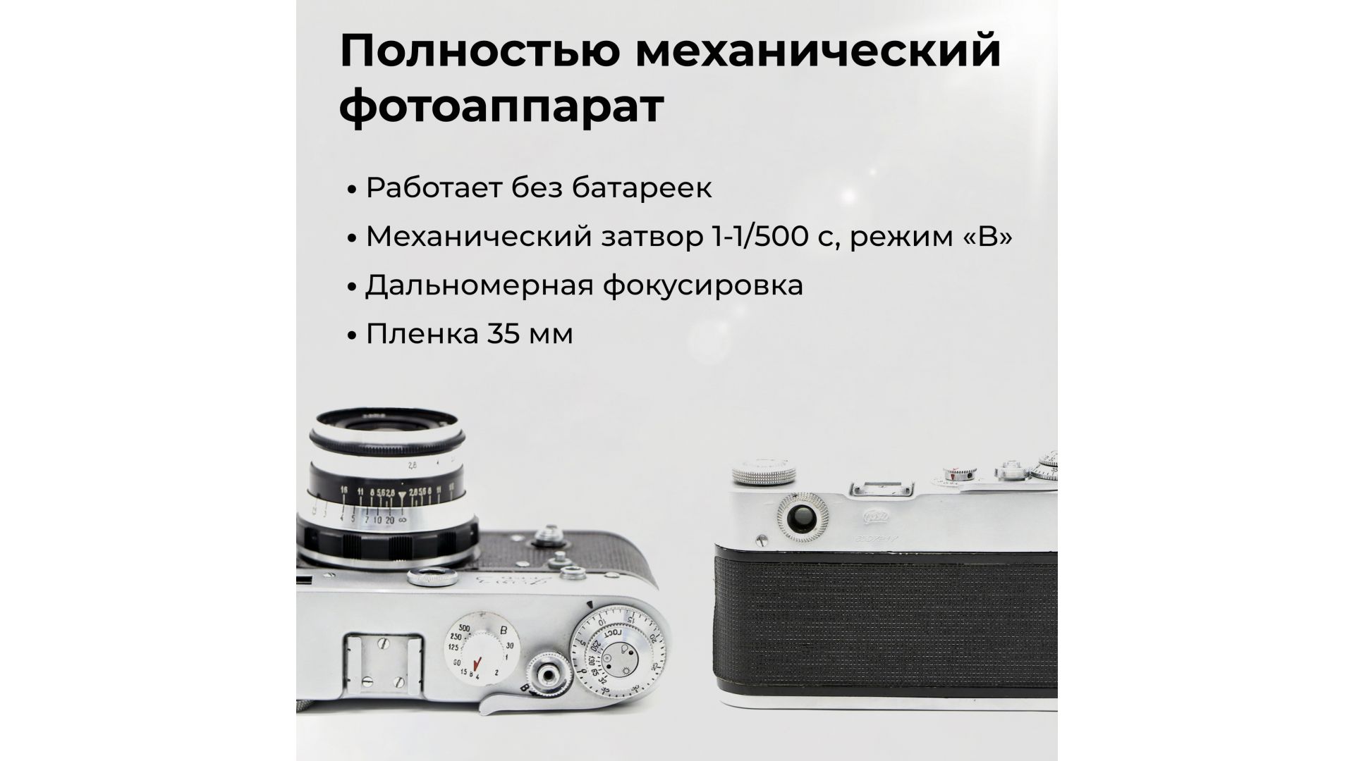 Дальномерный аппарат с механическим затвором (1–1/500 с, В). Объектив «Индустар‑61» 2,8/50 мм отличается высокой резкостью и хорошей светосилой. Точная фокусировка через дальномер, резьба М39.