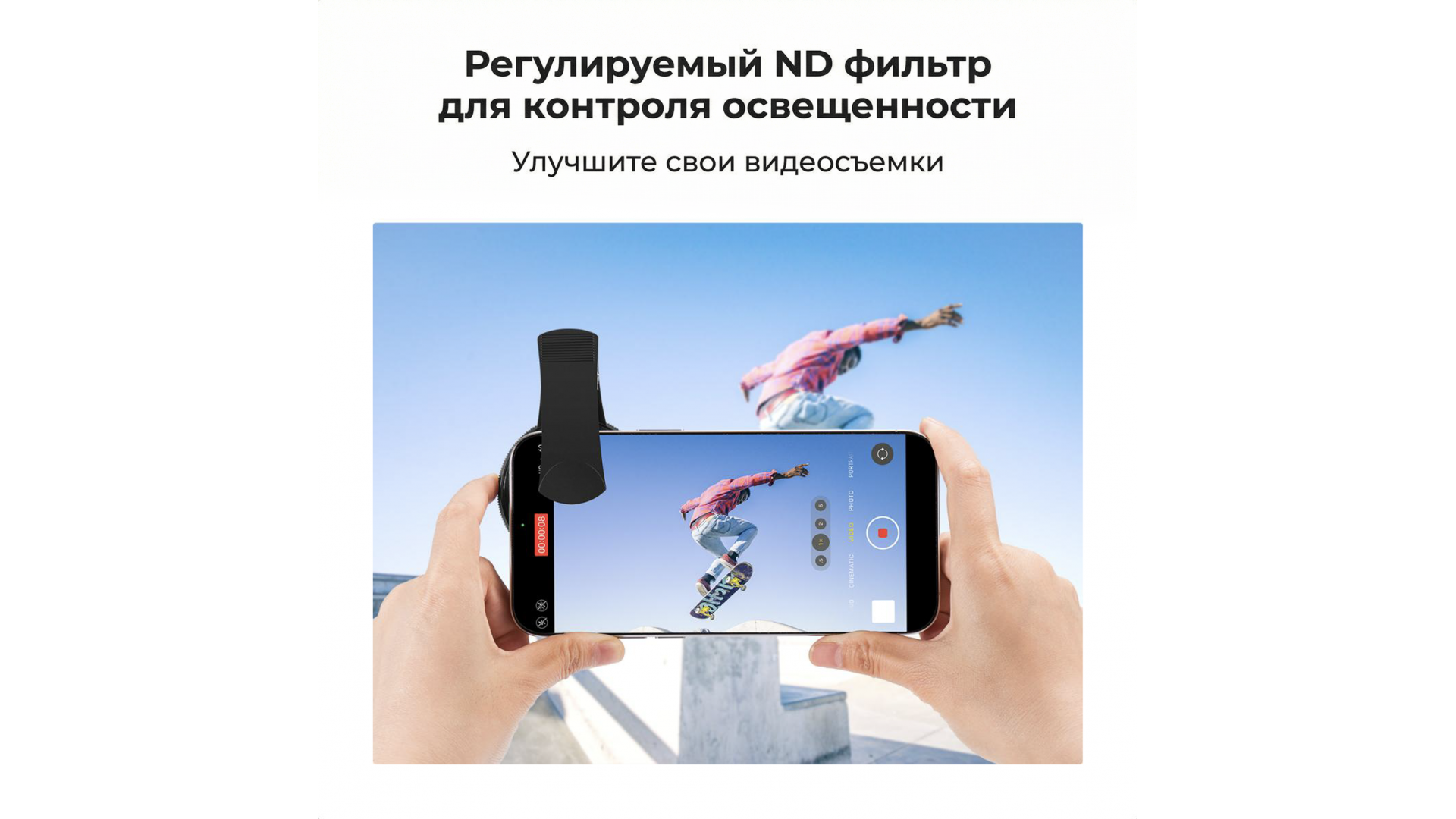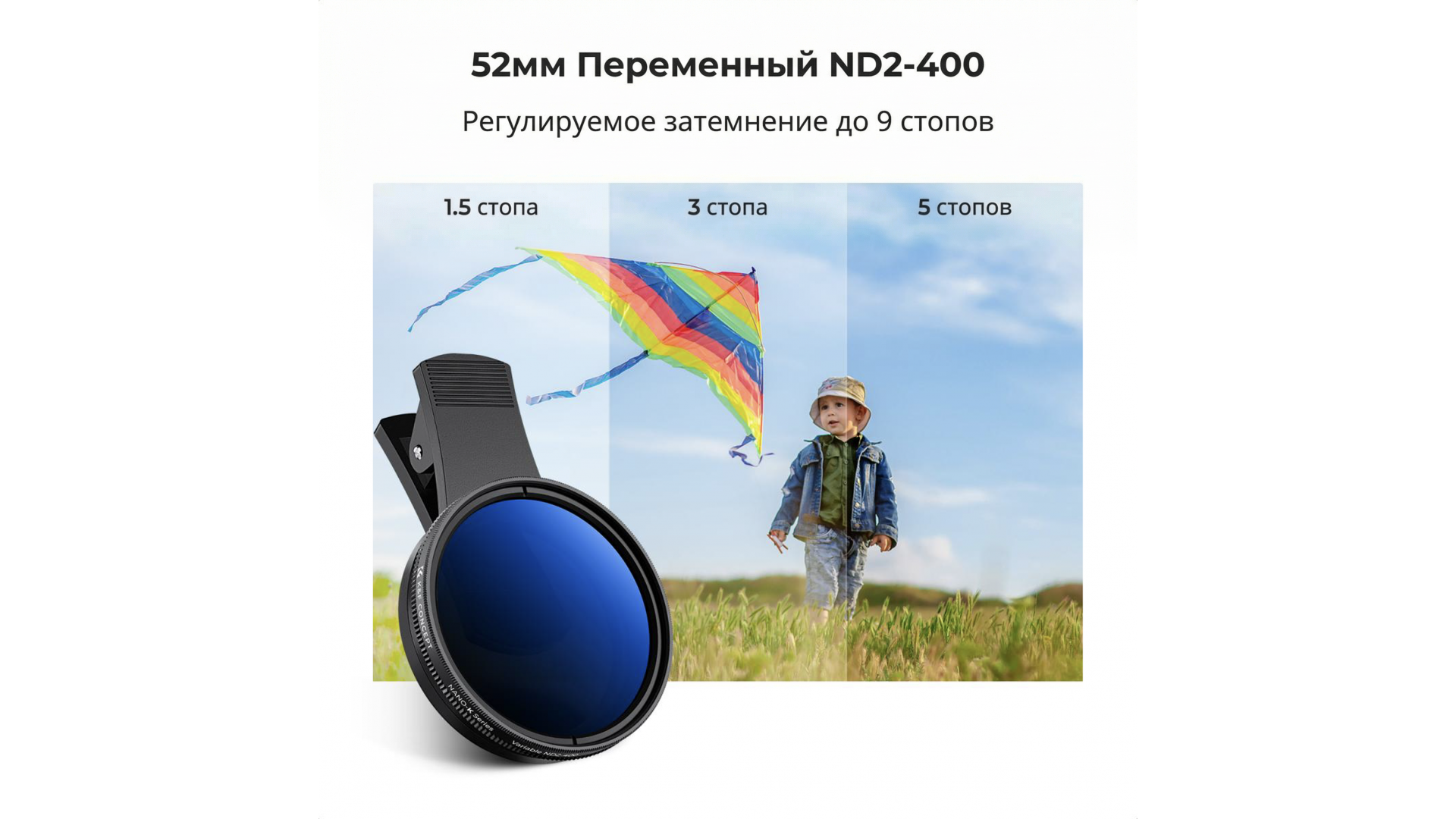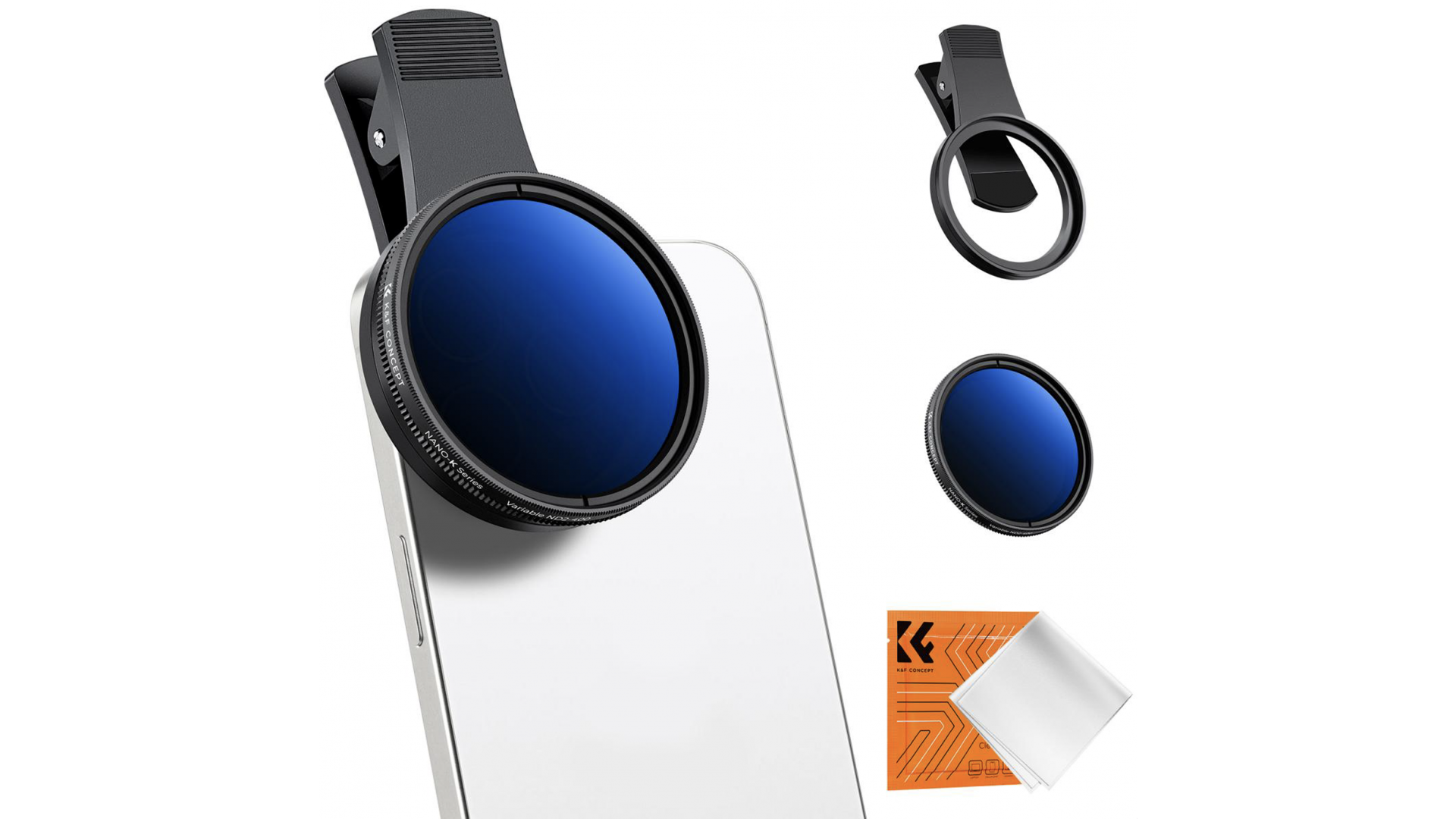 Превратите камеру смартфона в профессиональный инструмент для фотоохоты! Комплект K&F Concept включает регулируемый фильтр переменной плотности Nano-K (ND2-400) и универсальную клипсу для крепления на телефон.