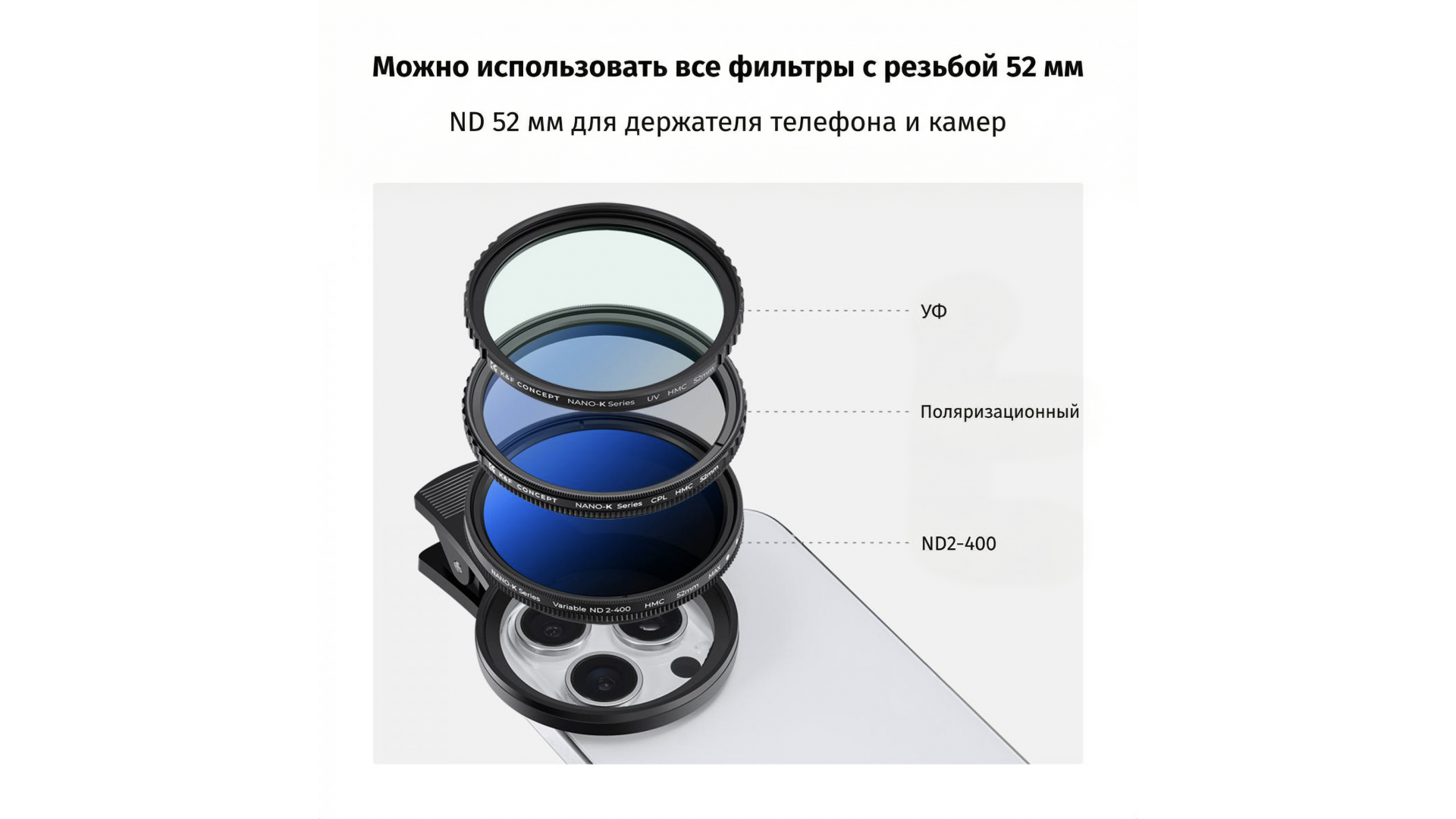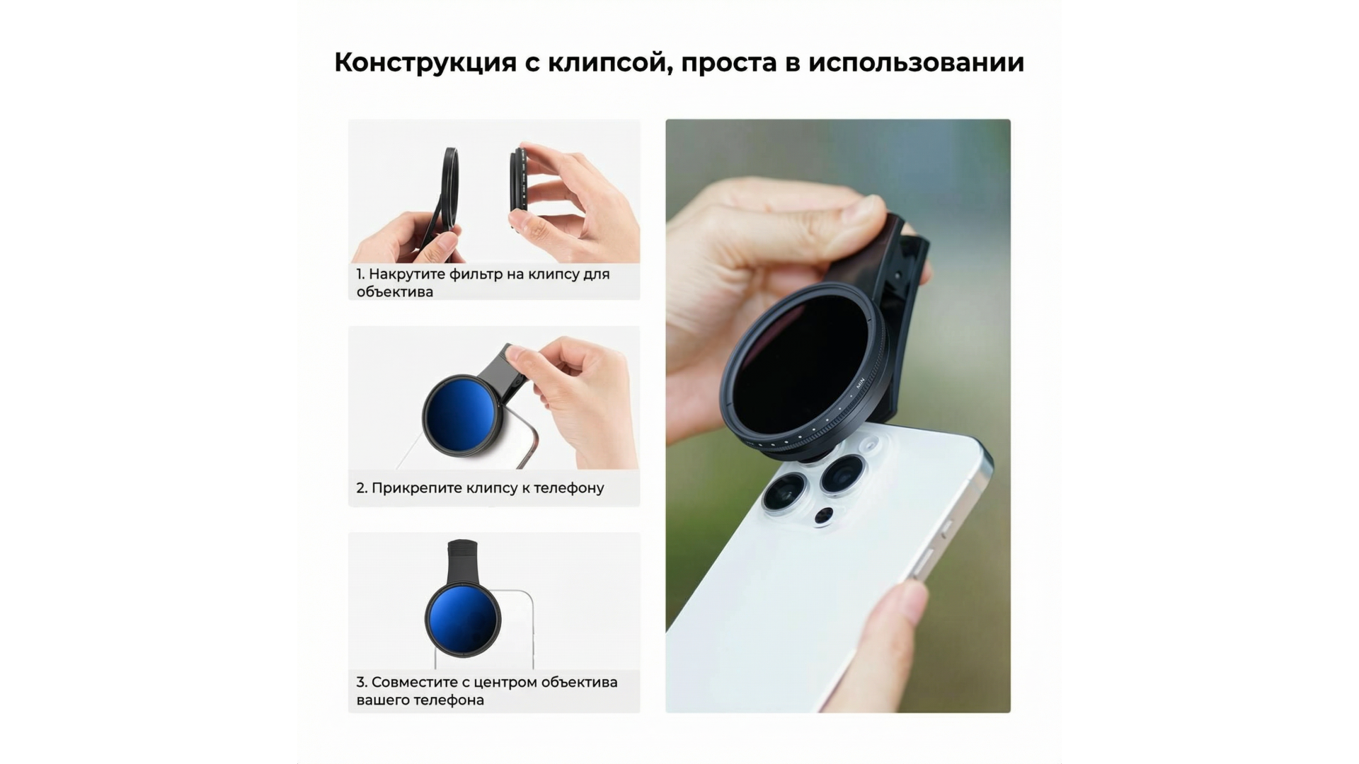 Монтаж элементарен: прикрутите фильтр к клипсе, закрепите на смартфоне — и можно творить. Комплект совместим с большинством телефонов и объективами зеркальных камер с резьбой 52 мм.