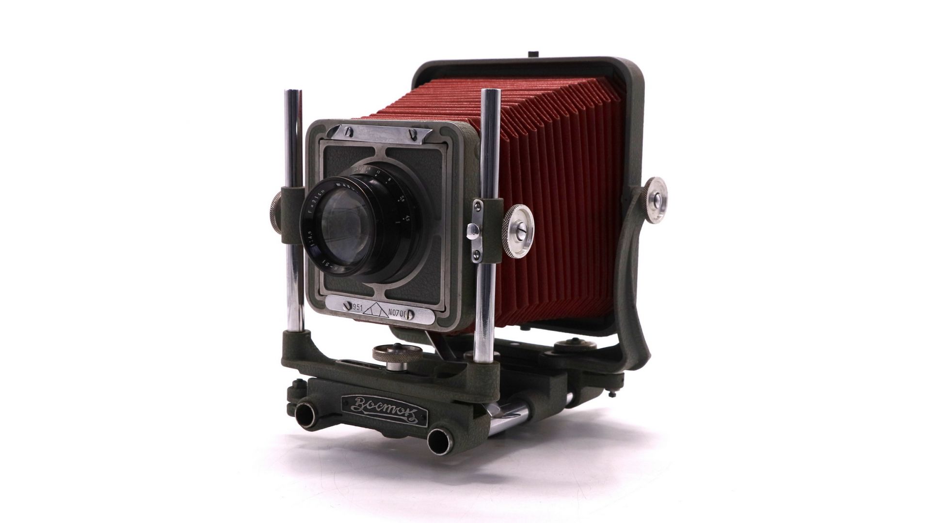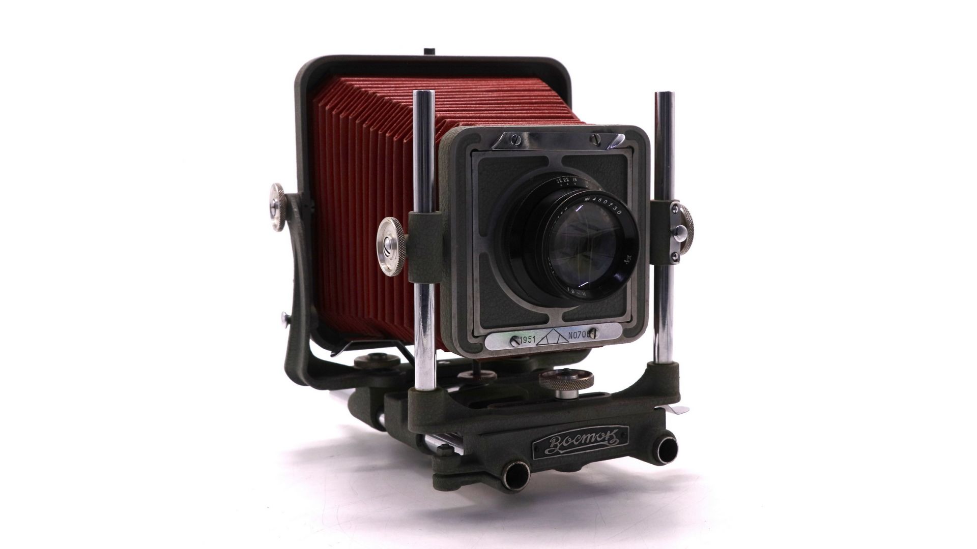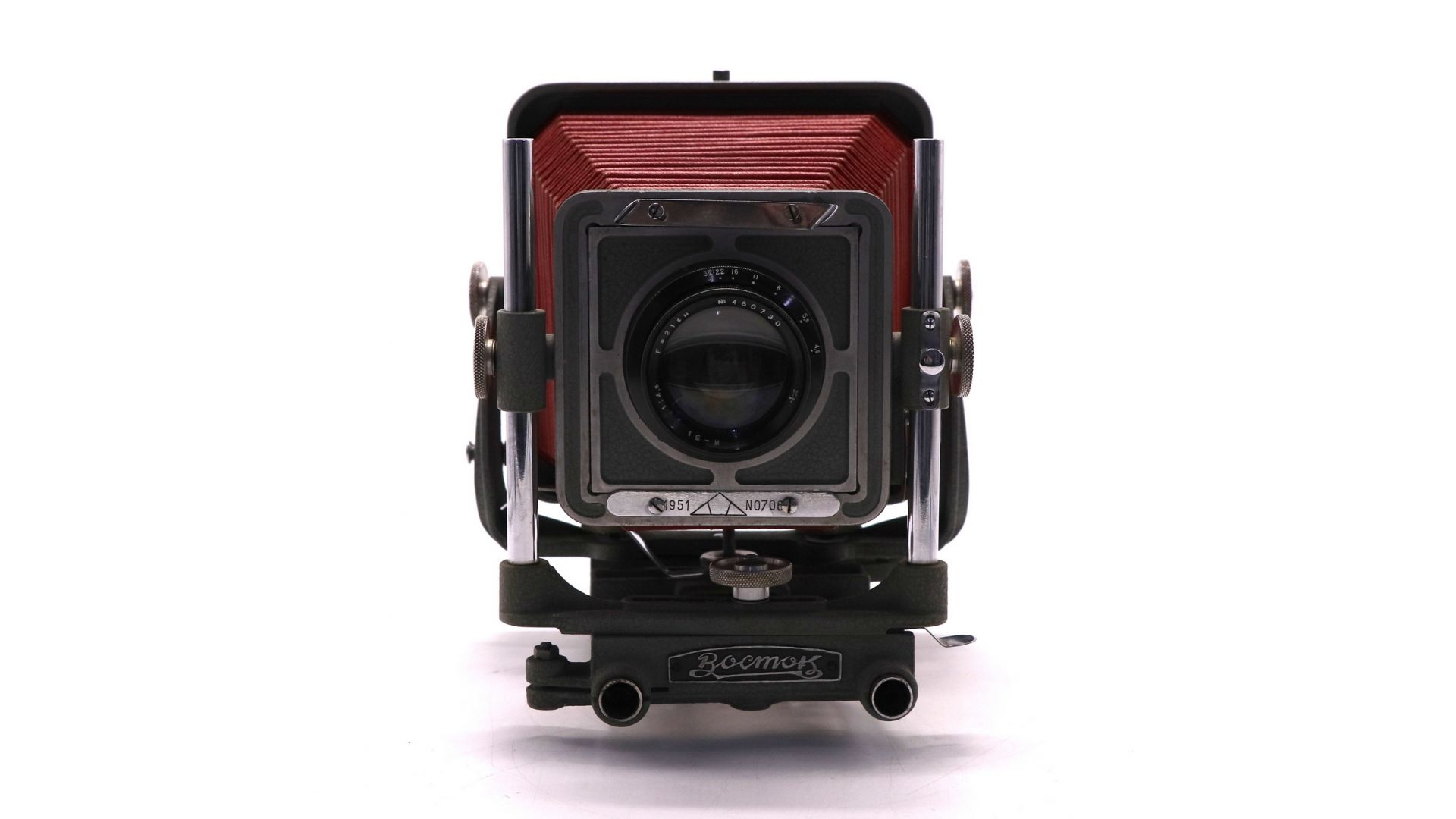 Фотоаппарат "Восток" (1951 год) с объективом И-51 — это советский пластиночный зеркальный фотоаппарат формата 9×12 см. Данная модель представляет собой шкальный однообъективный зеркальный аппарат (зеркало фиксированное, сдвигается только в момент съемки), выпускавшийся на Красногорском механическом заводе.