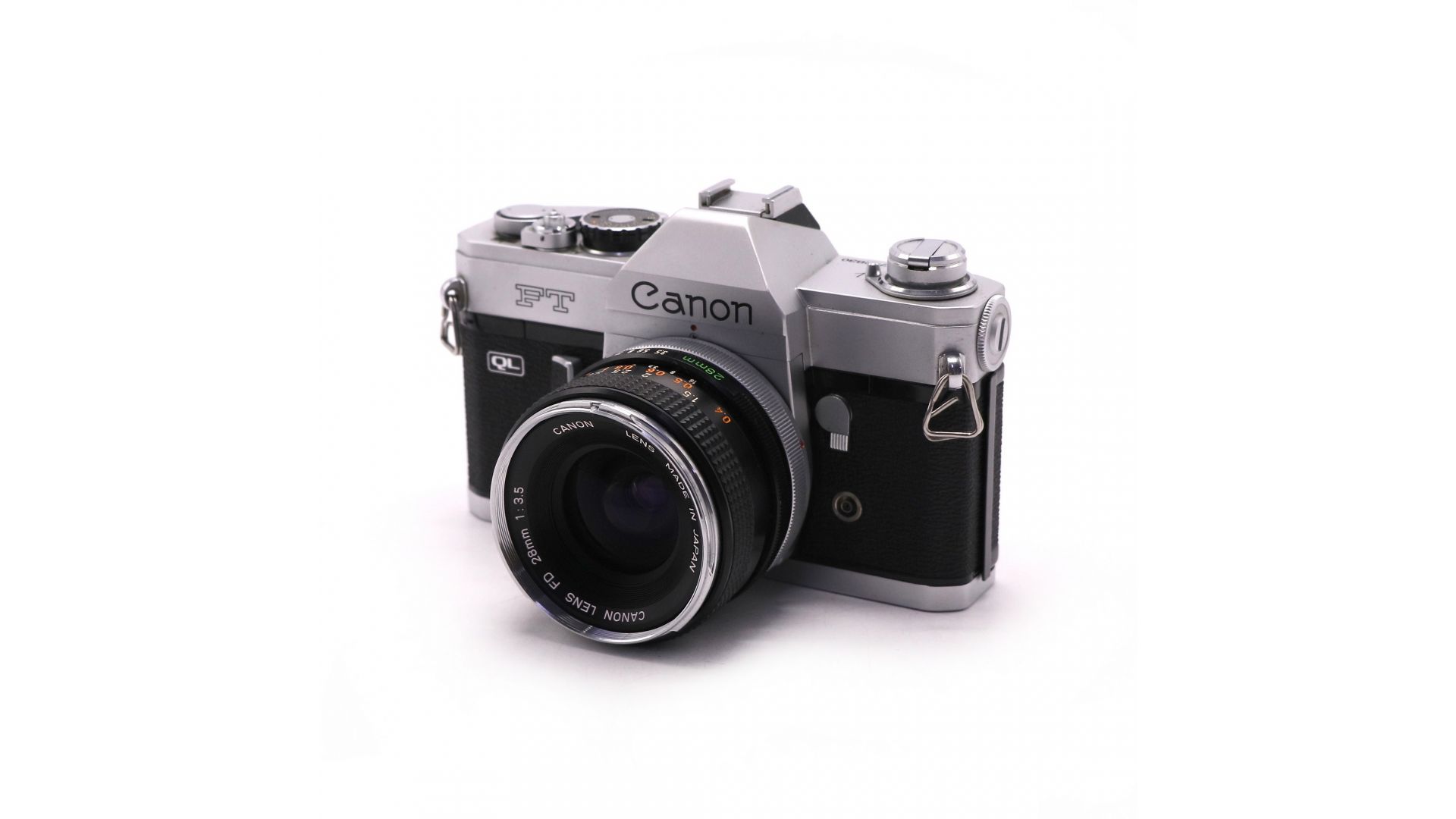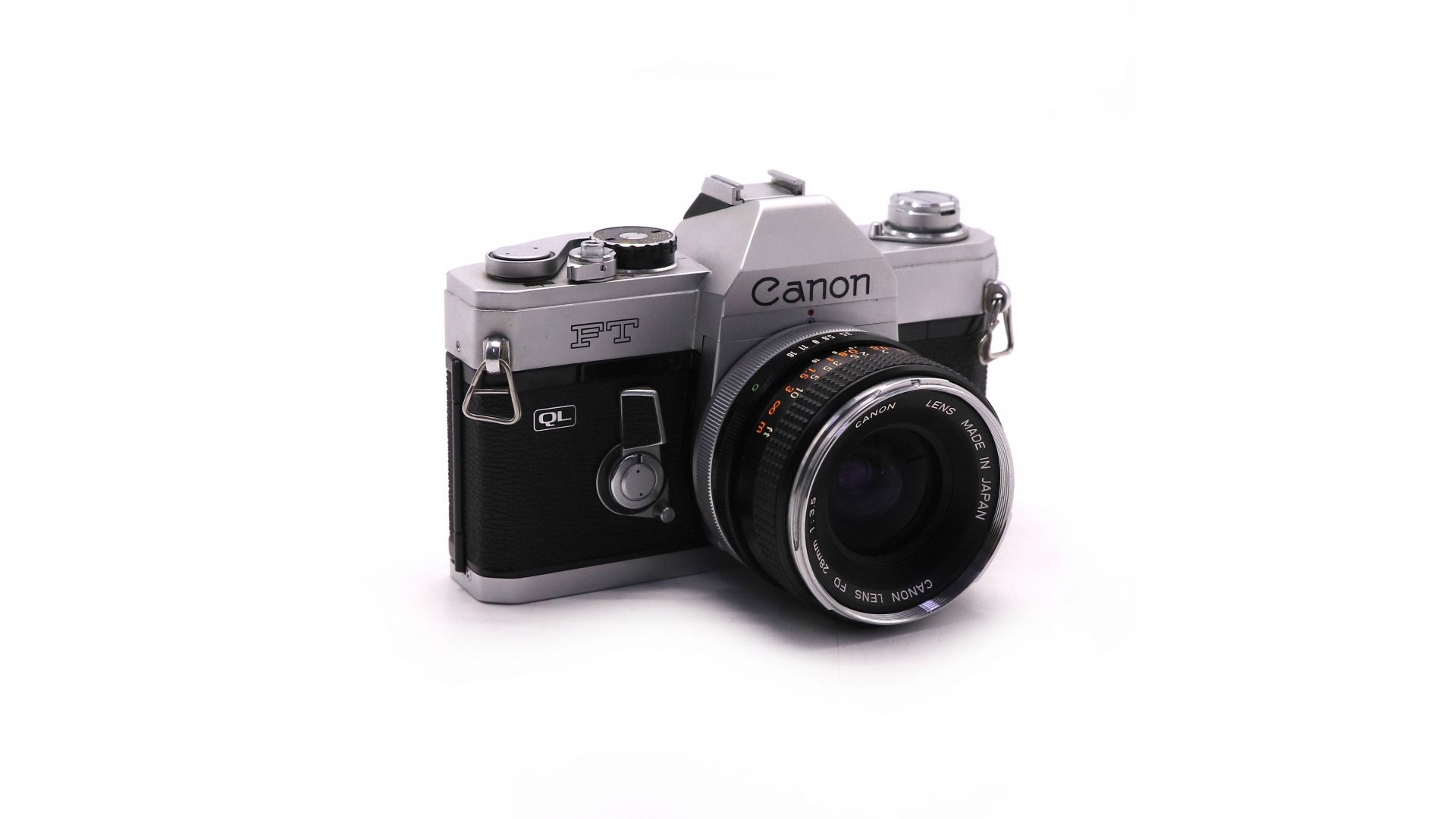 Классический комплект для ценителей пленочной фотографии: зеркальный фотоаппарат Canon FT QL с объективом Canon FD 28mm f/3.5.