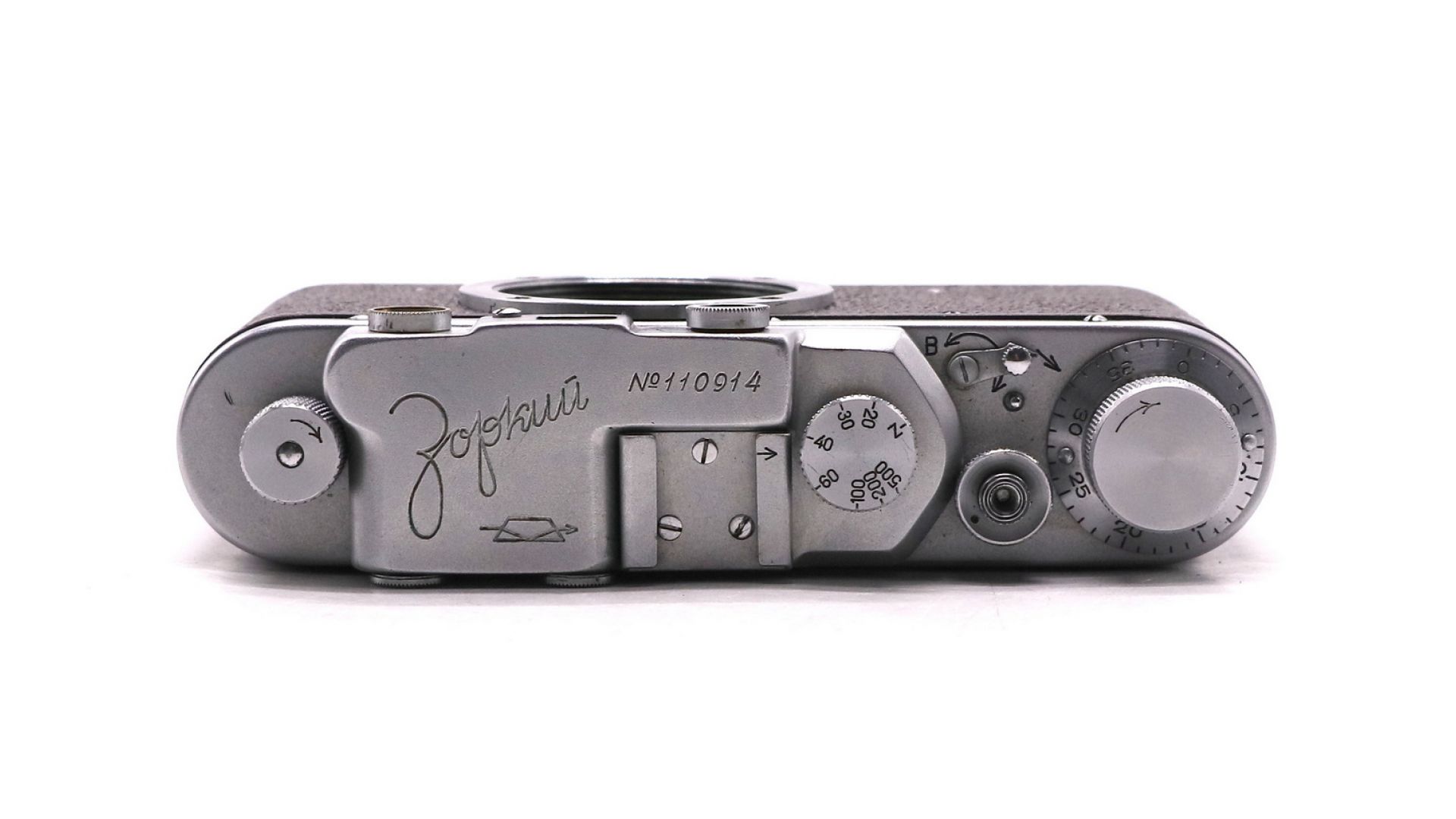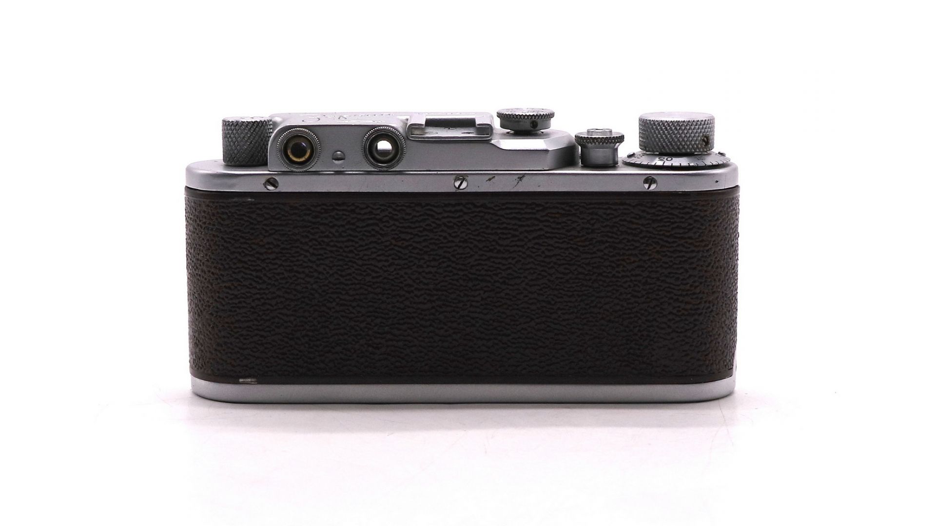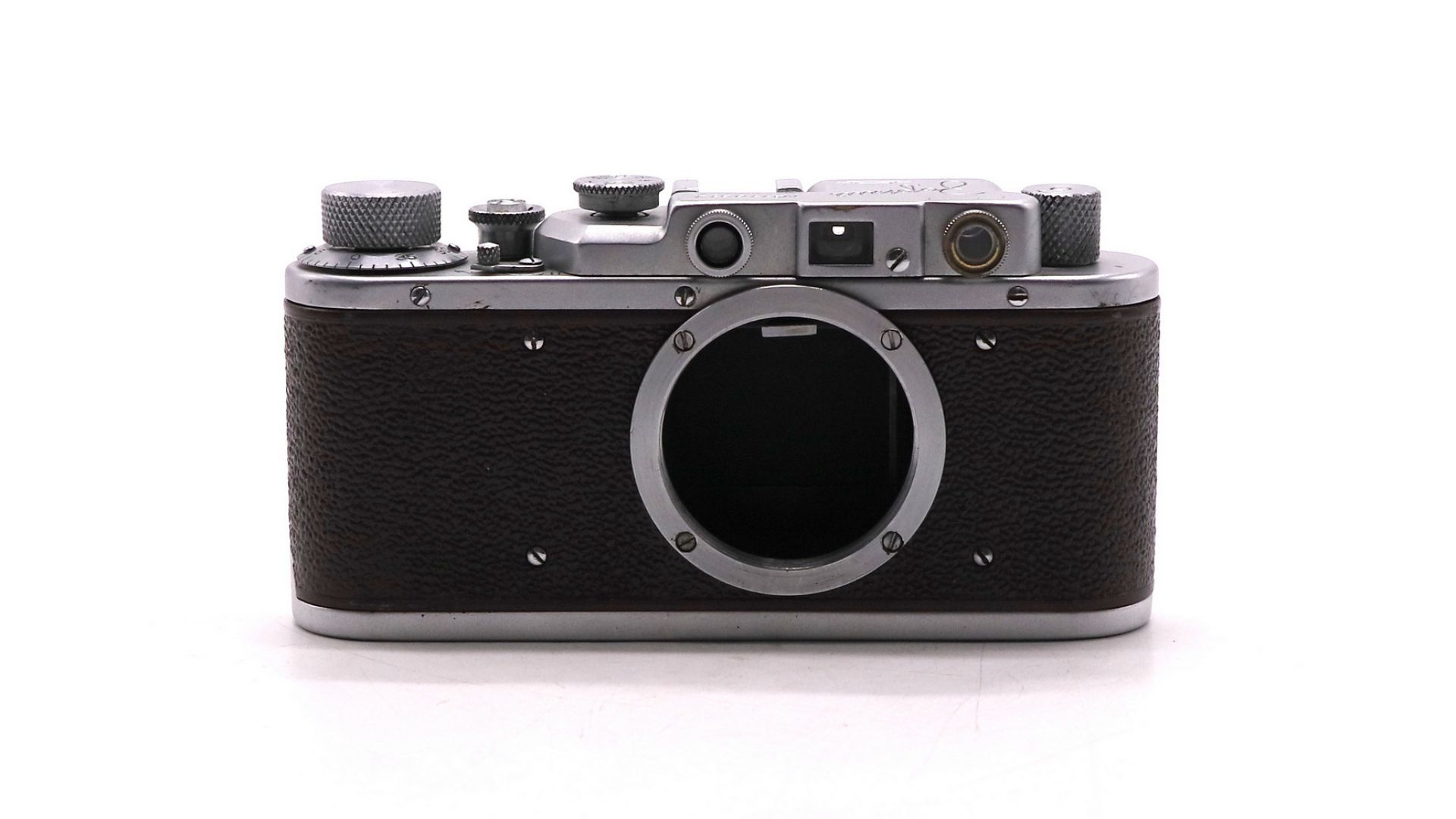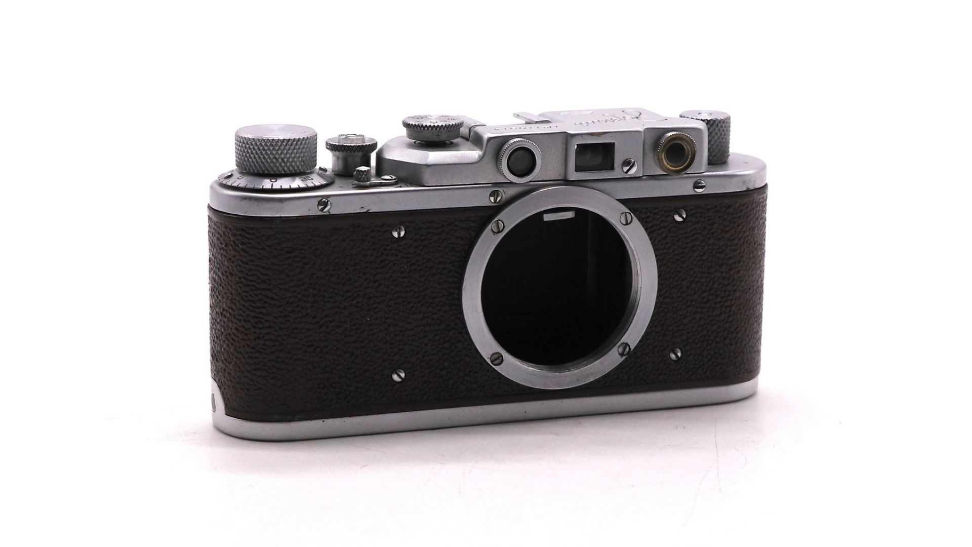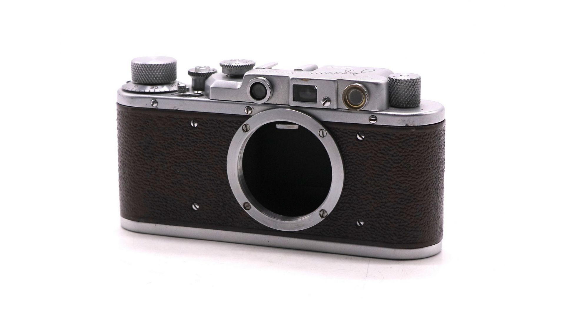 – Отличительные особенности: коричневый корпус металл+кожа, дальномер 38 мм, байонет M39×1, выдержки 1/25–1/500
