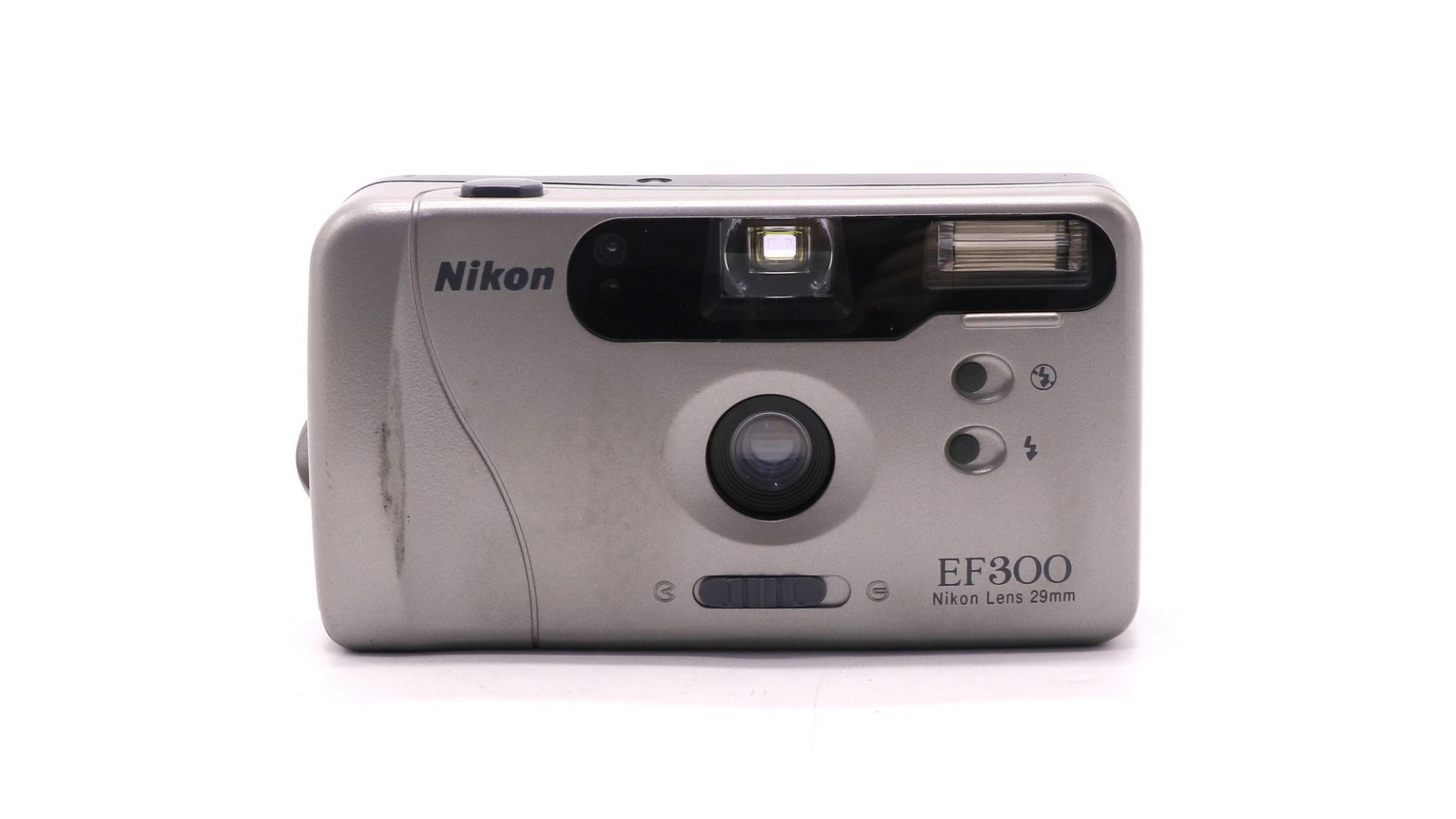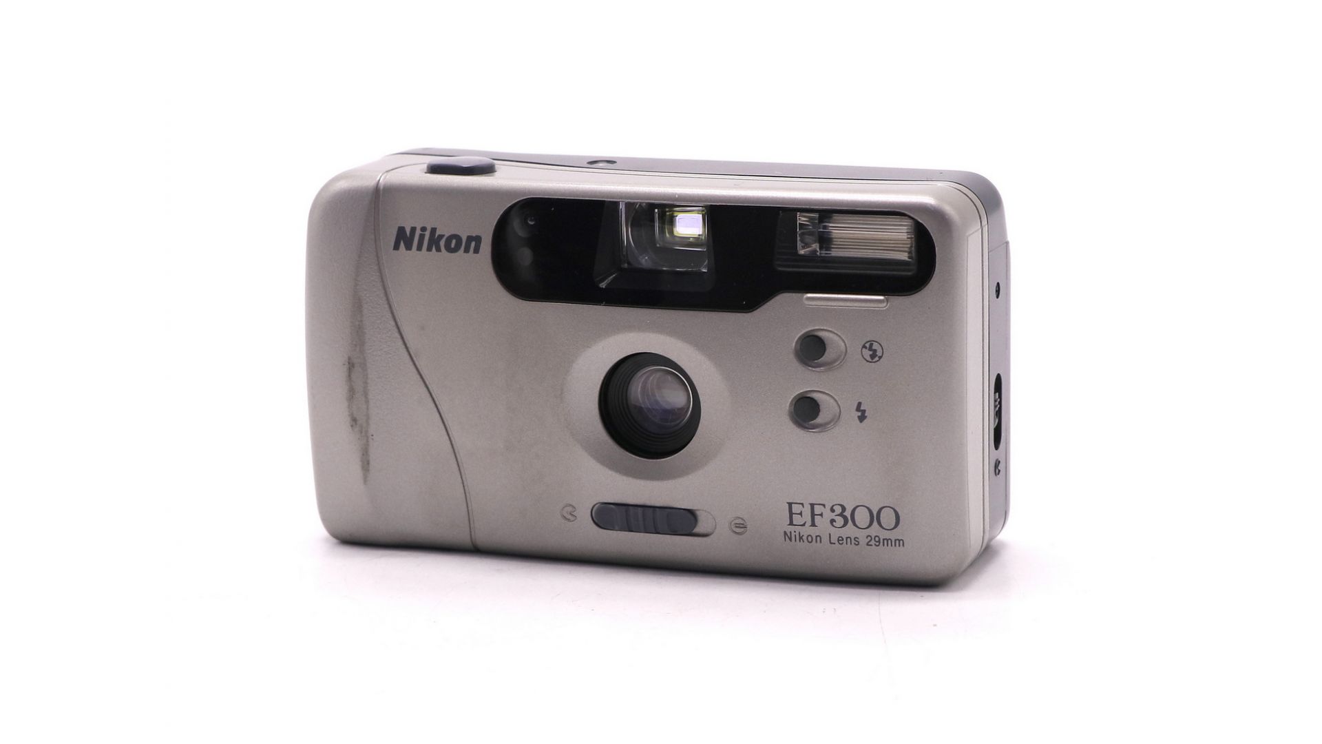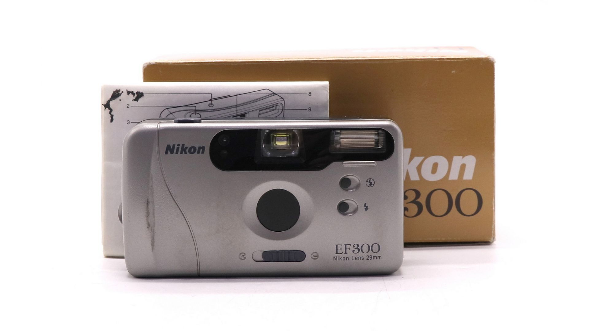Nikon EF300 — компактный плёночный фотоаппарат. Оснащён широкоугольным объективом 29 мм (f/4,5, 3 элемента в 3 группах) с фиксированной фокусировкой. Имеет автоматическую перемотку и продвижение плёнки, датчик DX для распознавания ISO (100–400). Встроенная вспышка работает в автоматическом режиме, включает функцию подавления «эффекта красных глаз». Питание — от двух батарей АА. В комплект входят чехол и ремешок. Корпус имеет незначительные следы эксплуатации, оптика и механика в идеальном состоянии. Отличный вариант для начинающих любителей плёночной фотографии.