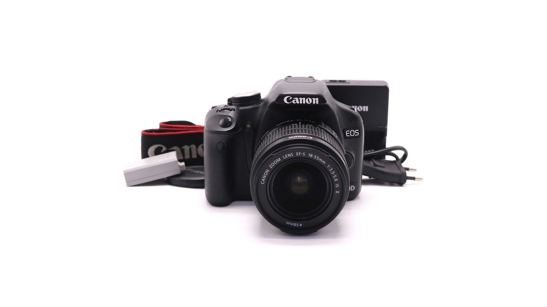 Комплектация:Объектив Canon EF-S 18-55mm f/3.5-5.6 IS II, аккумулятор, зарядное устройство, крышка объектива.
