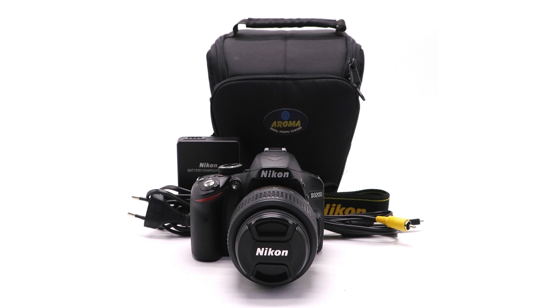 Комплектация:Сумка, аккумулятор, зарядное устройство, объектив Nikon 18-55mm 1:3.5-5.6G VR AF-S DX, ремень, крышка объектива, АV-кабель, USB-кабель, пульт ДУ.