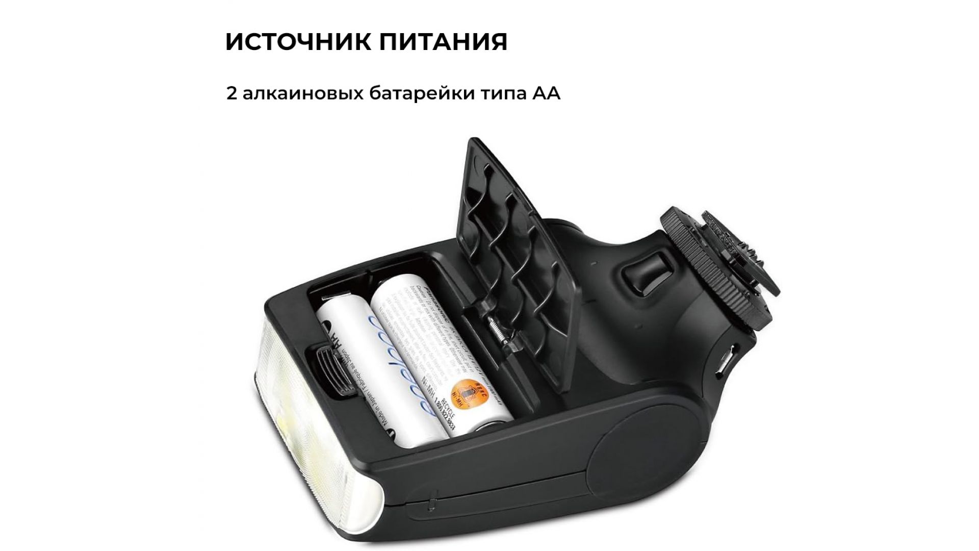 Встроенный яркий светодиод позволяет подсветить изображение при съемке видео. Разъем микро-USB позволяет заряжать аккумуляторы непосредственно в самой вспышке.