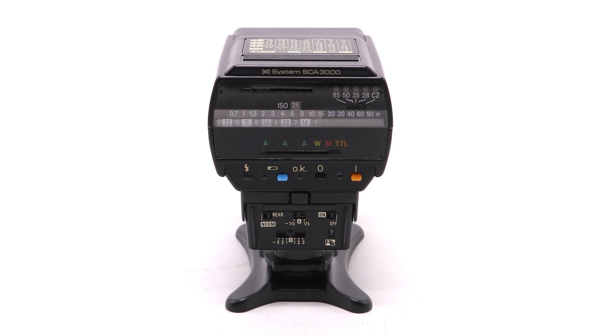 Автоматическая TTL-управляемая фотовспышка. Вращение головки - вертикальной плоскости вверх на 90 град. (60, 75, 90), вниз на -13 град. (-5, -13). В горизонтальной плоскости направо на 180 град. (90, 180), налево на 90 град. Ведущее число 32 (для ISO 100, зум-головка в положении 50мм). Подсветка автофокуса - до 9м. Импульс полной мощности, выбор соответствующей диафрагмы осуществляется по калькулятору на корпусе вспышке. Длительность импульса - от 1/400сек. до 1/20000сек. Автоматическое отключение - после 10 минут покоя. Питание - 4 батареи типа АА или дополнительные аккумуляторные батареи.
