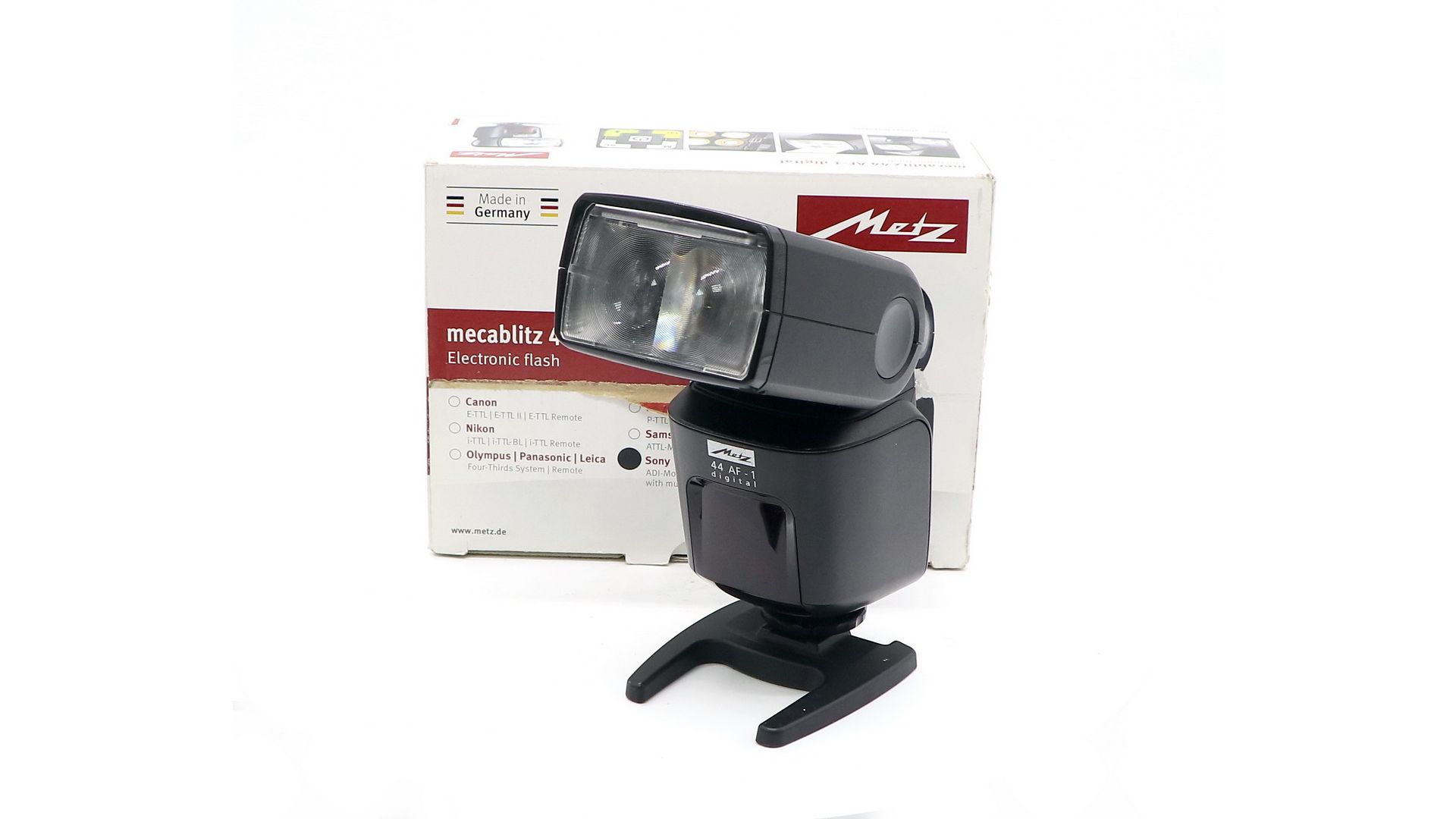 Фотовспышка Metz Mecablitz 44 AF-1 для Sony в хорошем состоянии, присутствуют следы эксплуатации. В комплекте коробка, документы. Производитель Германия.