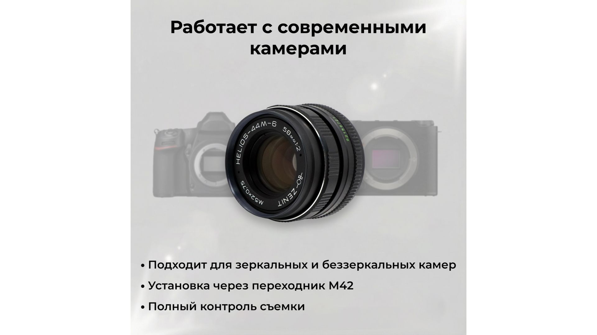 Подходит для современных зеркальных и беззеркальных камер через адаптер