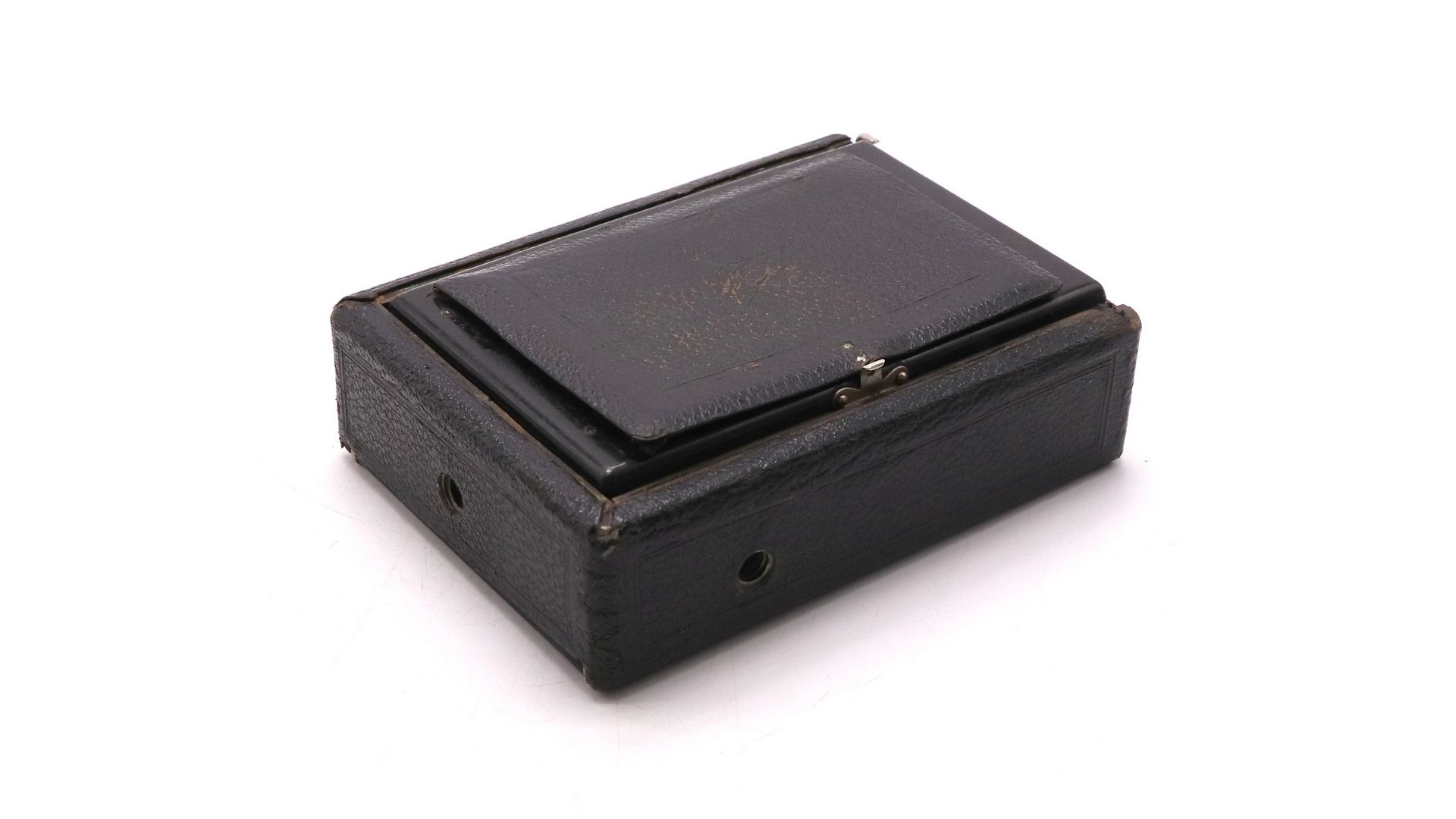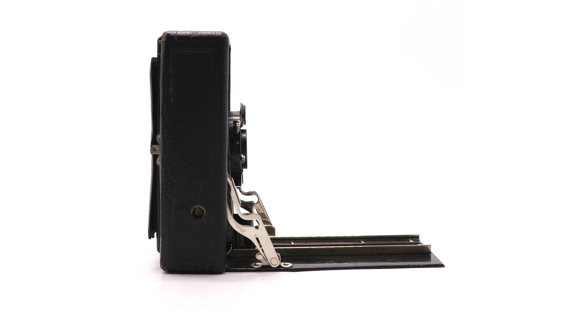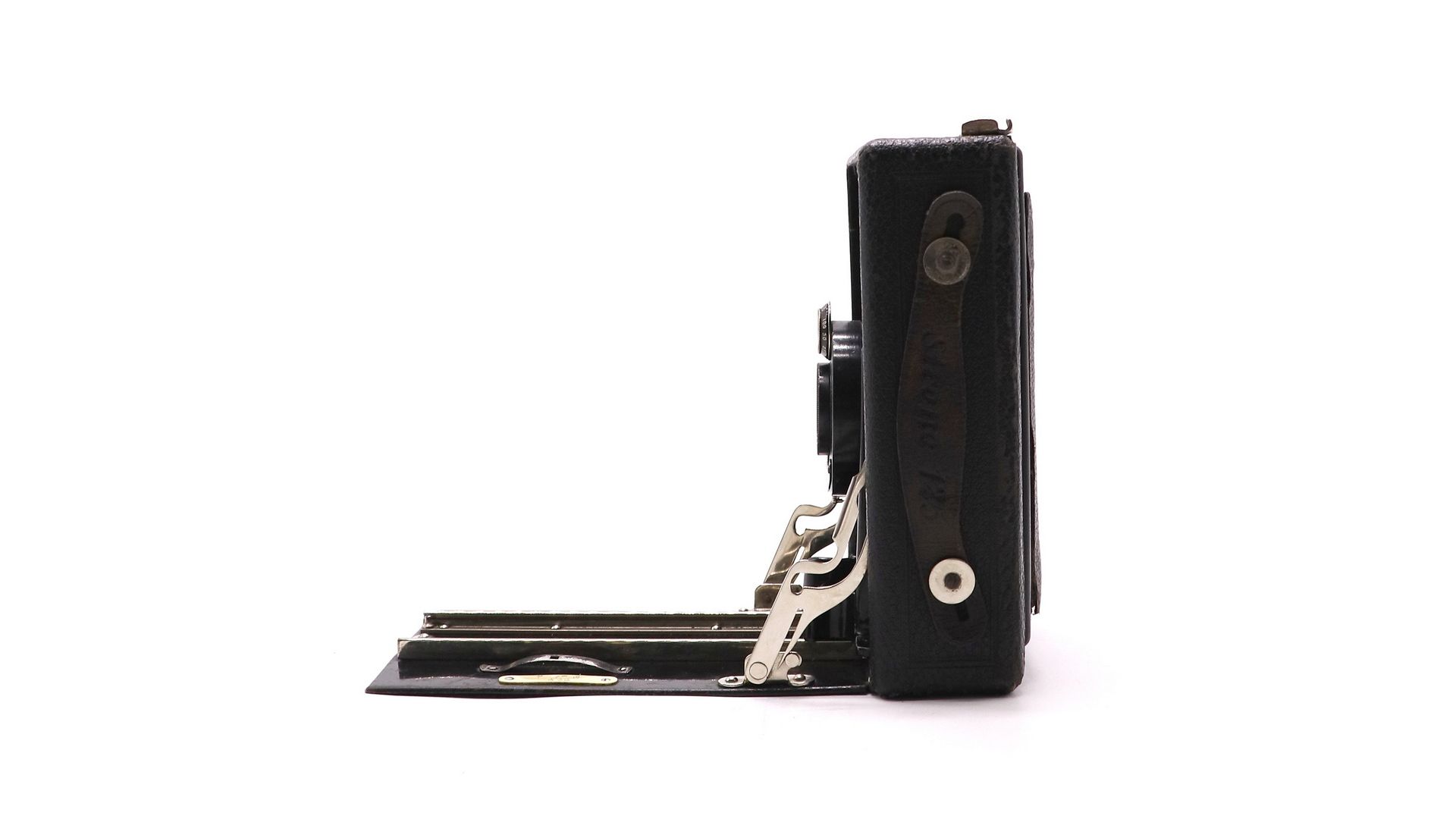 – Особенности модели: складной корпус из дерева и кожи; ручная фокусировка по матовому стеклу; визирование через откидную крышку; латунные механизмы и хромированные детали; компактный транспортный размер в сложенном виде.