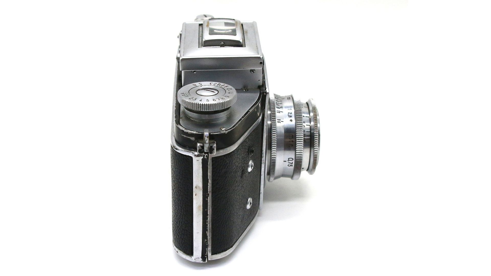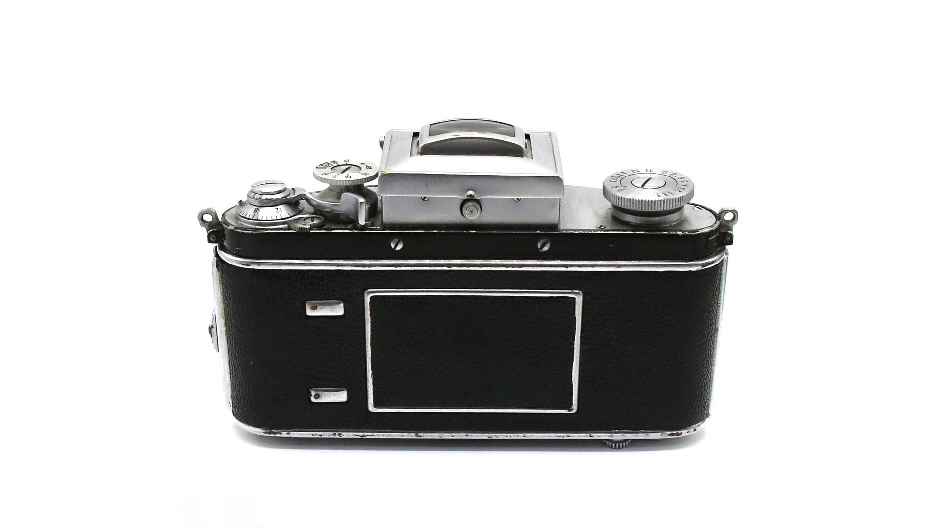 Видоискатель с плоско-выпуклой собирающей линзой обеспечивал сквозное визирование только при рабочем значении диафрагмы объектива. В закрытом состоянии складная светозащитная шахта блокировала спусковую кнопку. Кроме основного зеркального в шахту был встроен так называемый «спортивный» видоискатель рамочного типа. Для этого в передней стенке шахты открывался прямоугольный люк, служивший передней рамкой, а кадрирование производилось с уровня глаз, что было удобнее для репортажной съёмки. Фокусировка при этом могла производиться по метражной шкале или предварительно по матовому стеклу через лупу откидного люка.