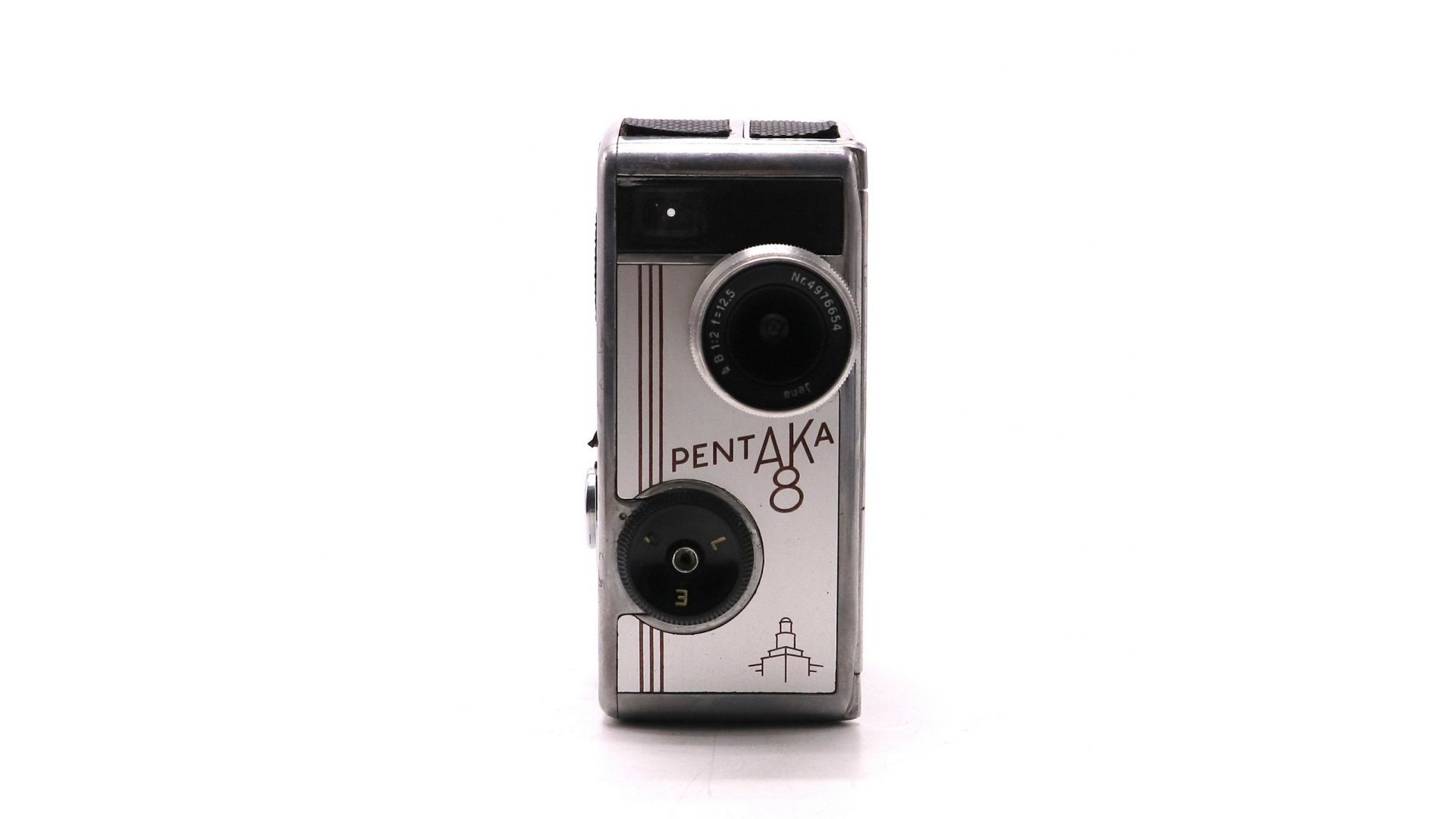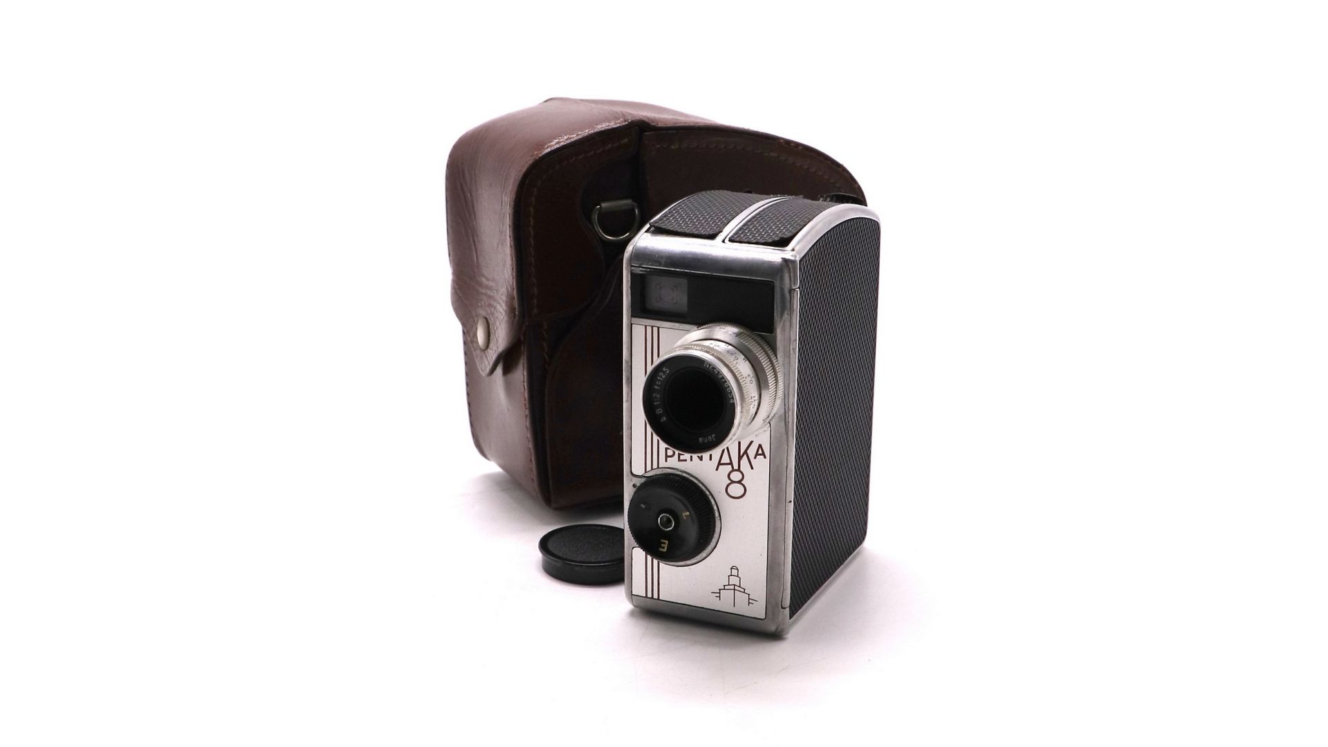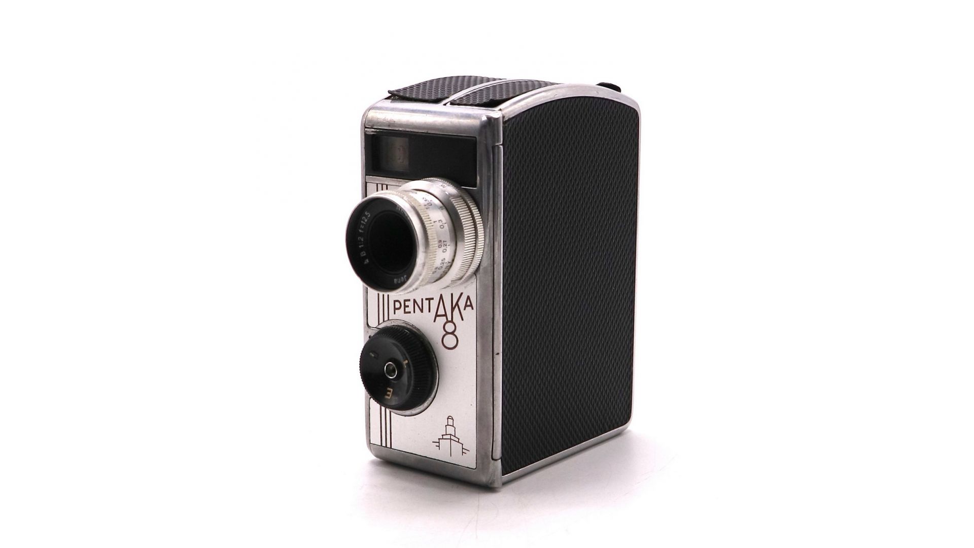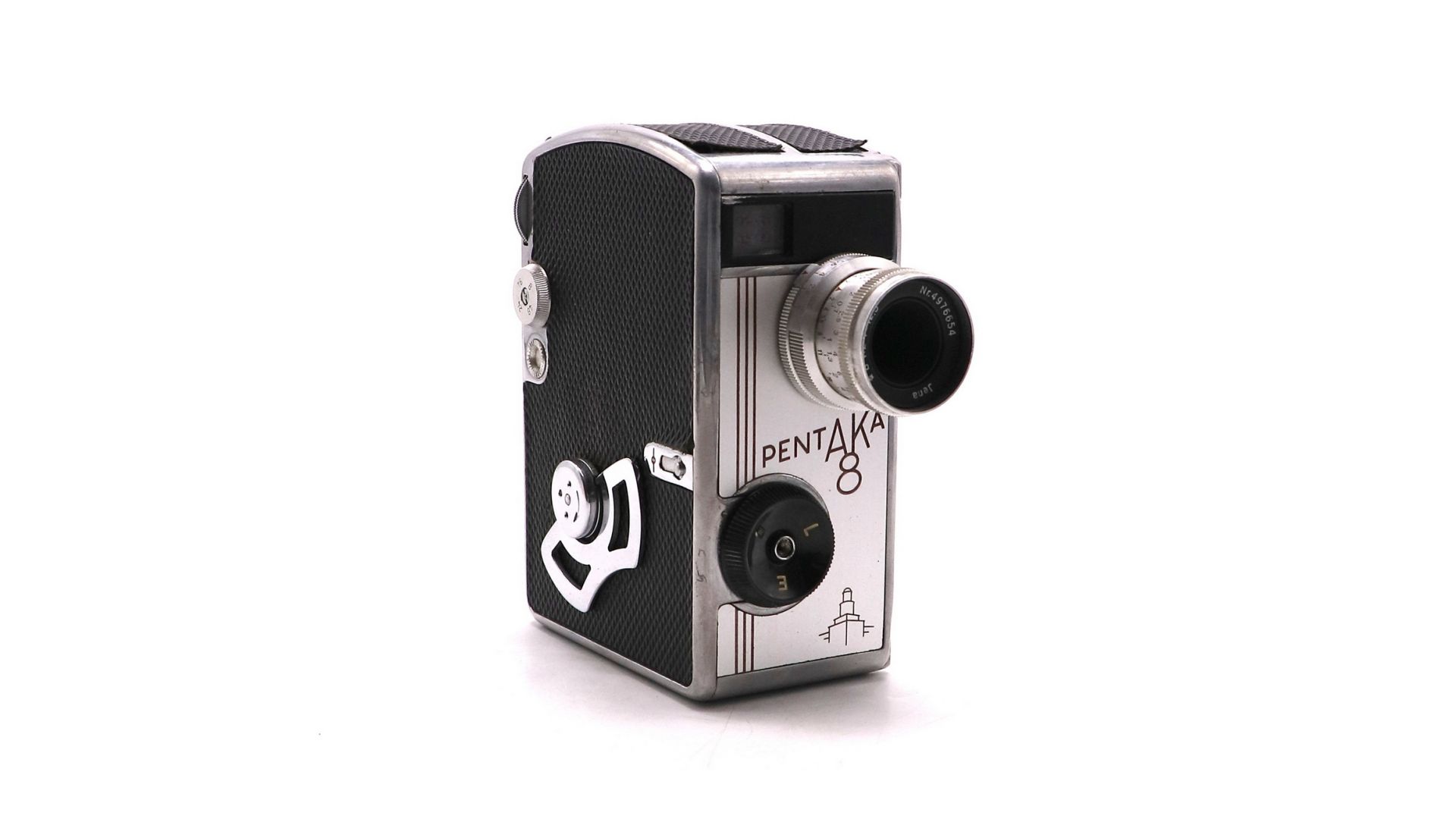 Привод камеры пружинный. Взвод пружины откидной скобой на правой боковой панели камеры. Одного завода пружины хватает на 2 метра протяжки плёнки. Камера оснащена объективом "Biotar" 2/12,5 мм. производства Carl Zeiss Jena". Байонетное крепление позволяет легко и быстро менять штатный объектив на сменные с фокусным расстоянием 25 и 40 мм. Камера позволяет производить съёмку с четырьмя скоростями — 8, 16, 24, 48 к/сек. и покадровая. Выдержки затвора от 1/15 до 1/100 в зависимости от частоты кадров. Размер кадра 2х8 мм, пленка - 16 мм. Pentaka 8 очень хорошая и надёжная кинокамера, способная удовлетворить потребности любого кинолюбителя.