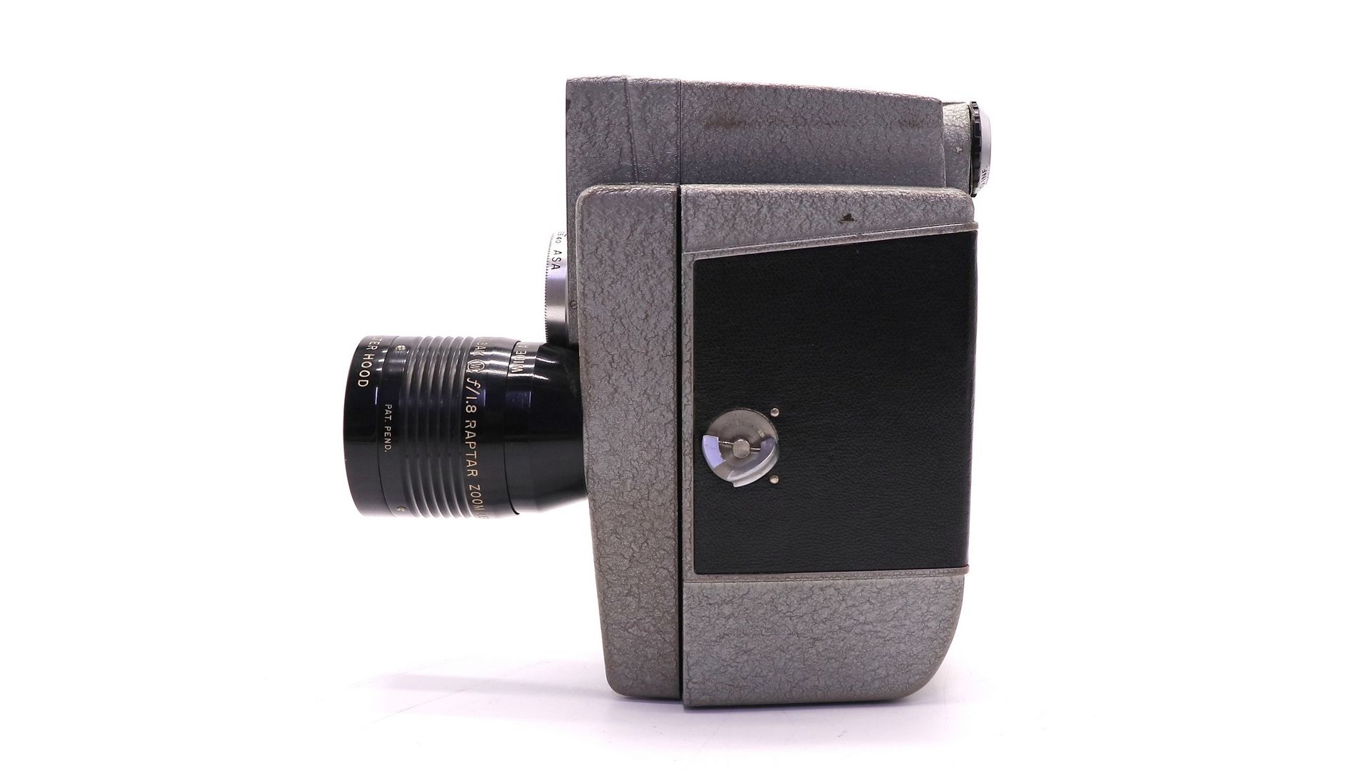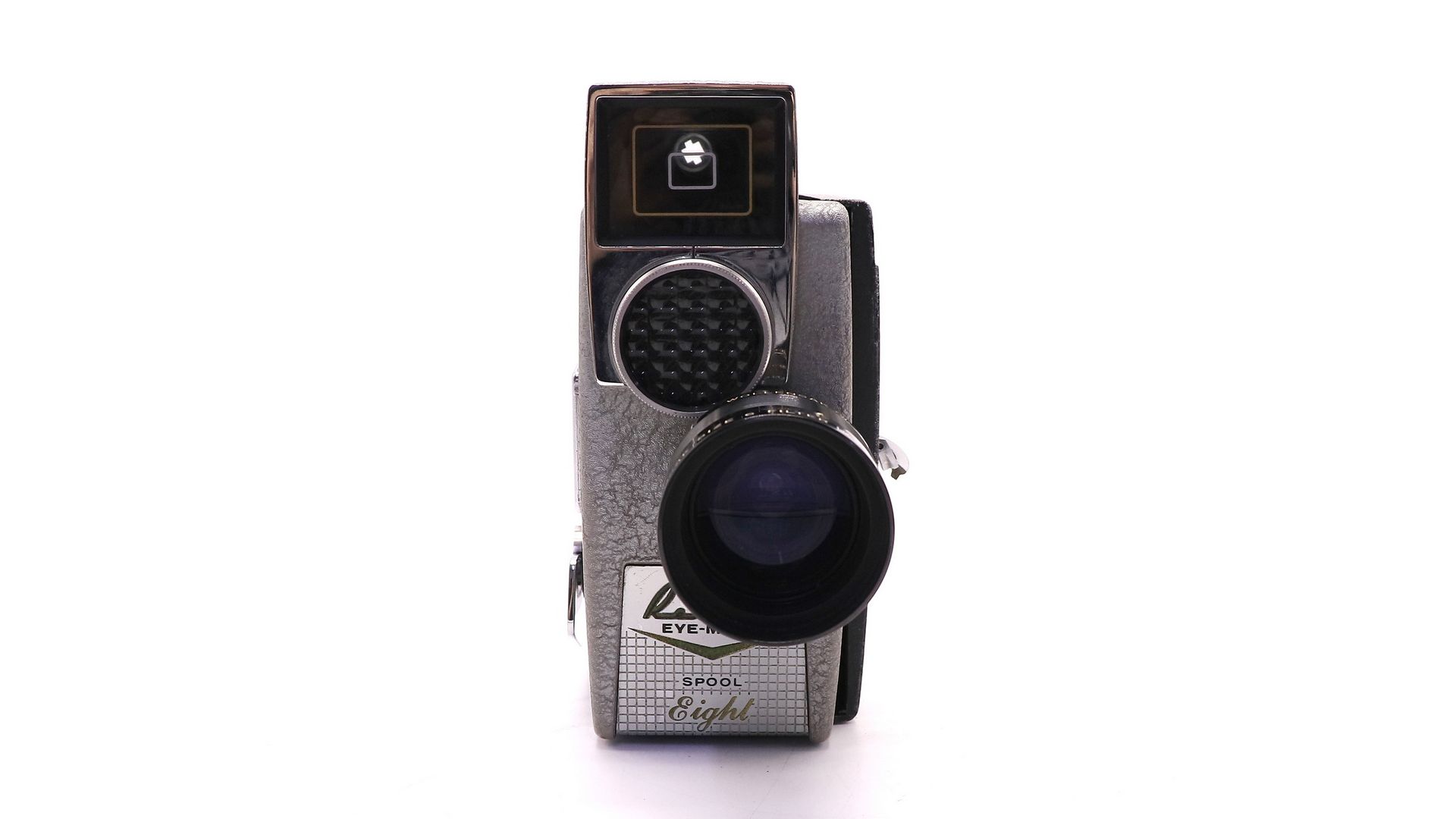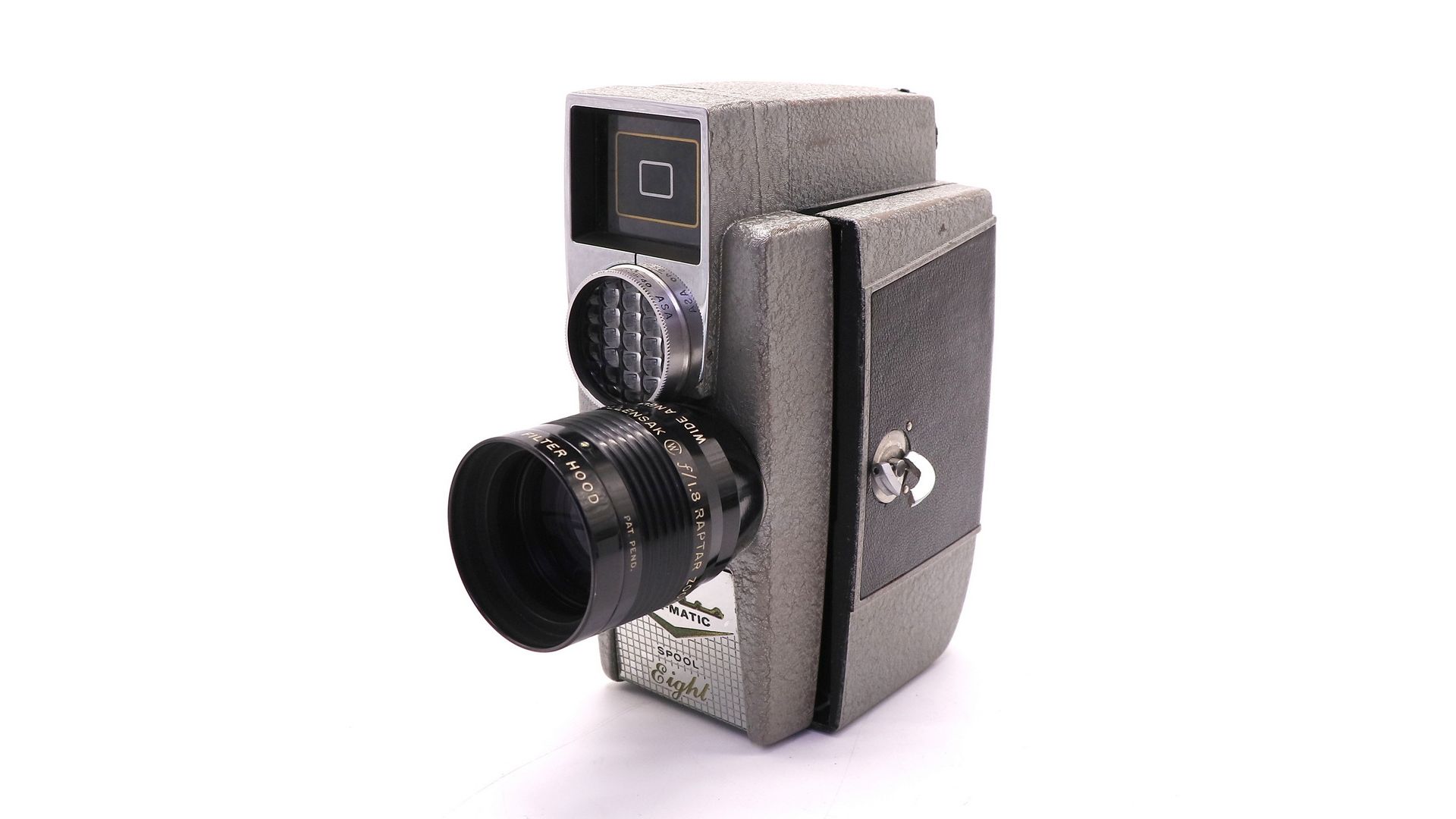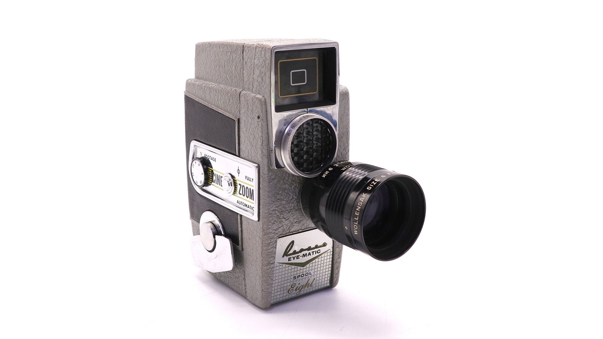 Кинокамера Revere Eye-Matic Spool Eight 8mm - винтажная модель, выпущенная в 1950-х годах. Имеет широкоугольный 9-миллиметровый зум-объектив Wollensak и автоматический мотор.