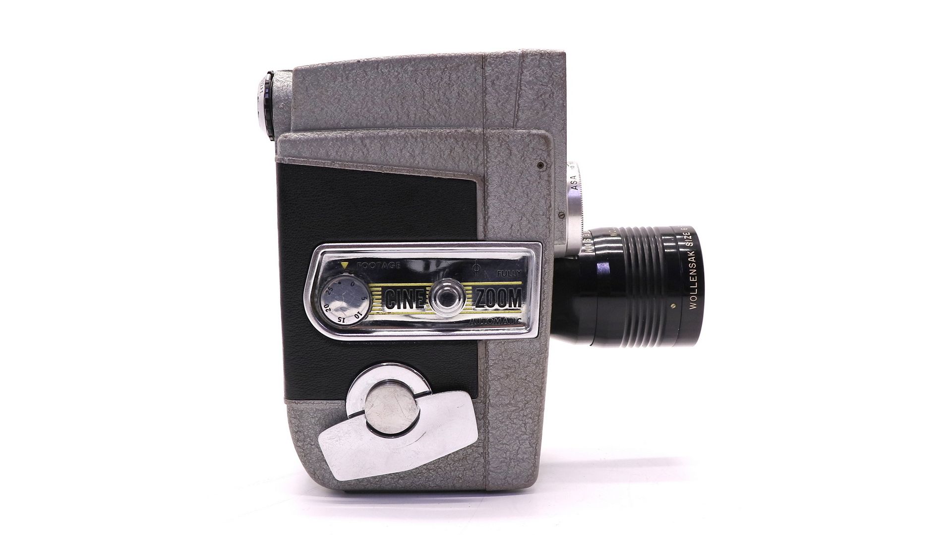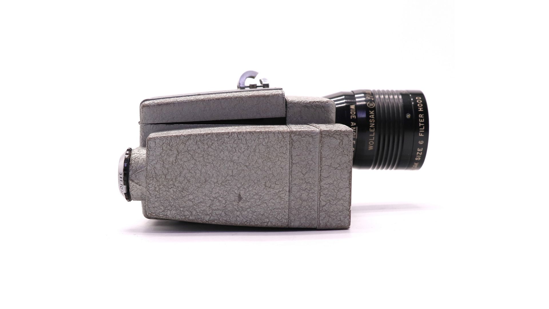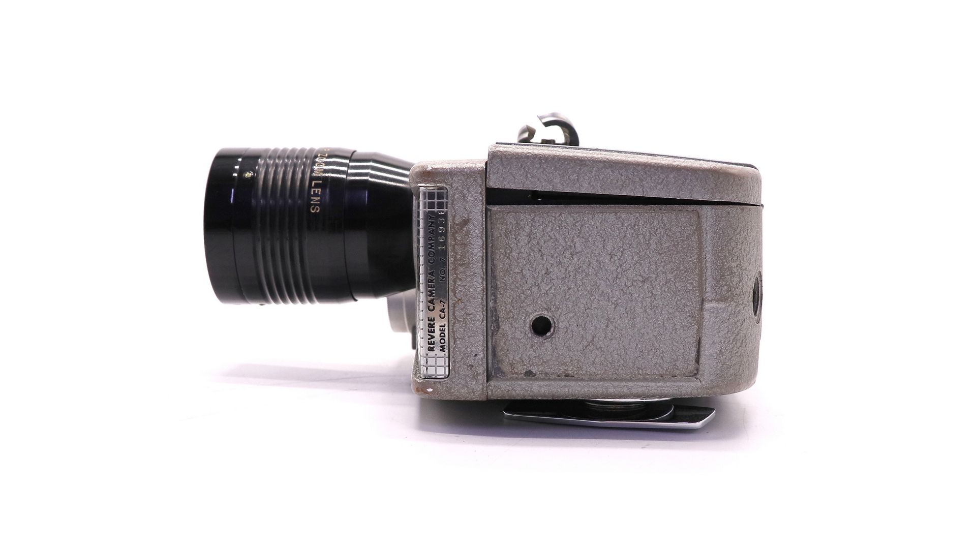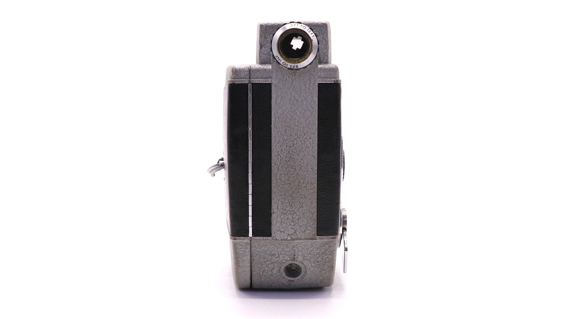 Кинокамера Revere Eye-Matic Spool Eight 8mm - винтажная модель, выпущенная в 1950-х годах. Имеет широкоугольный 9-миллиметровый зум-объектив Wollensak и автоматический мотор.