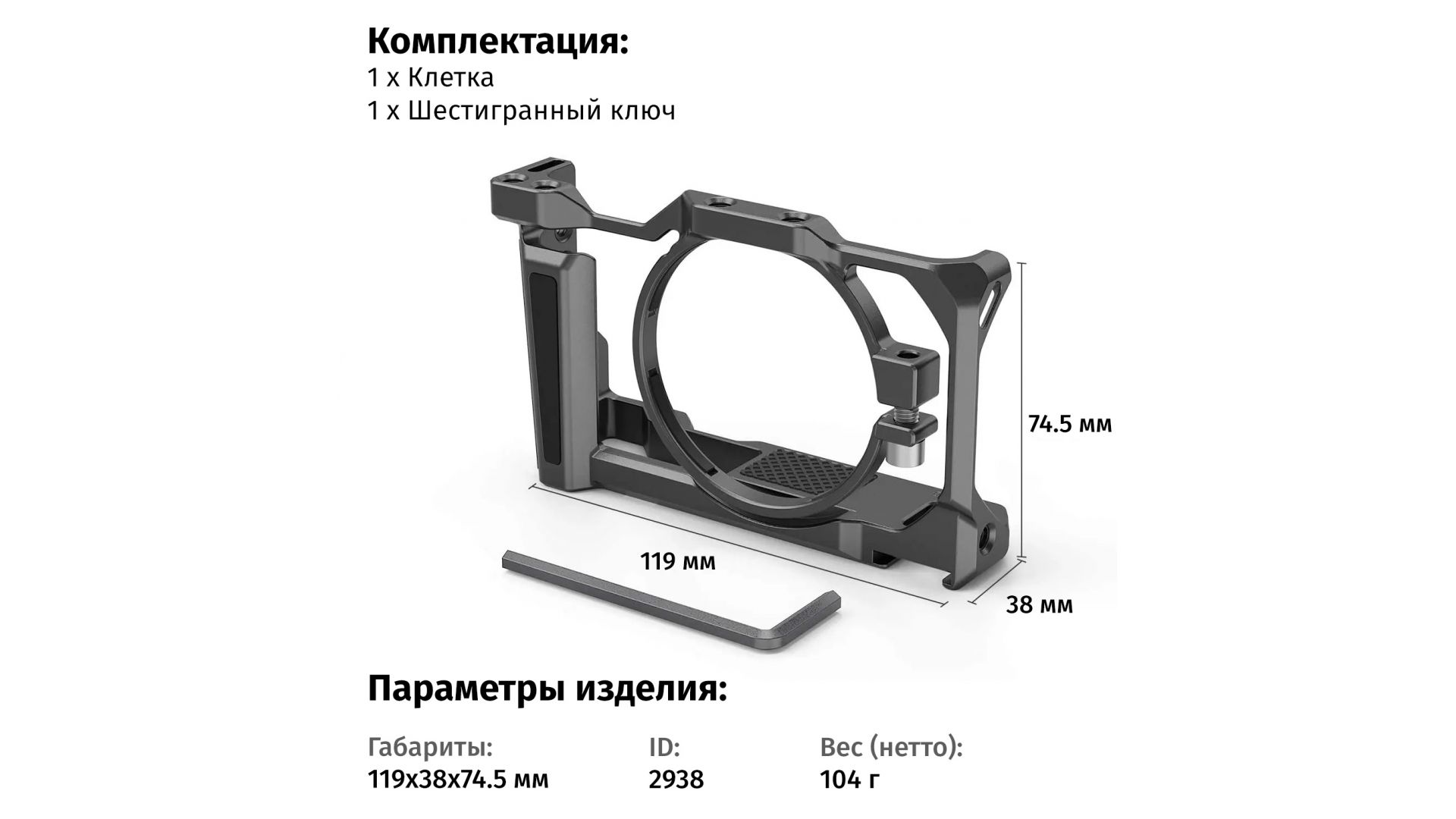Комплектация:Клетка SmallRig 2938, шестигранный ключ, упаковка