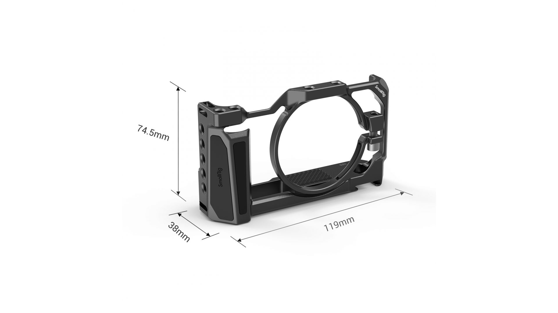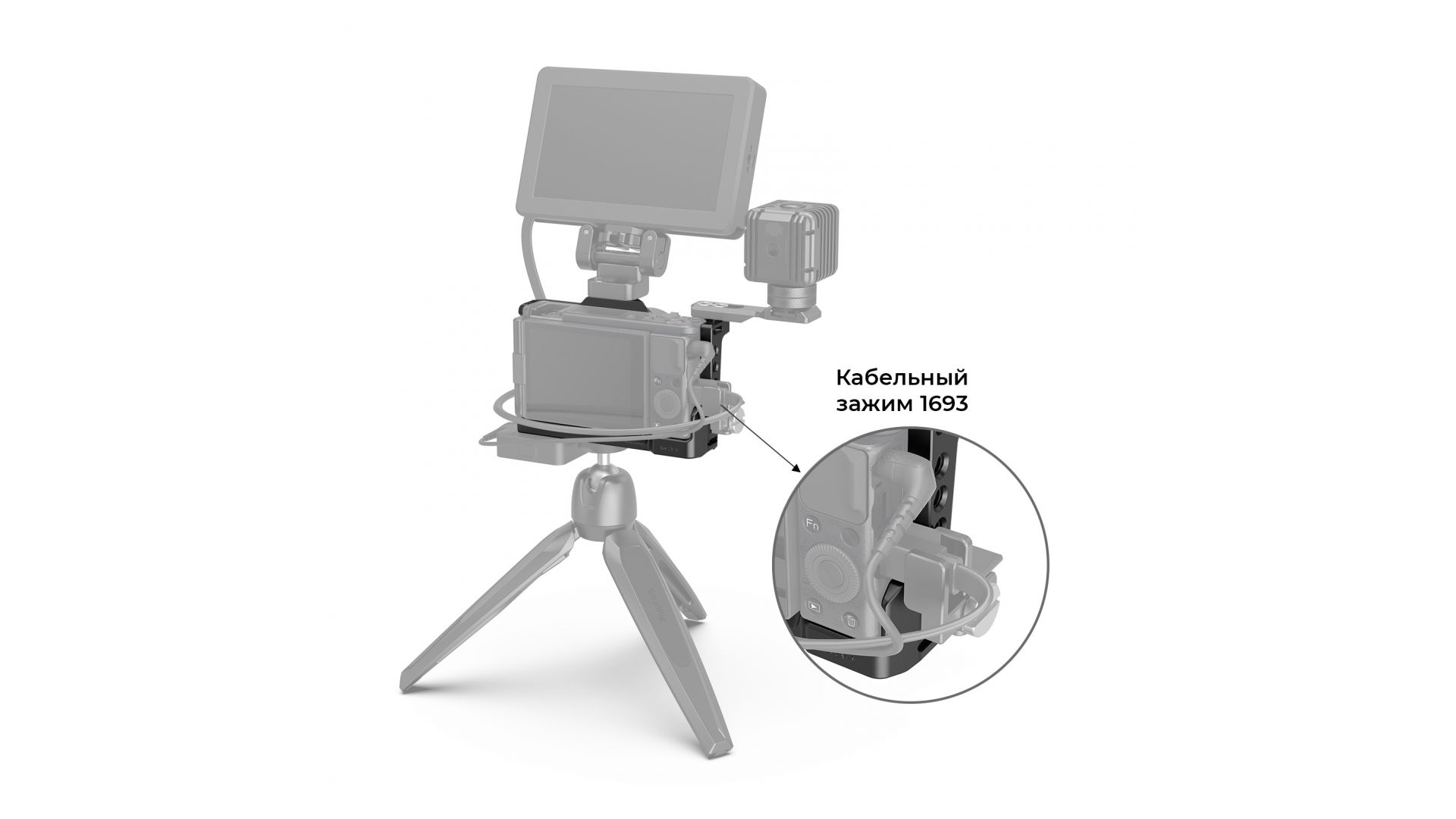 Зажим с силиконовой вставкой надежно фиксирует клетку на корпусе камеры. Несколько отверстий с резьбой ¼” на верхней площадке можно использовать для установки адаптера SmallRig 2044 и верхней ручки SmallRig 2821, а встроенный разъем «холодный башмак» для микрофона или света. Чтобы исключить случайное выдергивание кабеля HDMI на клетку можно установить фиксатор SmallRig 1693. Также с каждой стороны клетке имеются проушины для ремня.