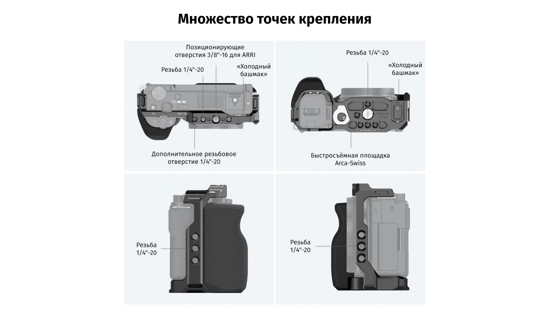 Функциональная и удобная клетка для устройств Sony ZV-E10. Конструкция имеет резьбовые отверстия 1/4" и ARRI 3/8" для установки различных дополнительных аксессуаров. В нижней части предусмотрена встроенная быстросъемная пластина Arca.