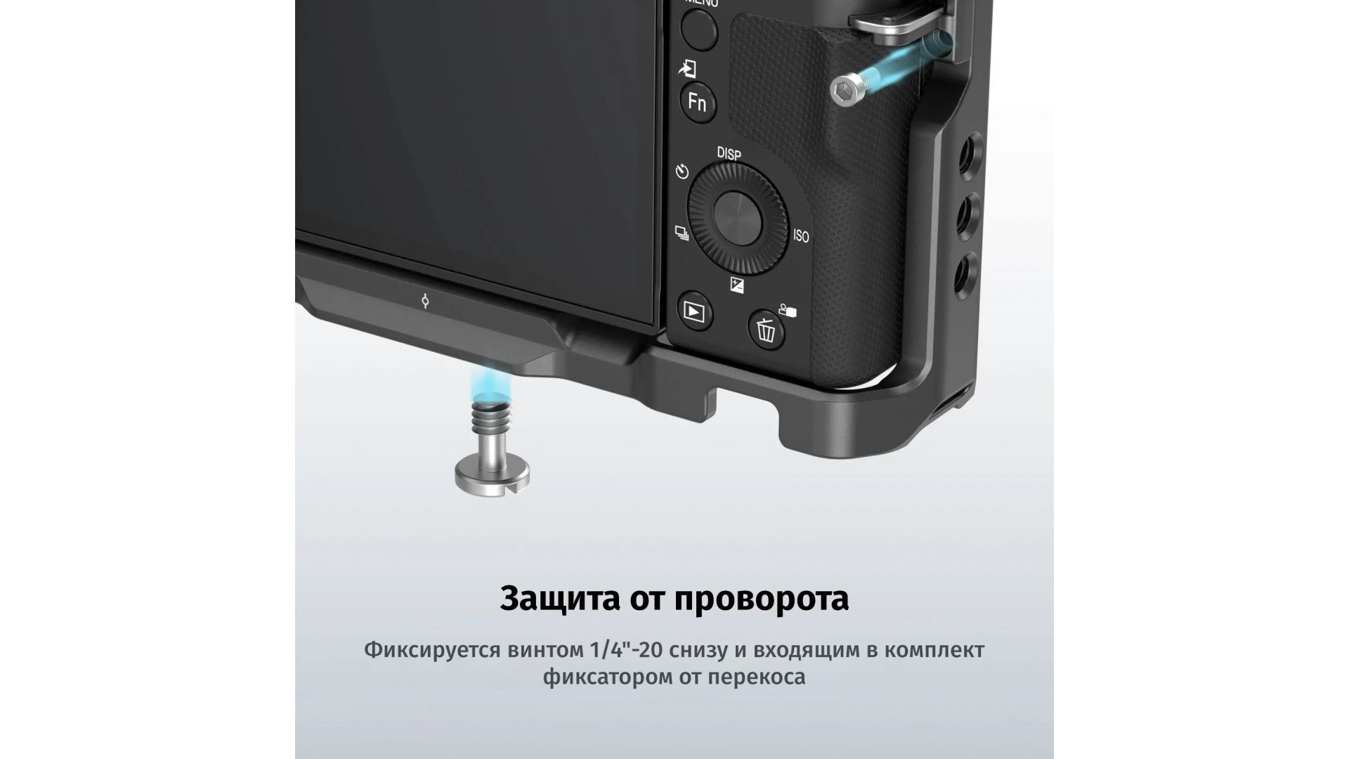 Клетка имеет в верхней и нижней части резиновые прокладки. Благодаря им исключается образование потертостей и царапин на поверхности камеры. Поставляется со съемным фиксатором, исключающим скручивание, и с магнитной отверткой для удобства сборки/разборки.