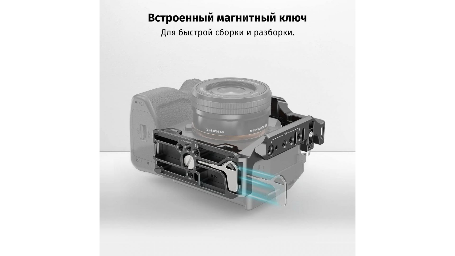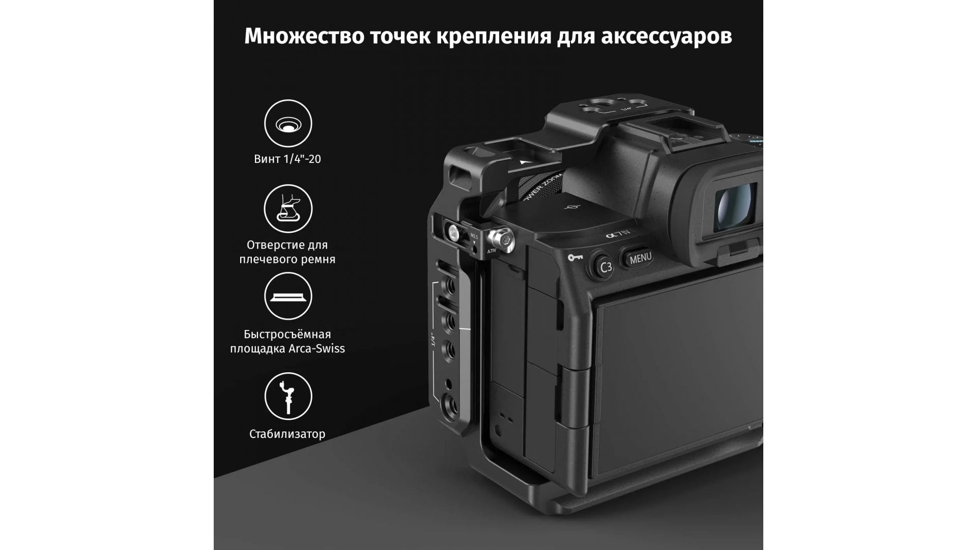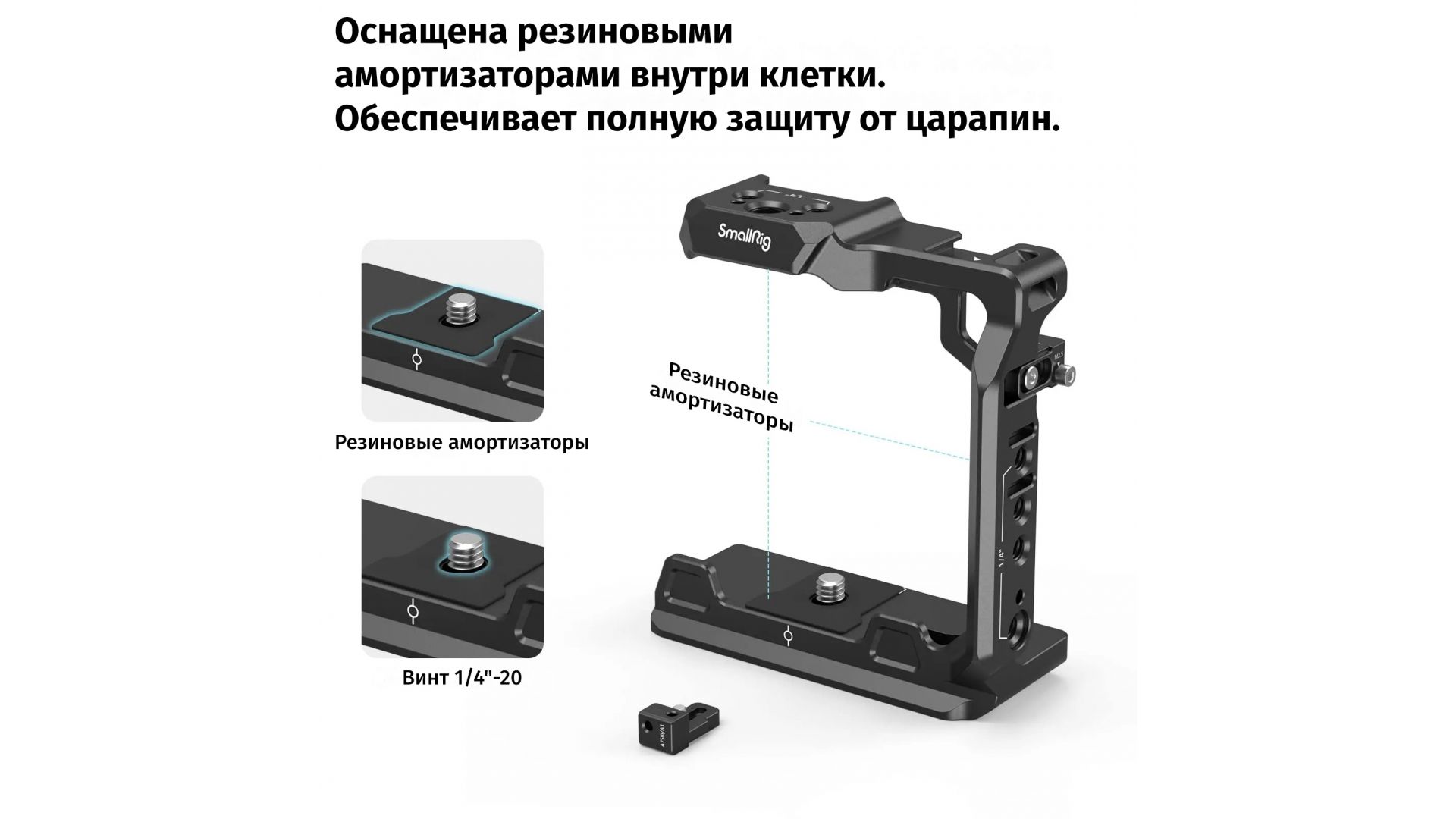 Несколько типов крепления - отверстия с резьбой 1/4”, 3/8”, ARRI 3/8” и разъем «холодный башмак» дают возможность установить на клетку необходимые аксессуары. Встроенная площадка совместимая с Arca Swiss позволяет быстро ставить и снимать клетку с электронных стабилизаторов DJI RS 2/RSC 2.
