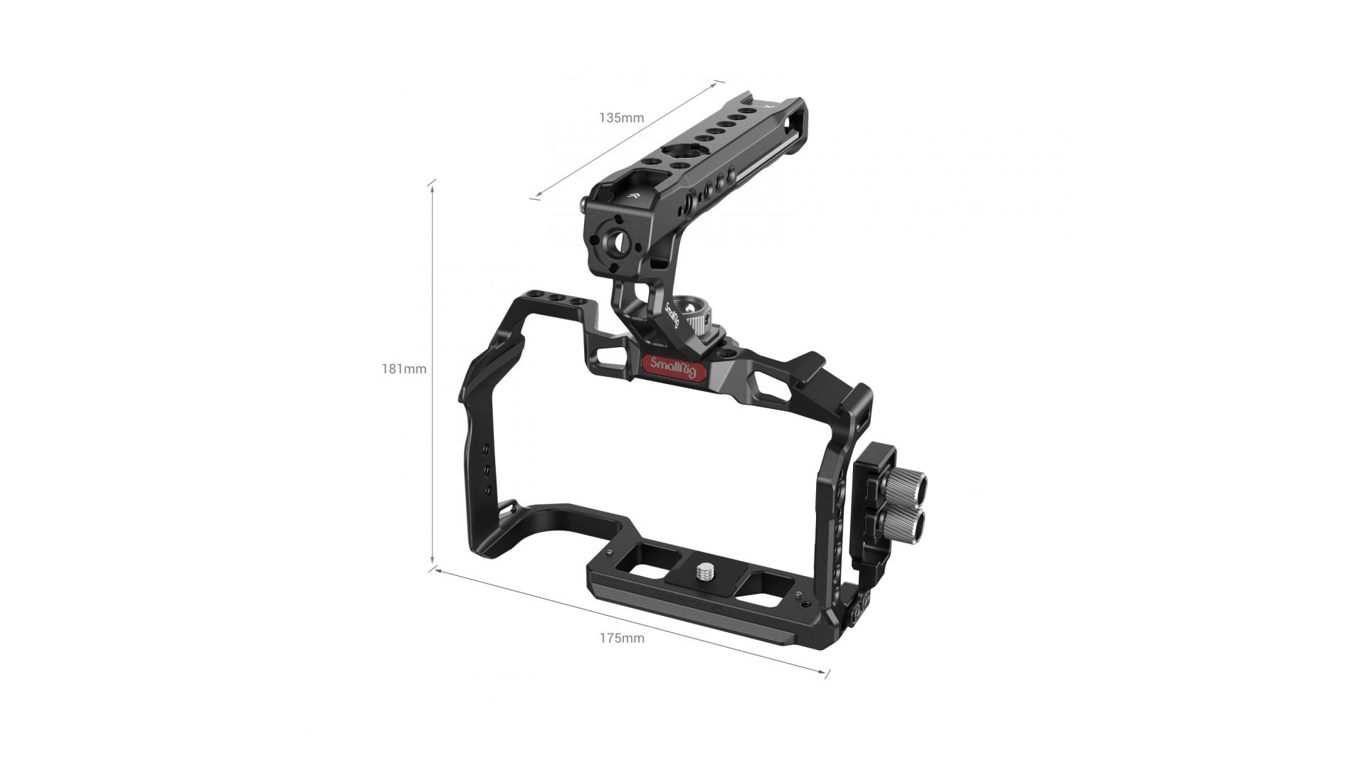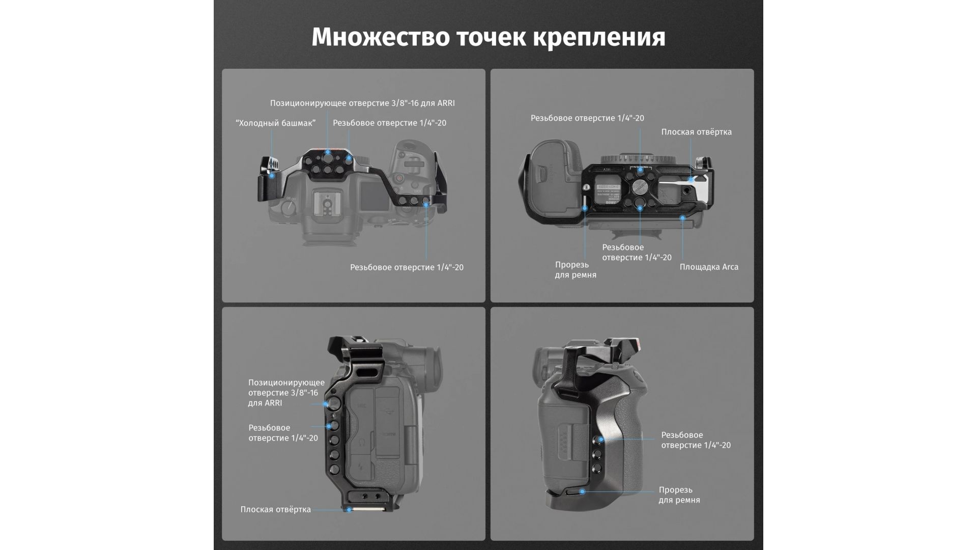 Клетка и рукоятка имеют несколько резьбовых соединений 1/4"-20 и 3/8"-16 для аксессуаров. Также на клетке имеется один зажим для стержня диаметром 15 мм и направляющая NATO для добавления различных аксессуаров. Верхняя ручка крепится к клетке с помощью противопрокручивающего крепления типа ARRI 3/8"-16. Вы можете установить клетку на штатив с помощью резьбовых соединений 1/4"-20 или 3/8"-16. Клетка также оснащена встроенным профилем Arca Swiss в основании для установки на совместимые штативы и стабилизаторы.