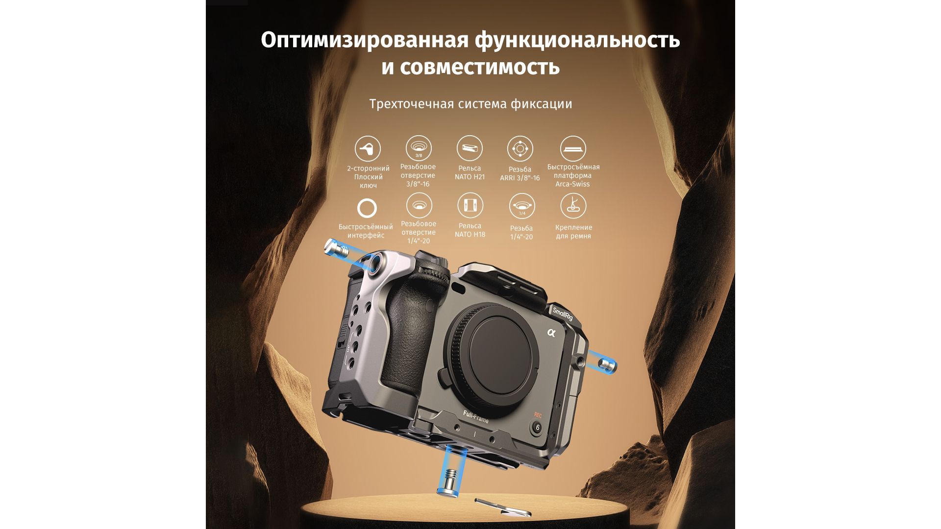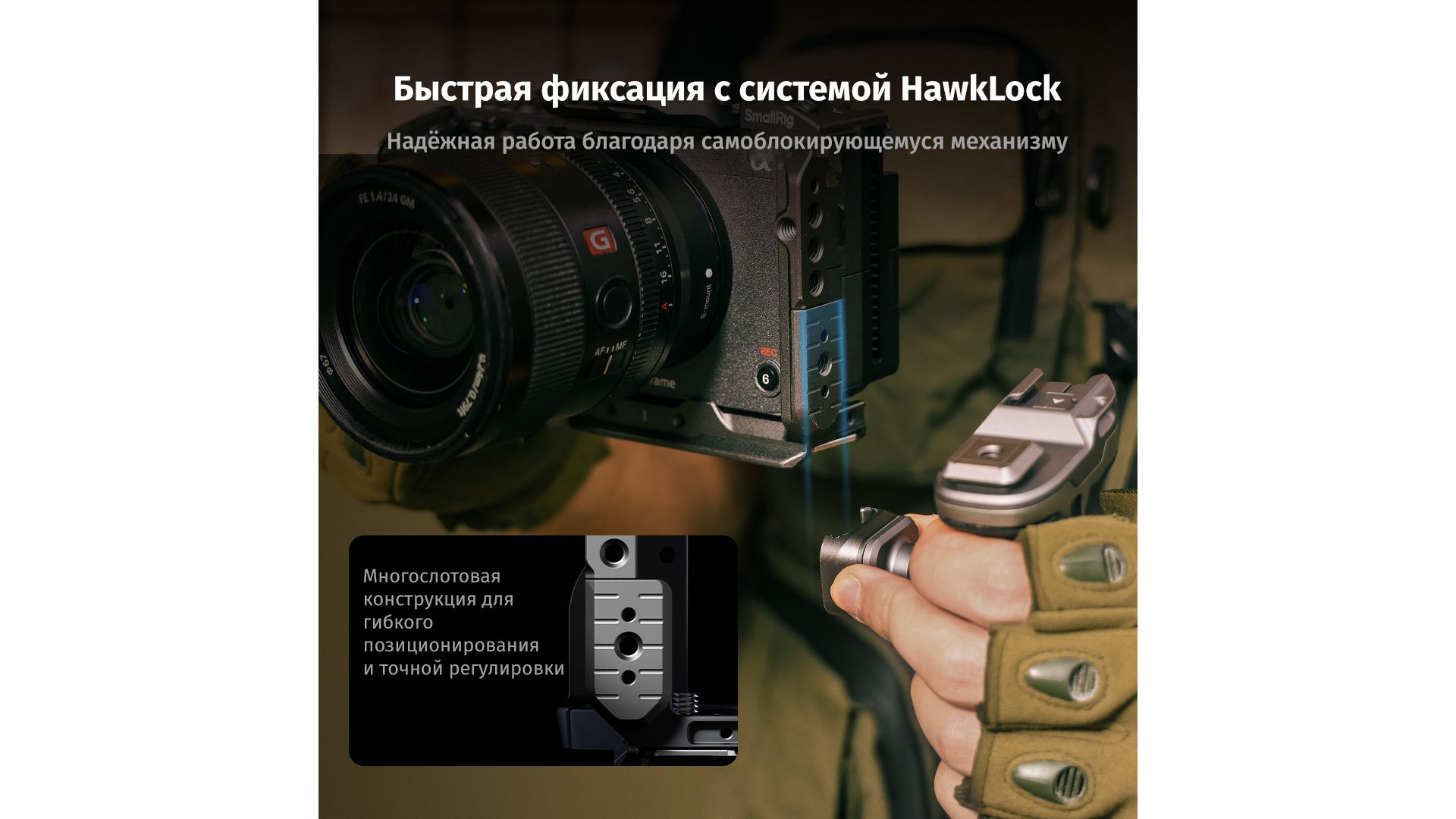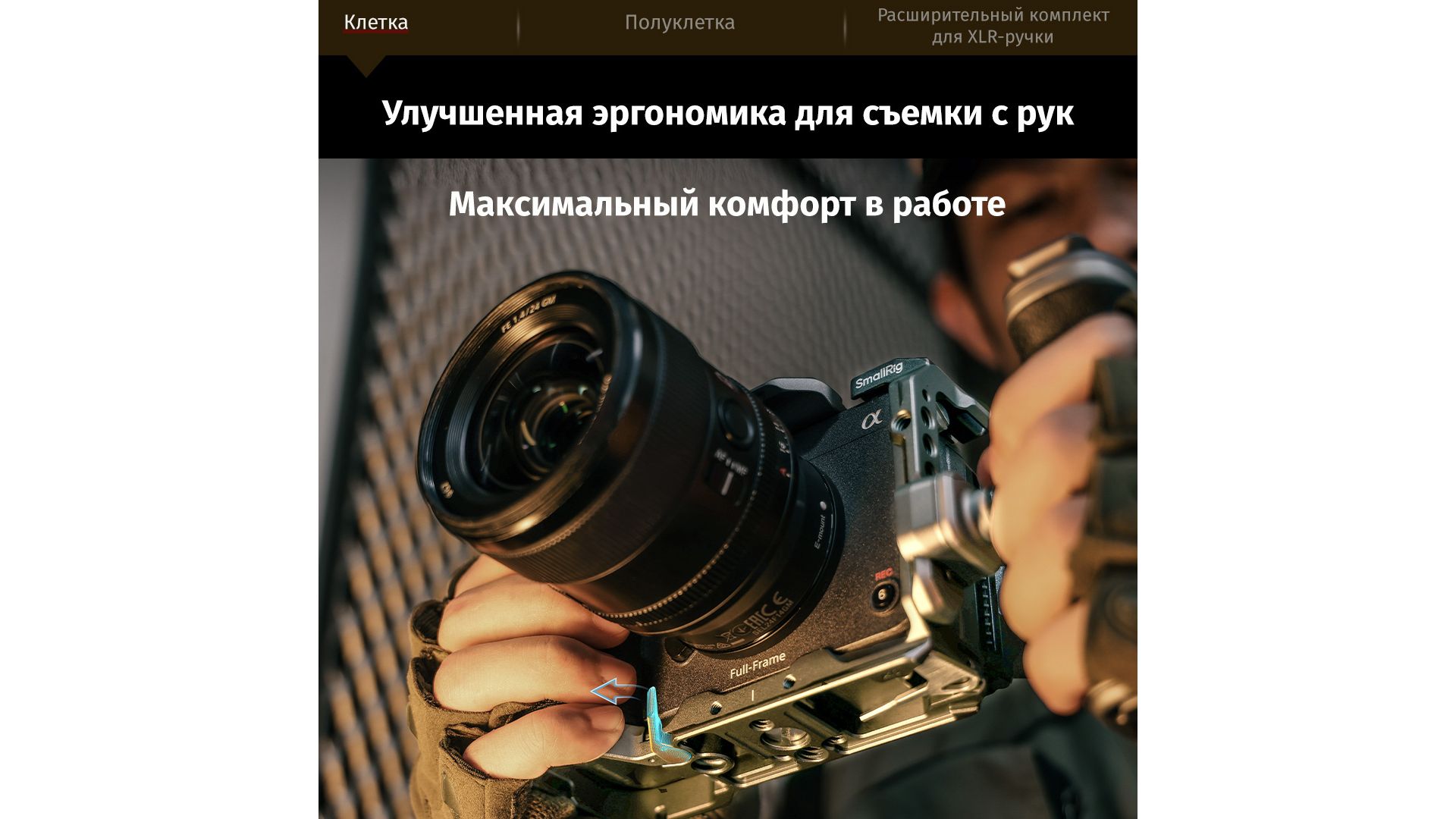 Модульная клетка с системой HawkLock для быстрого монтажа аксессуаров без инструментов. Темно-серое анодированное покрытие, съемная рельса NATO под рукоятку Sony XLR с сохранением доступа к разъемам. Интегрирована база Arca-Swiss, резьбы 1/4" и ARRI 3/8" для штативов и стабилизаторов.