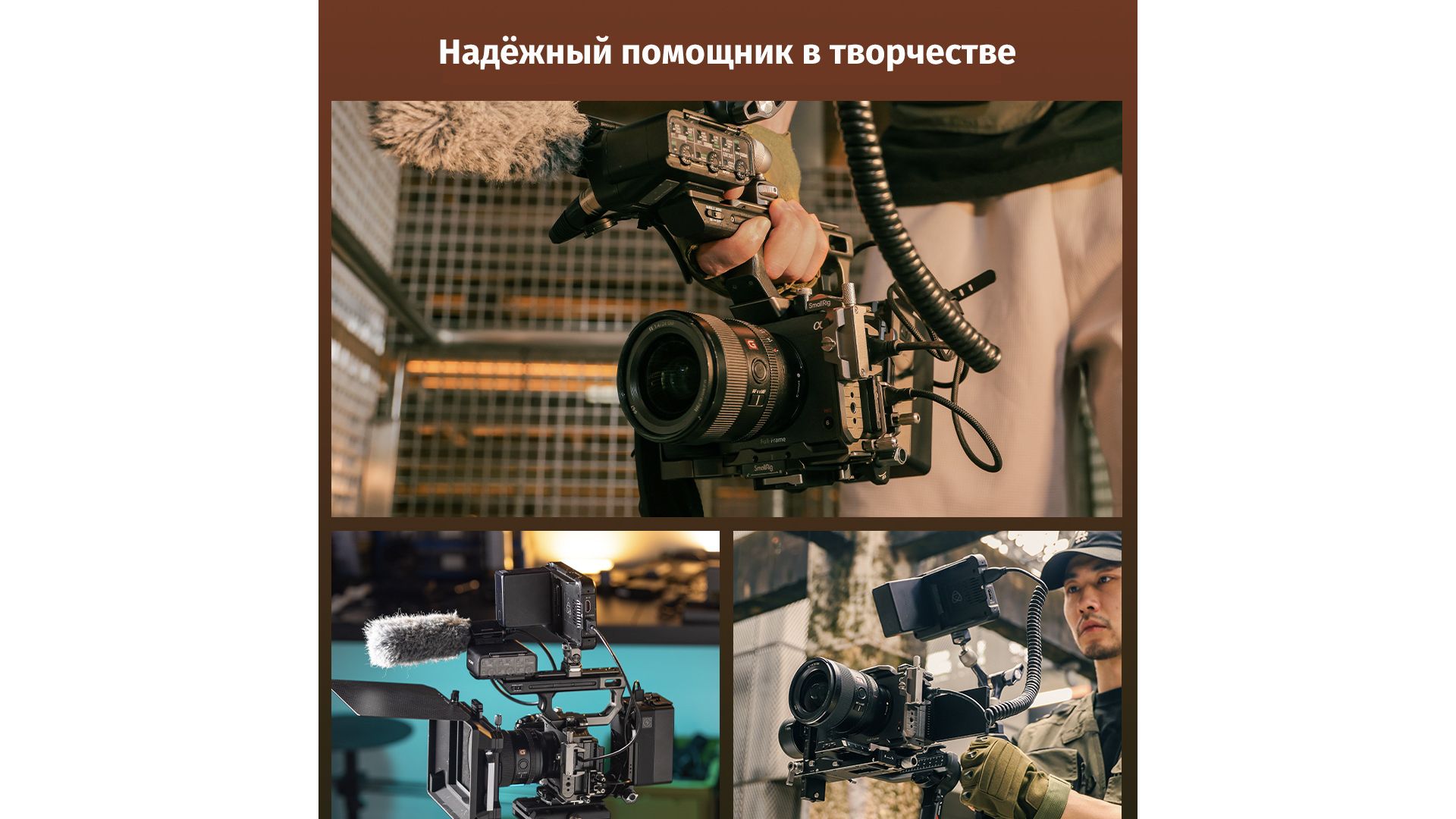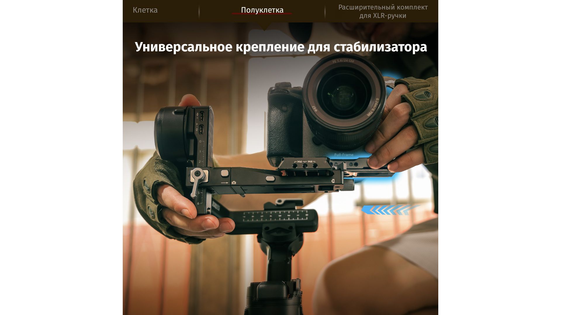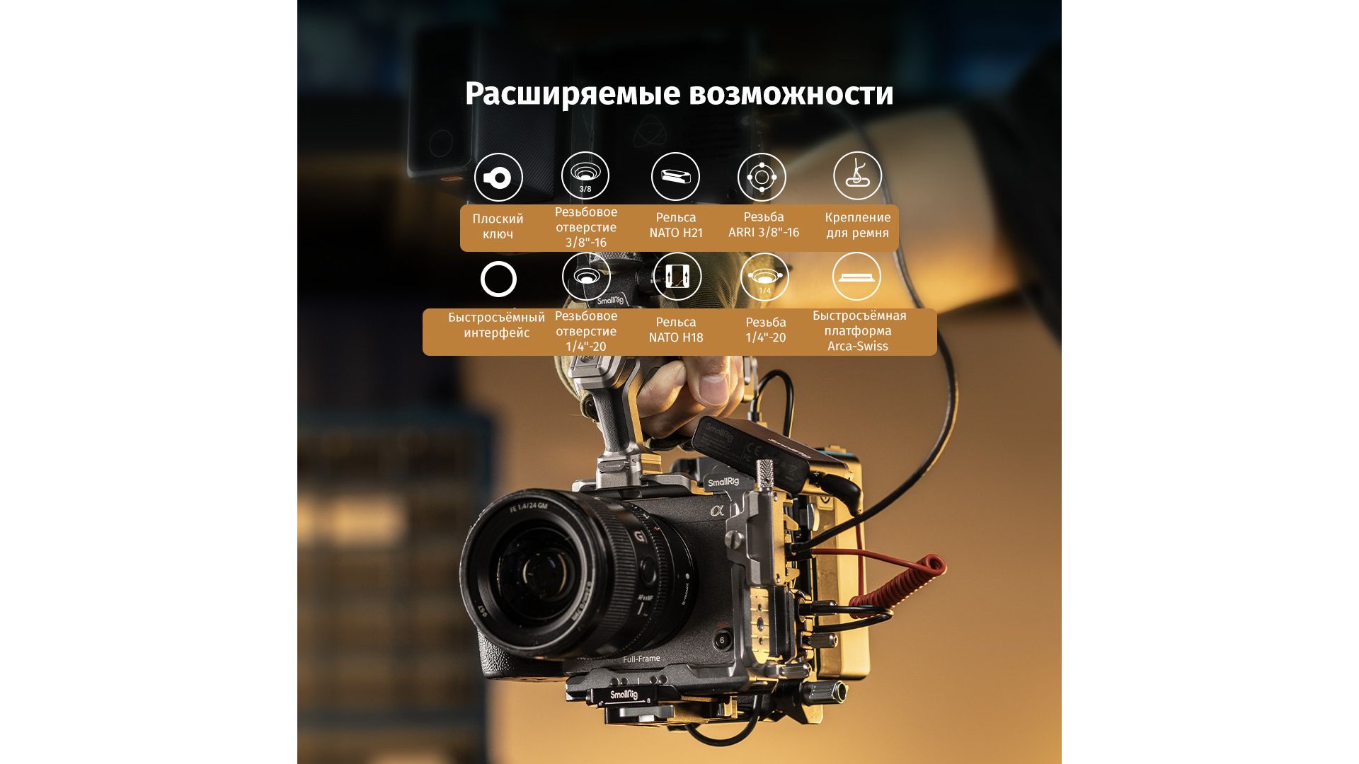 Модульная клетка с системой HawkLock для быстрого монтажа аксессуаров без инструментов. Темно-серое анодированное покрытие, съемная рельса NATO под рукоятку Sony XLR с сохранением доступа к разъемам. Интегрирована база Arca-Swiss, резьбы 1/4" и ARRI 3/8" для штативов и стабилизаторов.