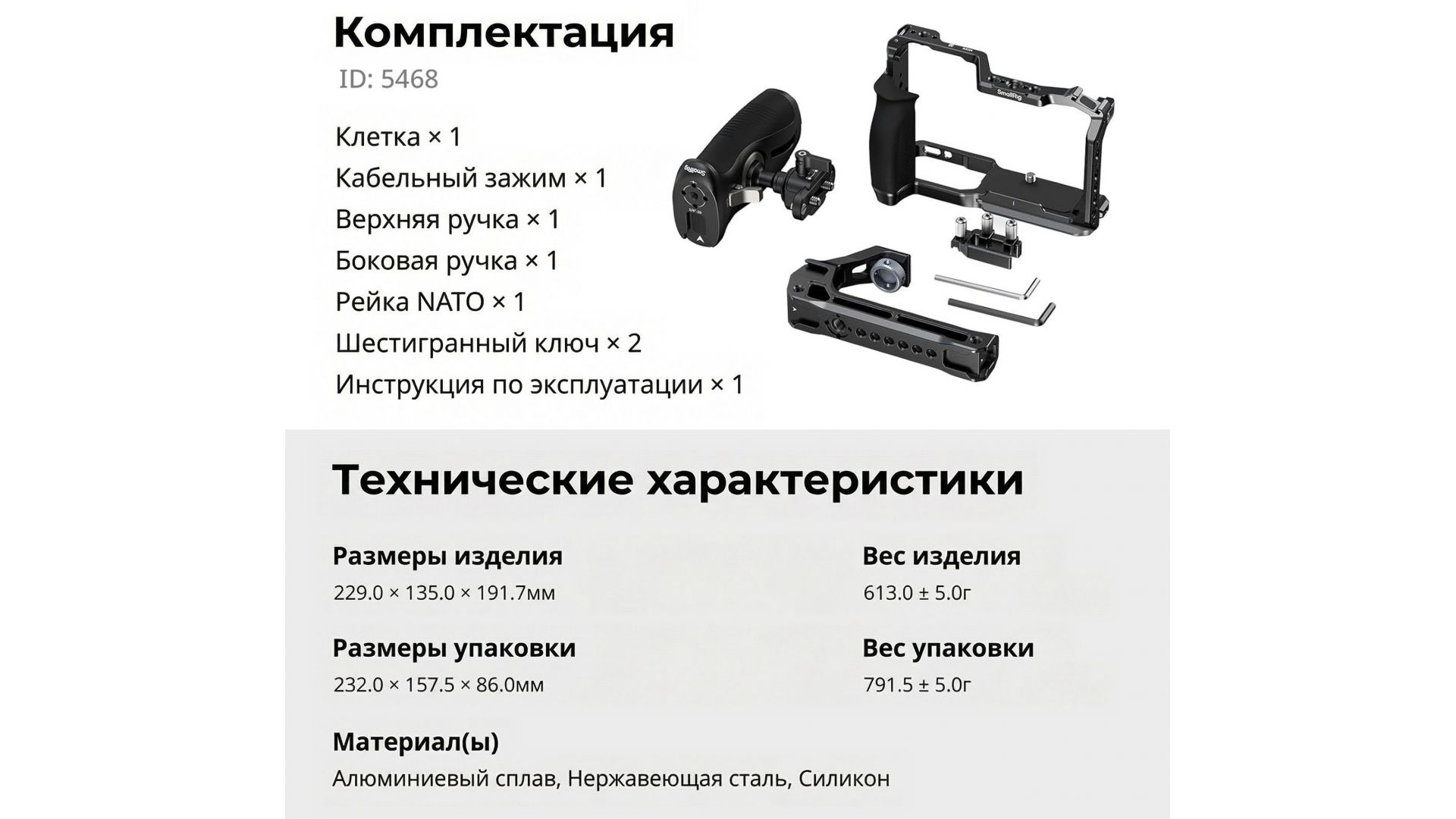 Комплектация:Клетка для Nikon ZR, верхняя ручка, боковая ручка с NATO-креплением, планка NATO, зажим для HDMI и USB-C кабелей, двусторонний ключ, набор шестигранников