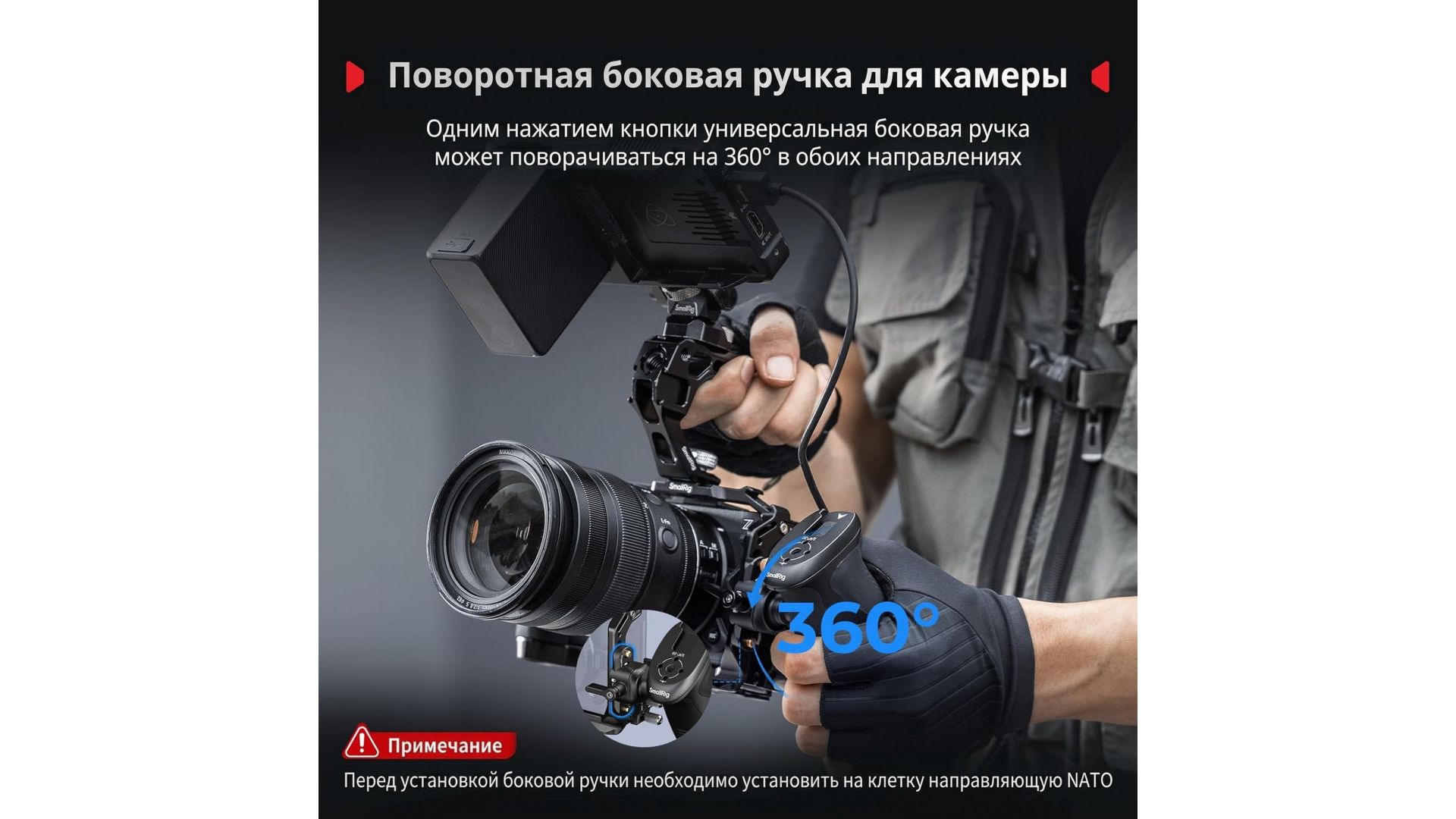 В комплект входят две эргономичные ручки. Верхняя имеет силиконовое покрытие, а боковая вращается на 360°, обеспечивая удобный хват при любых ракурсах. Обе ручки монтируются на NATO-планку для быстрой установки и снятия.