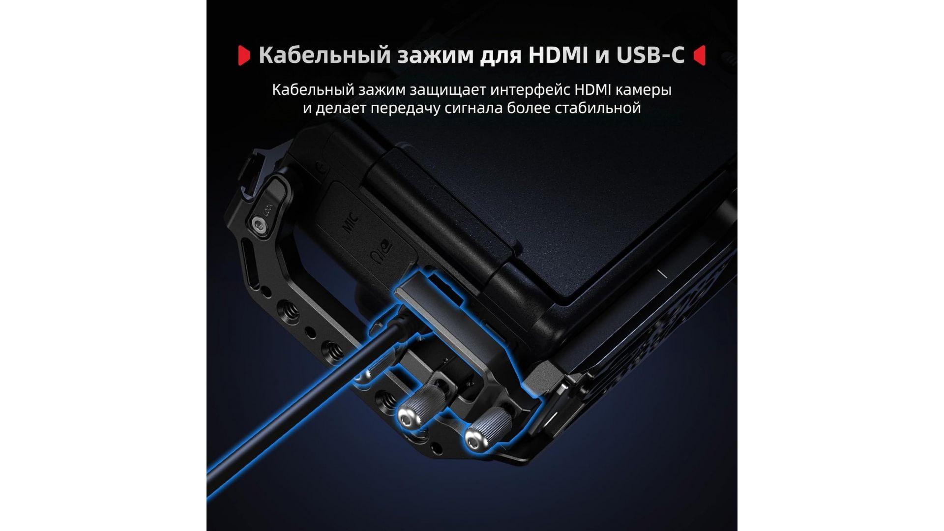 Главная особенность — комплексная защита разъемов: комплектные зажимы фиксируют HDMI и USB-C кабели, предотвращая их случайное отключение и повреждение гнезд камеры во время съемки.