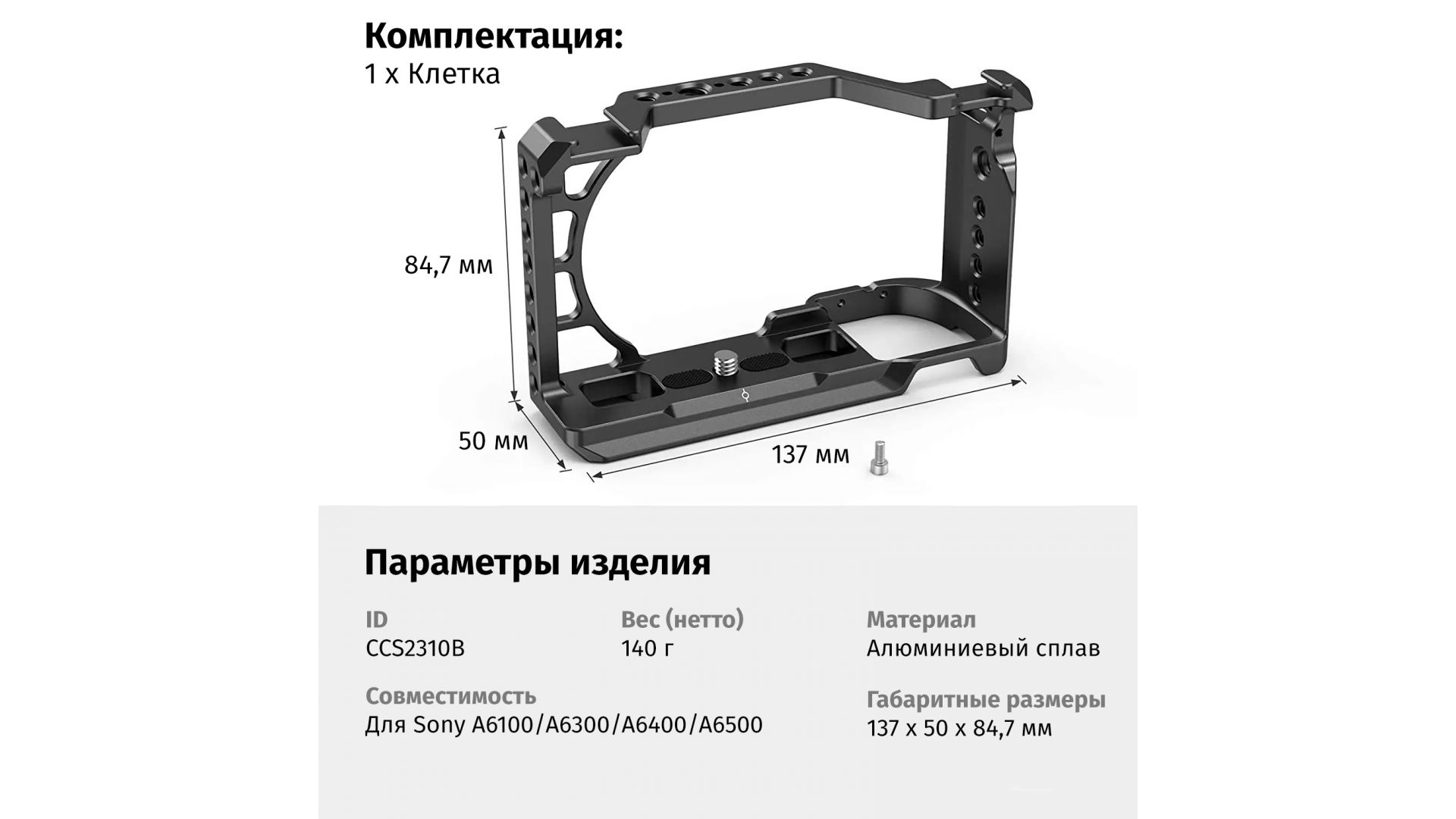 Комплектация:Клетка SmallRig CCS2310C, упаковка
